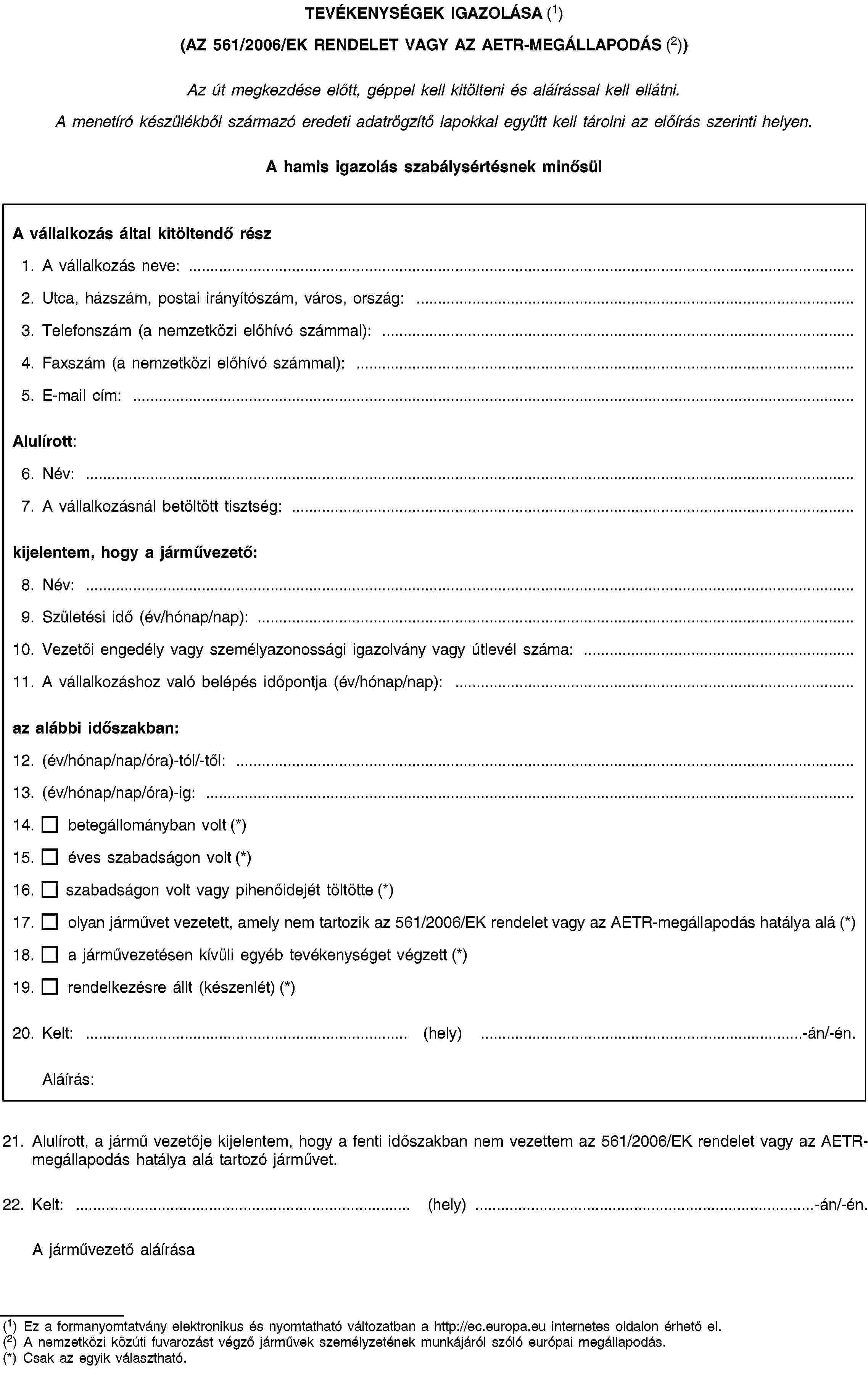 (1) A 2006/22/EK irányelv alapján a Bizottság egy elektronikus és nyomtatható formanyomtatványt készít arra az esetre, ha a járművezető betegállományban volt vagy éves szabadságát töltötte, vagy ha olyan másik járművet vezetett, amely mentesült a 3821/85/EGK és 2135/98/EK tanácsi rendelet által módosított és a 3820/85/EGK tanácsi rendelettel hatályon kívül helyezett, a közúti szállításra vonatkozó egyes szociális jogszabályok összehangolásáról szóló, 2006. március 15-i 561/2006/EK európai parlamenti és tanácsi rendelet ( 2 ) hatálya alól.
