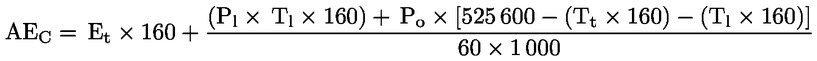 ii. Önálló energiagazdálkodási funkcióval ellátott háztartási szárítógép esetén, amikor a háztartási szárítógép a program befejezése után automatikusan kikapcsolt üzemmódra vált, az AEC súlyozott éves energiafogyasztás értékét a bekapcsolva hagyott üzemmód tényleges időtartamának figyelembevételével, a következő összefüggés segítségével kell meghatározni: