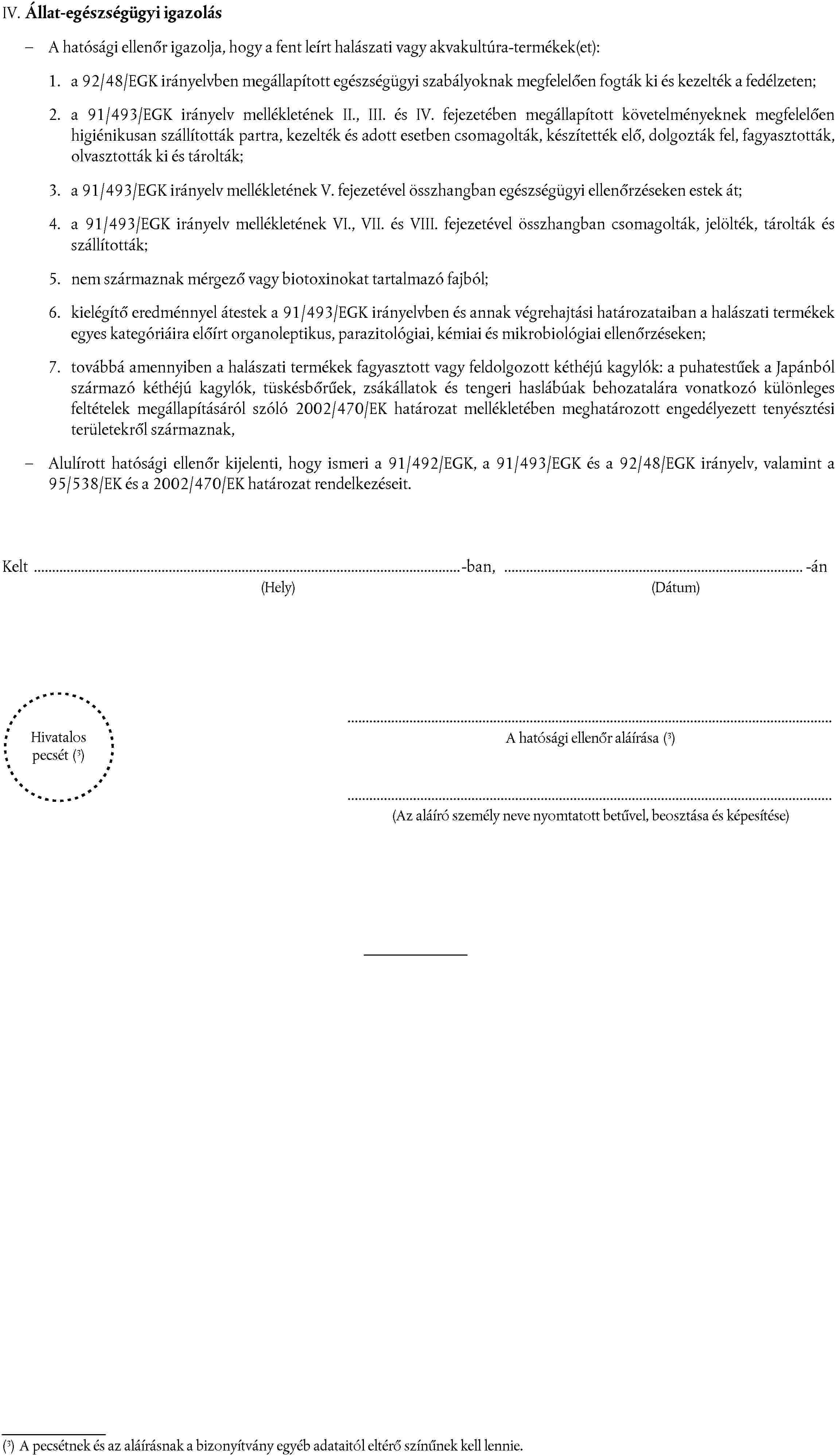 mivel a 91/493/EGK irányelv 11. cikke (4) bekezdésének a) pontjában említett egészségügyi bizonyítvány megszerzésére vonatkozó eljárásnak ki kell terjednie egy bizonyítványminta meghatározására, a kiállítás nyelvére (nyelveire) vonatkozó minimumkövetelményekre, valamint a bizonyítvány aláírására jogosult személy beosztására;