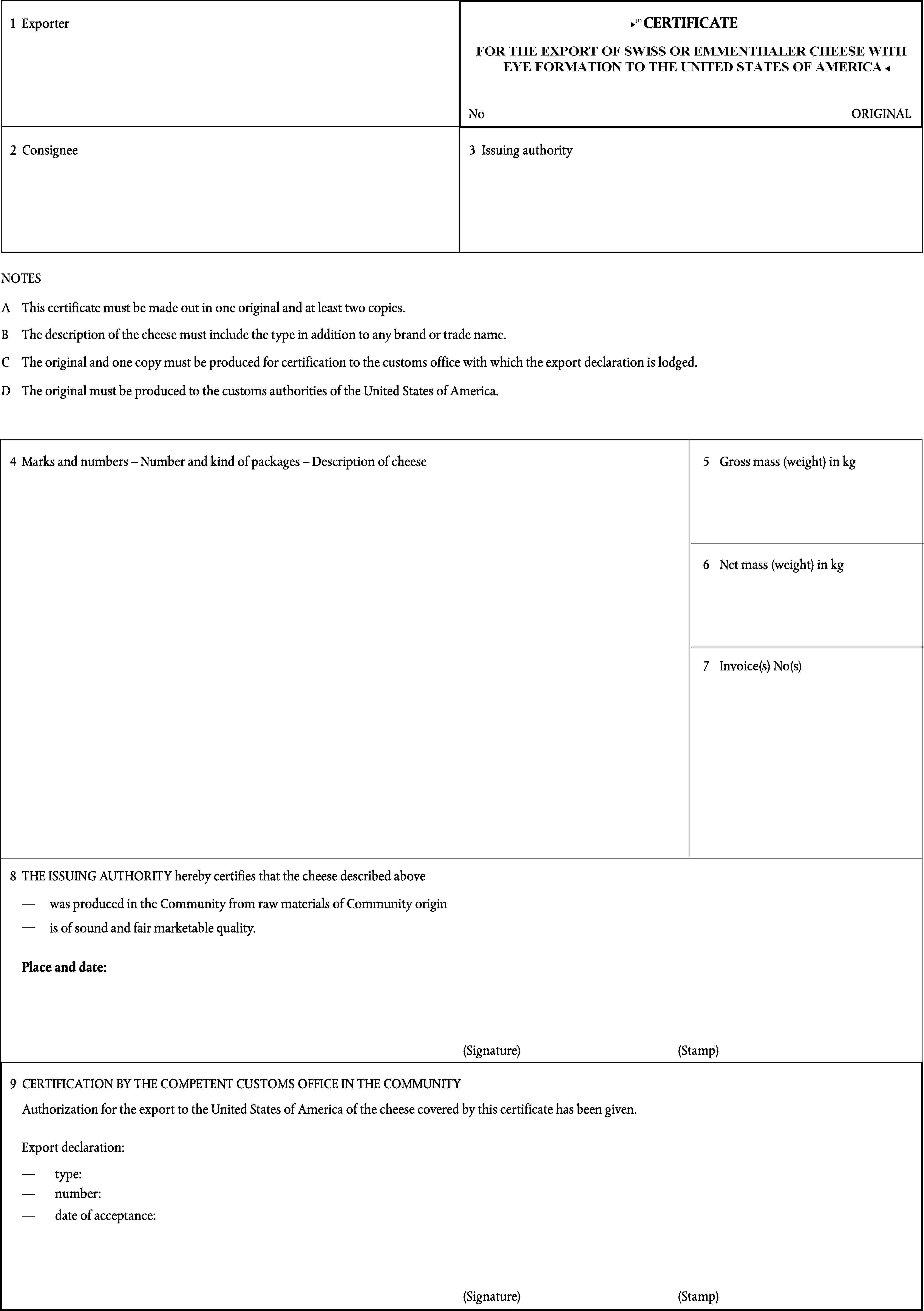 Az I. mellékletben felsorolt, a Tariff Schedule of the United States 117.60.25 alszáma alá tartozó, kontingenskorlátozás hatálya alá eső sajtoknak az Amerikai Egyesült Államokba (beleértve Puerto Rico-t és Hawaii-t) történő kivitele esetén az exportáló tagállam illetékes hatósága az exportőr kérésére a II. mellékletben lévő mintával megegyező igazolást állít ki.