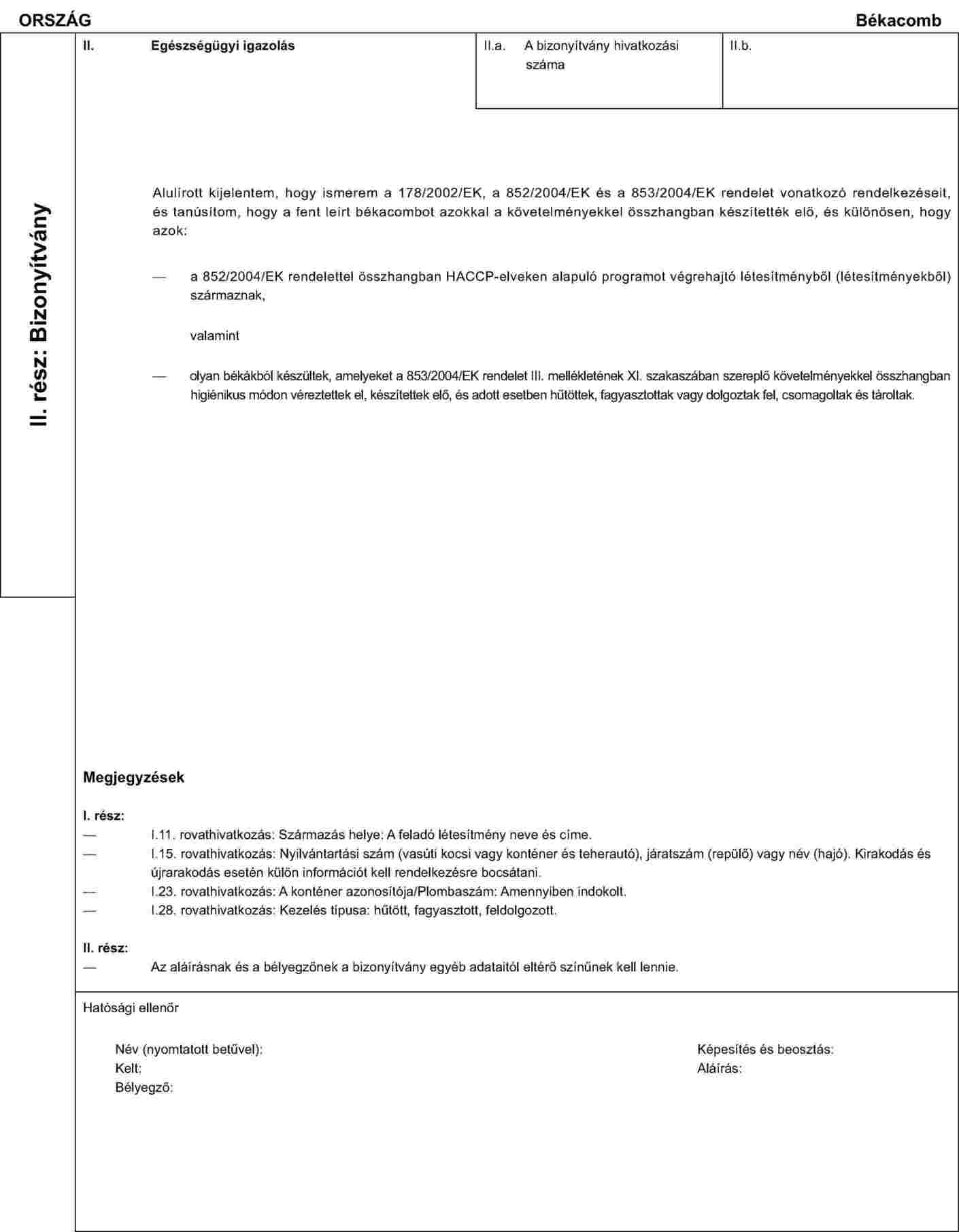 AZ EMBERI FOGYASZTÁSRA SZÁNT, HŰTÖTT, FAGYASZTOTT VAGY ELŐKÉSZÍTETT BÉKACOMB BEHOZATALÁRA VONATKOZÓ EGÉSZSÉGÜGYI BIZONYÍTVÁNYMINTA