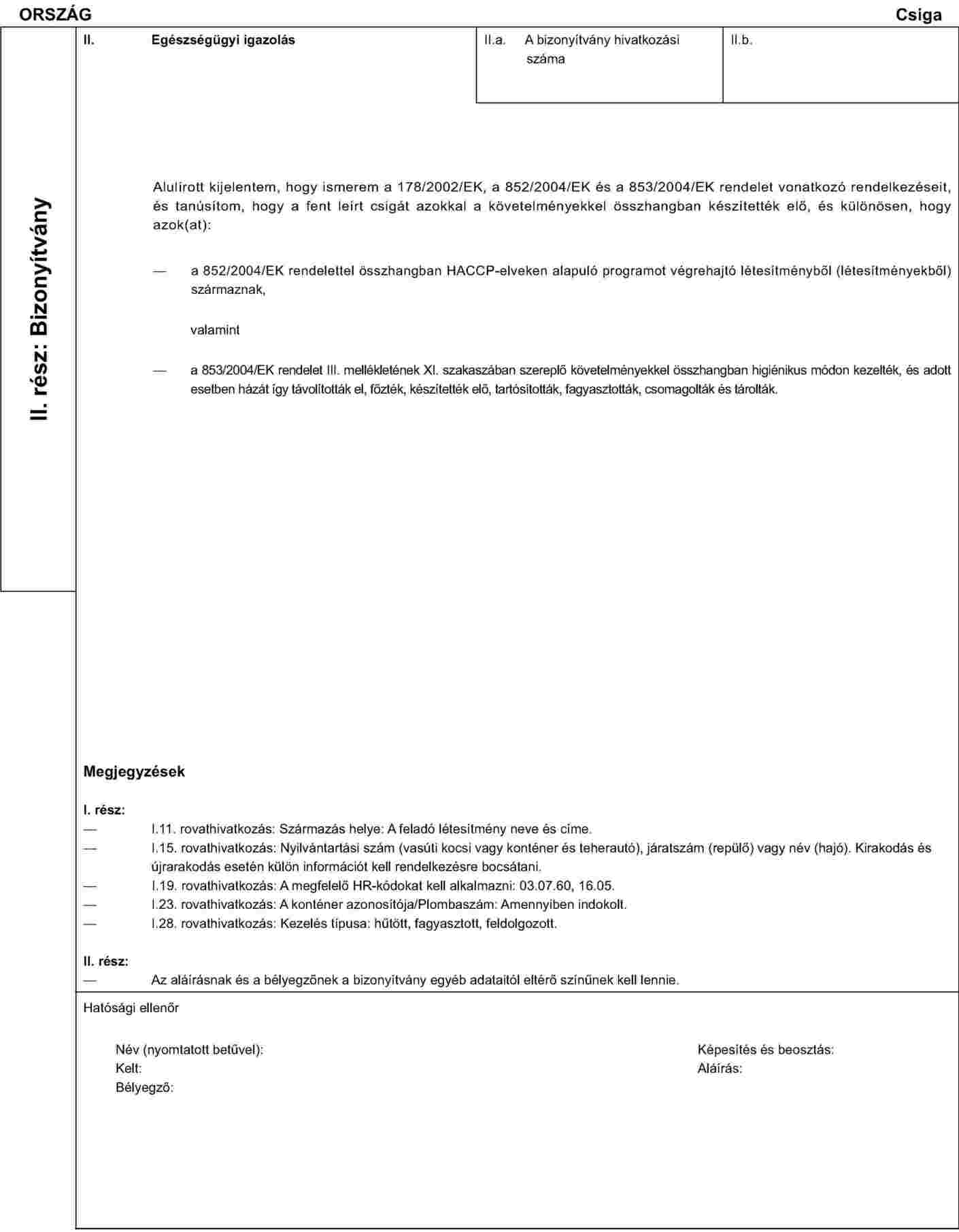 AZ EMBERI FOGYASZTÁSRA SZÁNT, HŰTÖTT, FAGYASZTOTT, HÁZÁTÓL MEGFOSZTOTT, FŐTT, ELŐKÉSZÍTETT VAGY TARTÓSÍTOTT CSIGA BEHOZATALÁRA VONATKOZÓ EGÉSZSÉGÜGYI BIZONYÍTVÁNYMINTA