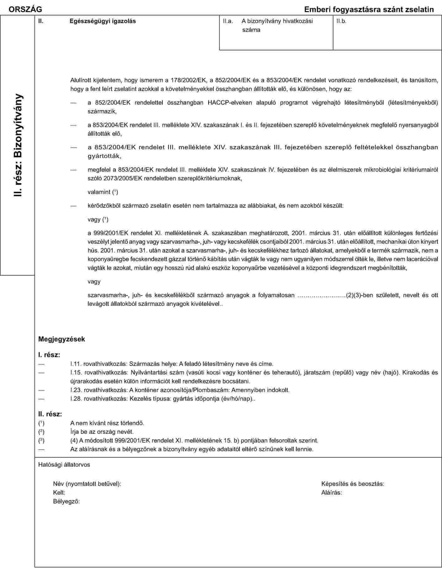 Más különös közösségi jogszabályok - különösen a fertőző szivacsos agyvelőbántalmakról és hormonokról szóló jogszabályok - sérelme nélkül, a 853/2004/EK rendelet 6. cikke (1) bekezdésének d) pontjában említett, a zselatin és a zselatin előállításához szükséges nyersanyagok behozatalára vonatkozó egészségügyi bizonyítványok megfelelnek az e melléklet II. függelékének A., illetve B. részében megállapított mintáknak.
