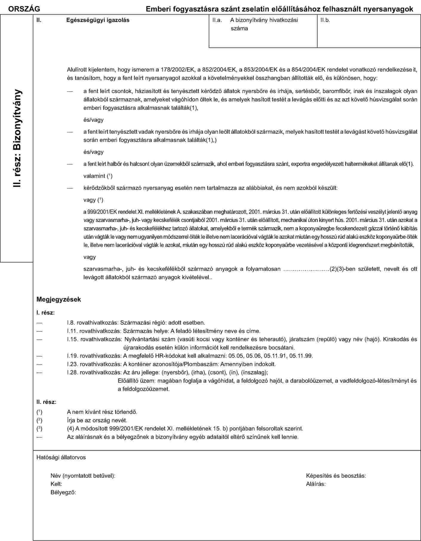 AZ EMBERI FOGYASZTÁSRA SZÁNT ZSELATIN ELŐÁLLÍTÁSÁHOZ SZÜKSÉGES NYERSANYAGOK BEHOZATALÁRA VONATKOZÓ EGÉSZSÉGÜGYI BIZONYÍTVÁNYMINTA