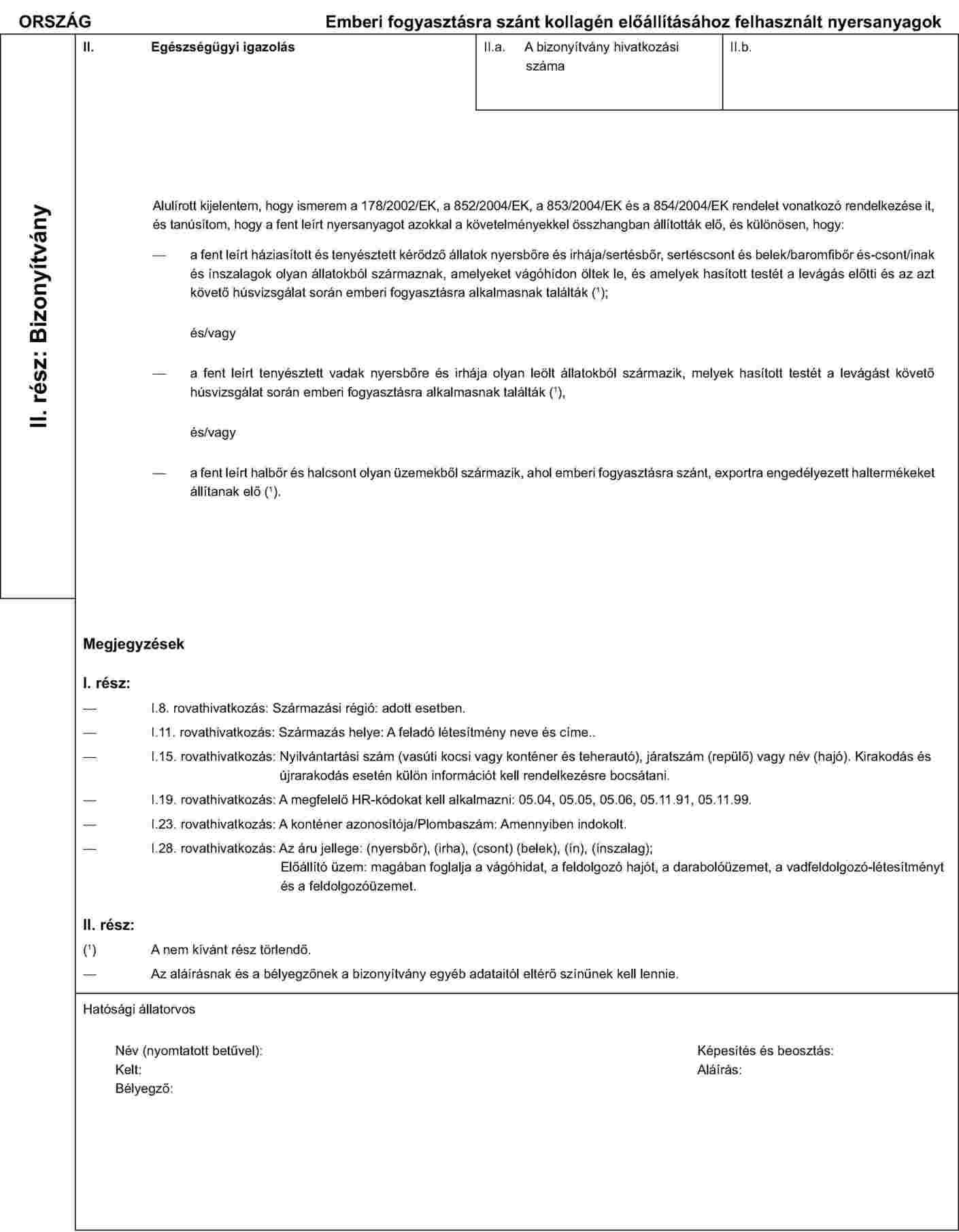 AZ EMBERI FOGYASZTÁSRA SZÁNT KOLLAGÉN ELŐÁLLÍTÁSÁHOZ SZÜKSÉGES NYERSANYAGOK BEHOZATALÁRA VONATKOZÓ EGÉSZSÉGÜGYI BIZONYÍTVÁNYMINTA