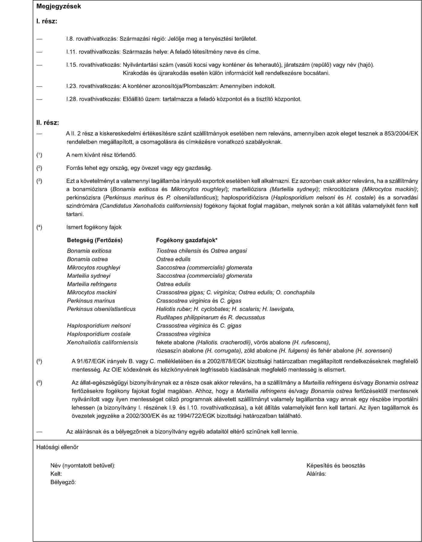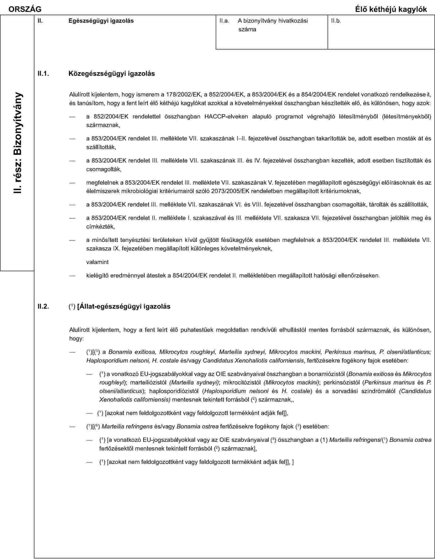 AZ EMBERI FOGYASZTÁSRA SZÁNT ÉLŐ KÉTHÉJÚ KAGYLÓK BEHOZATALÁRA VONATKOZÓ EGÉSZSÉGÜGYI BIZONYÍTVÁNYMINTA