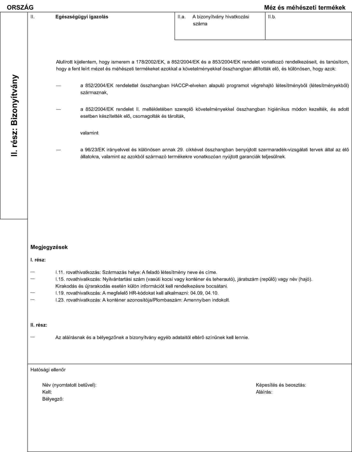 A 853/2004/EK rendelet 6. cikke (1) bekezdésének d) pontjában említett, a méz és méhészeti termékek behozatalára vonatkozó egészségügyi bizonyítvány megfelel az e melléklet VI. függelékében meghatározott mintának.