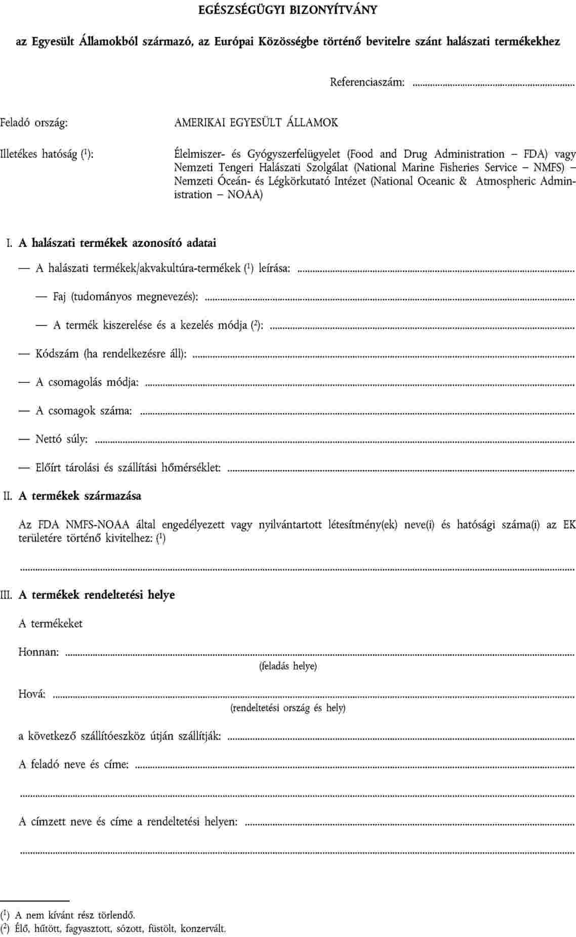 Az Élelmiszer- és Gyógyszerfelügyelet (Food and Drug Administration - FDA) és a Nemzeti Tengeri Halászati Szolgálat (National Marine Fisheries Service - NMFS) - Nemzeti Óceán- és Légkörkutató Intézet (National Oceanic & Atmospheric Administration - NOAA) az Amerikai Egyesült Államok (USA) illetékes hatóságai, amelyek annak ellenőrzéséért felelősek, hogy a halászati termékek megfelelnek-e a Code of Federal Regulationsben (az Egyesült Államok szövetségi rendeletei kódexében) közzétett vonatkozó közegészségügyi követelményeknek, amelyeknek az Európai Közösség szabványaival való egyenértékűsége ezen alkalmazásban a 98/258/EK tanácsi határozatban előírt módon elismerésre kerül.