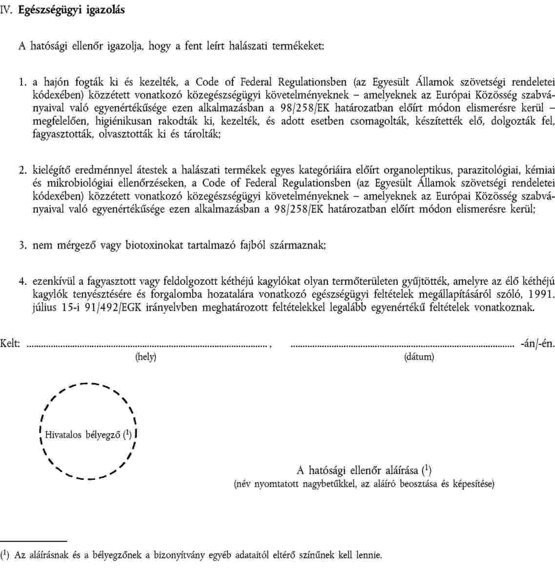(3) Az egészségügyi bizonyítványon fel kell tüntetni az FDA vagy az NMFS-NOAA képviselőjének nevét, beosztását és aláírását, valamint az utóbbi hivatalos pecsétjét, amely színének különböznie kell a többi bejegyzés színétől.