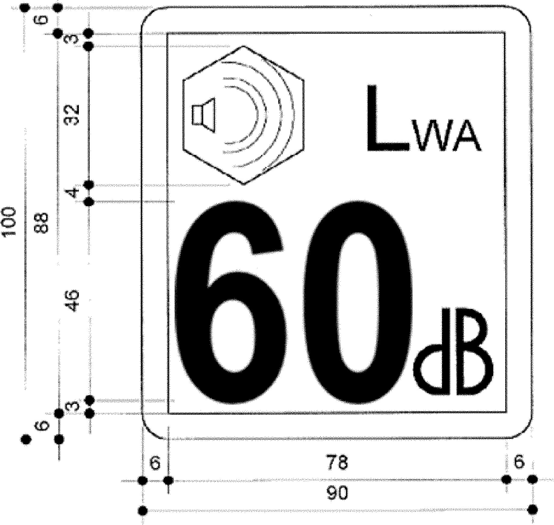 A garantált hangteljesítményszint jelzésének a dB-ben megadott, garantált hangteljesítményszint számjegyeiből, az LWA jelből és a következő formátumú piktogramból kell állnia: