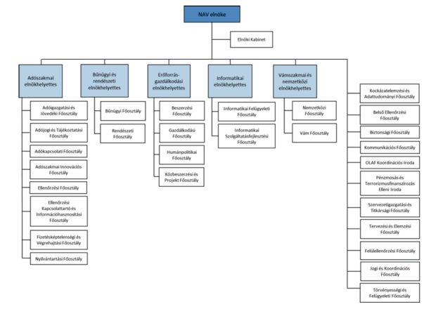 "(1) A NAV elnökhelyettesei: az adószakmai elnökhelyettes, a bűnügyi és rendészeti elnökhelyettes, az erőforrásgazdálkodási elnökhelyettes, az informatikai elnökhelyettes, valamint a vámszakmai és nemzetközi elnökhelyettes, akik felett az irányítási jogkört az elnök gyakorolja."