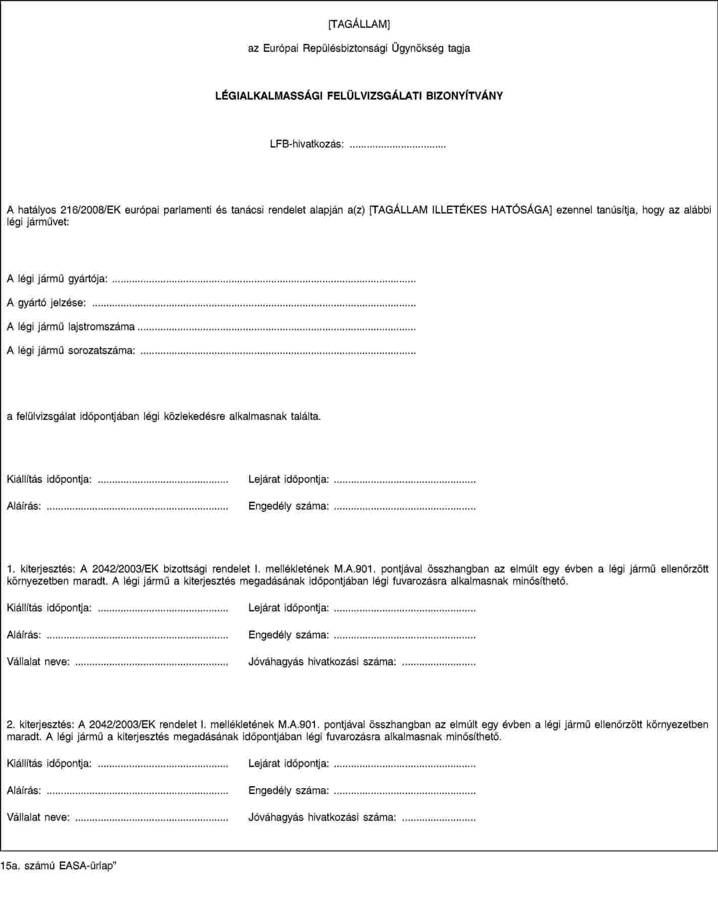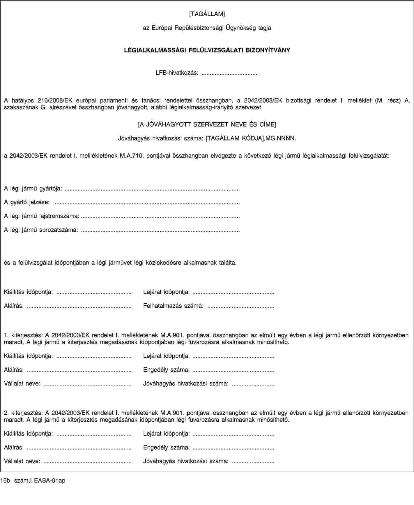 »Tanúsítja, hogy amennyiben e mező nem rendelkezik másként, a 12. mezőben megnevezett és ebben a mezőben részletezett munkát a 2042/2003/EK rendelet I. melléklet (M. rész) A. szakasz F. alrészében szereplő követelményeknek megfelelően végezték el, és e munka tekintetében a tétel üzemkésznek tekinthető. EZ NEM JELENTI A 2042/2003/EK RENDELET II. MELLÉKLETE (145. RÉSZ) SZERINTI ÜZEMBE HELYEZÉST.«