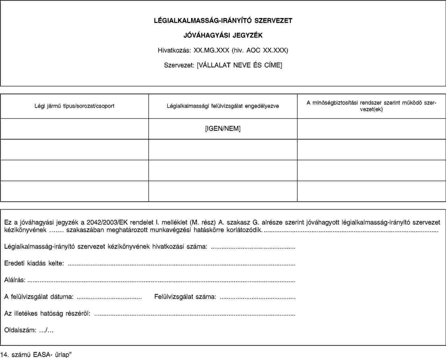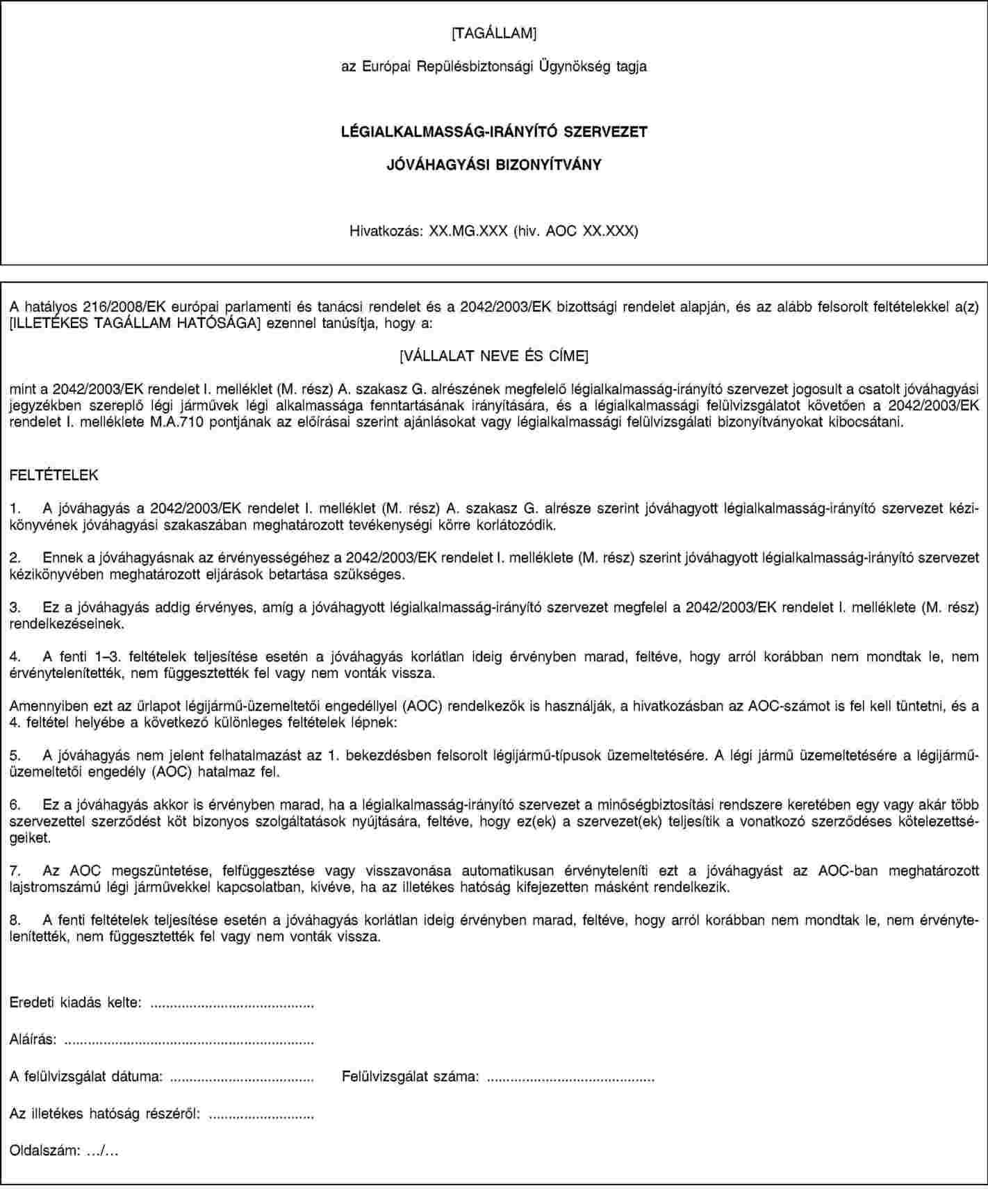 A légialkalmasság-irányító szervezetek számára kiállított, az I. melléklet (M. rész) G. alrészében említett jóváhagyási bizonyítvány