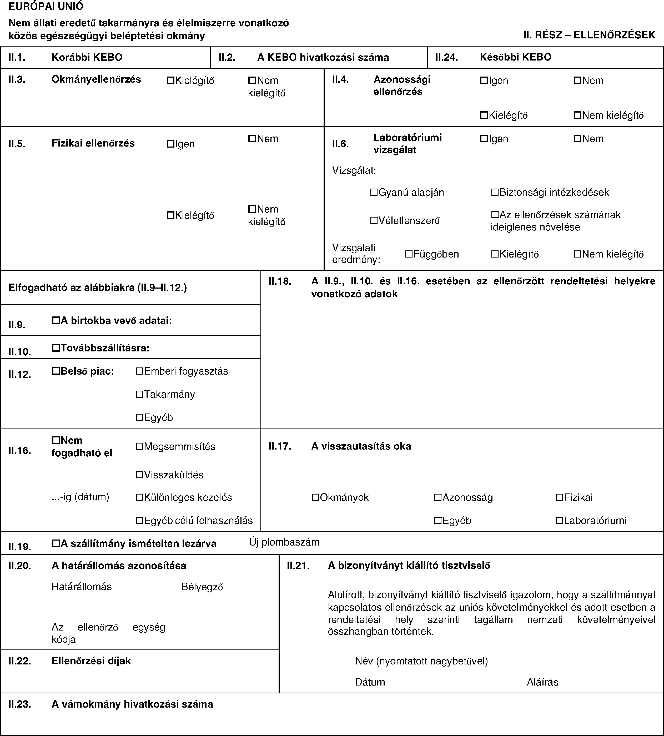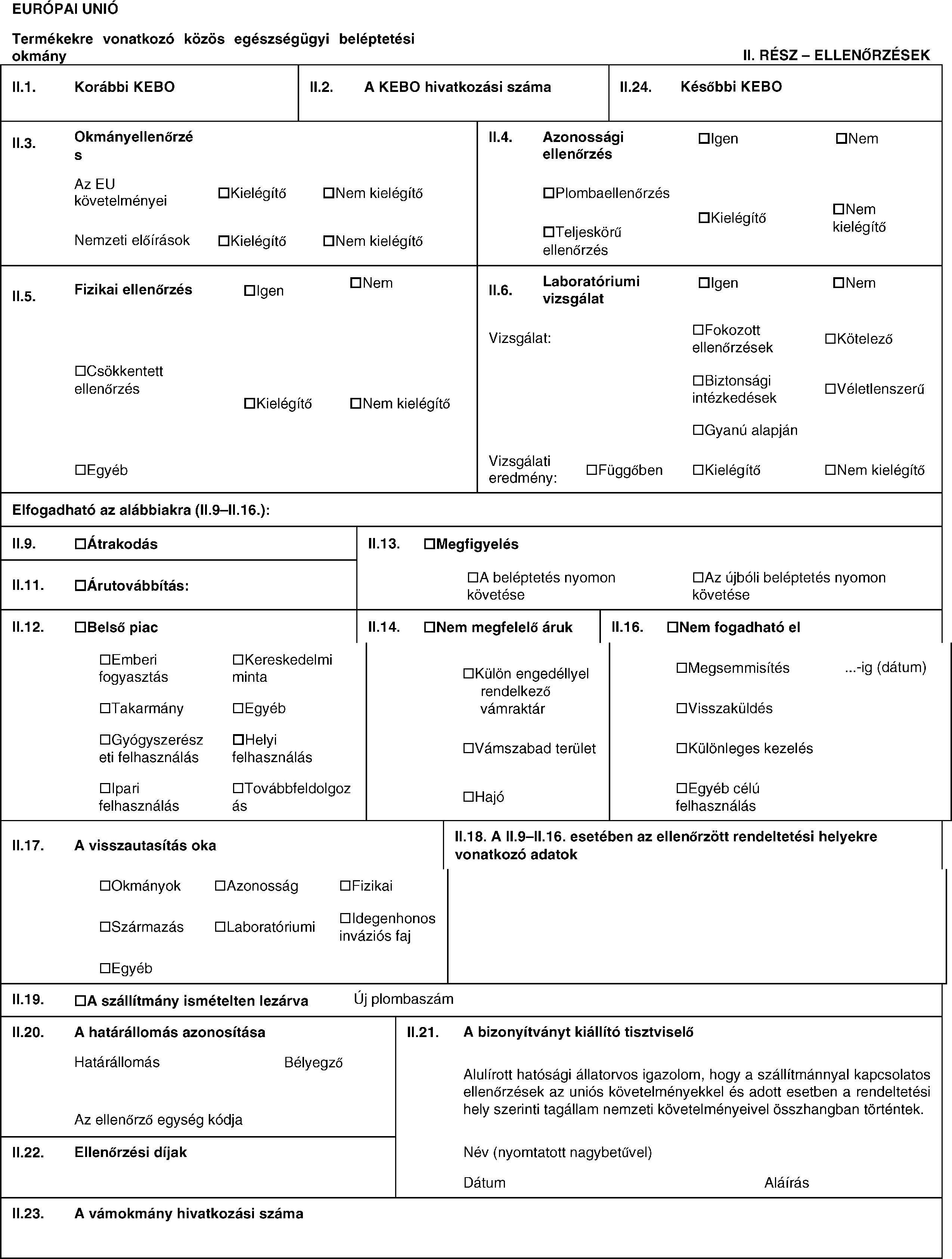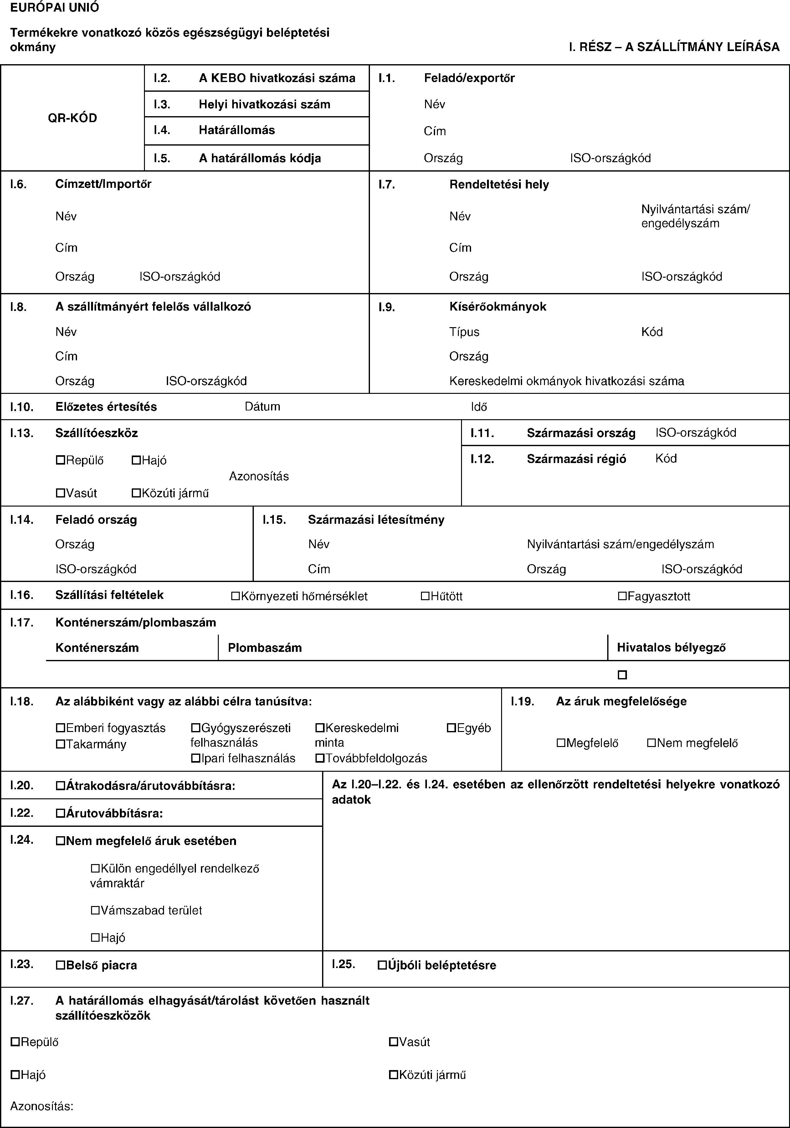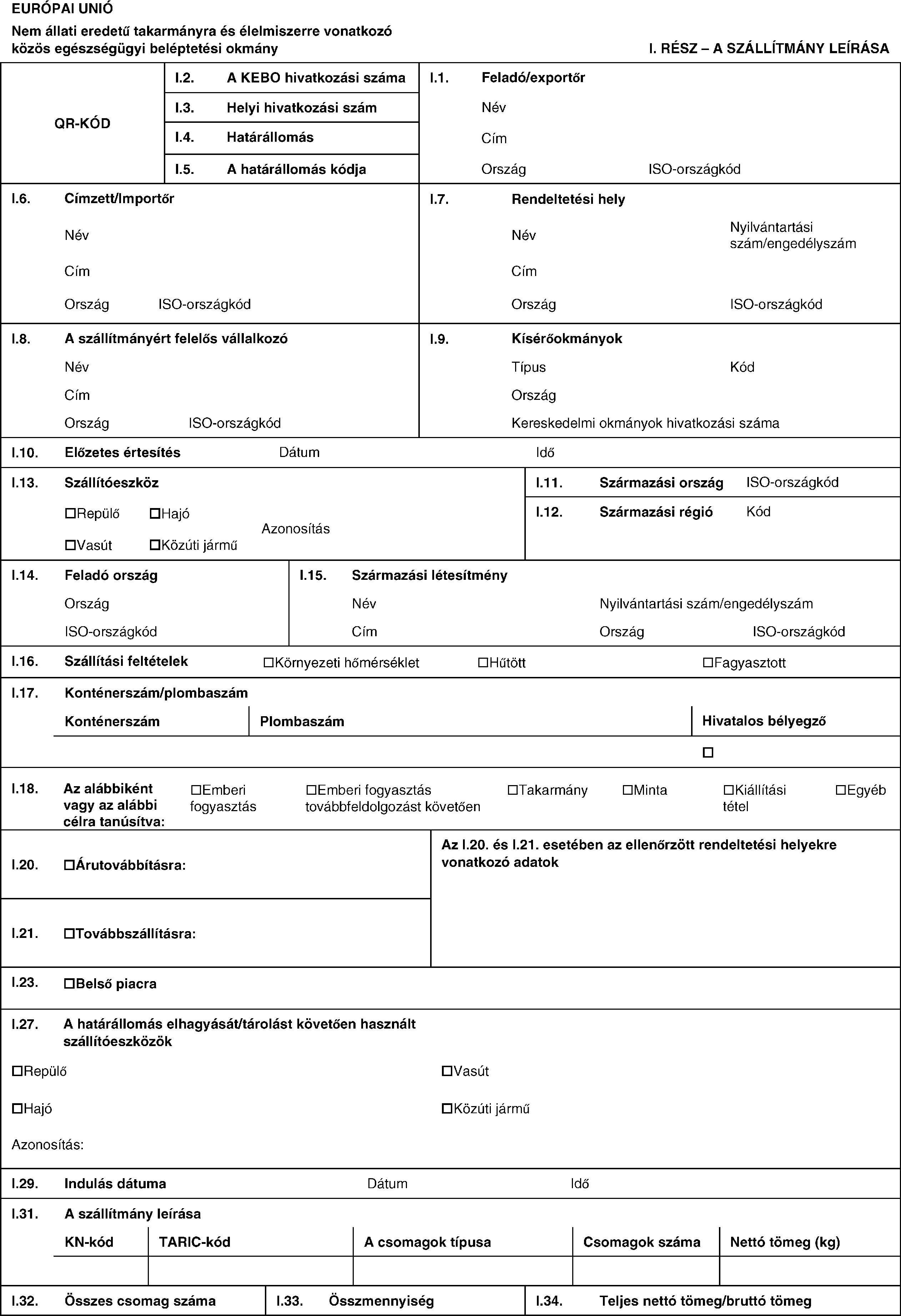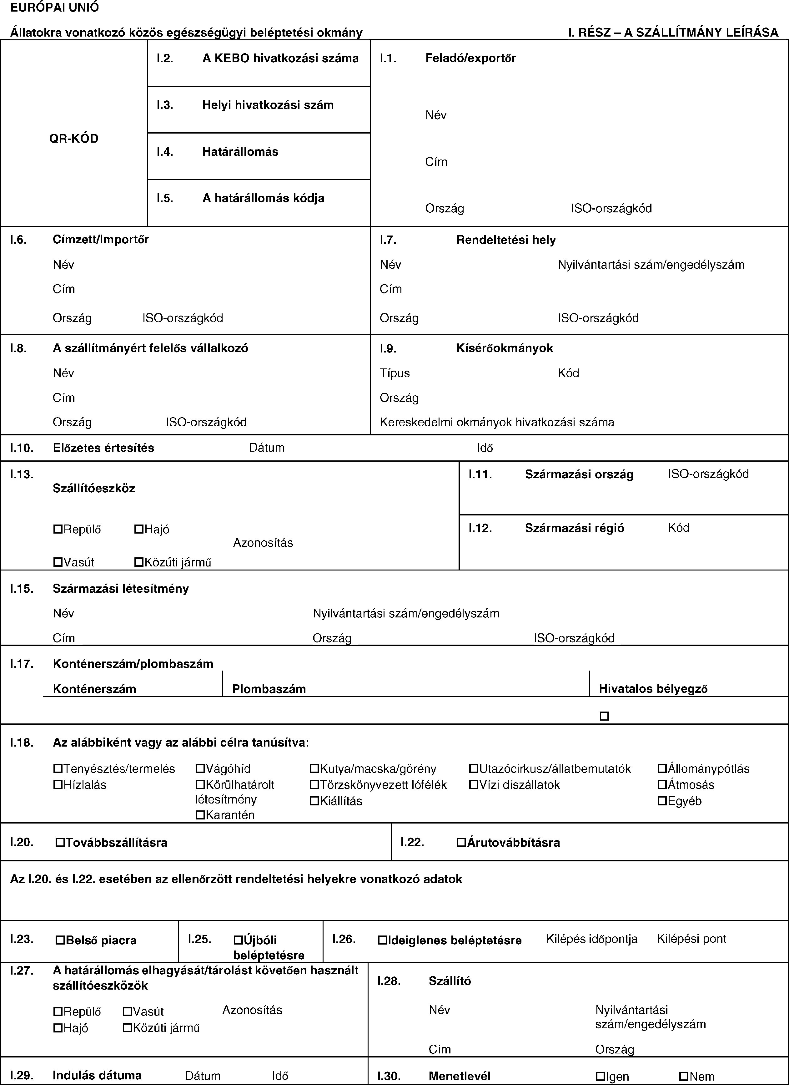 i. az (EU) 2017/625 rendelet 56. cikkében említett közös egészségügyi beléptetési okmány, illetve elektronikus megfelelőjének formátuma, valamint a benyújtására és használatára vonatkozó utasítások;
