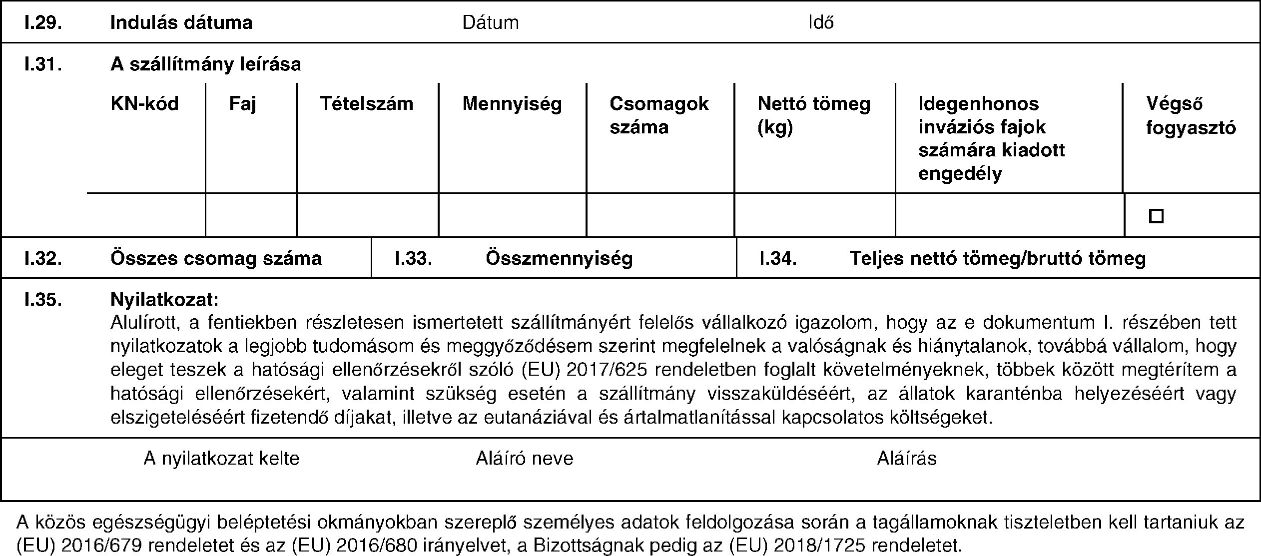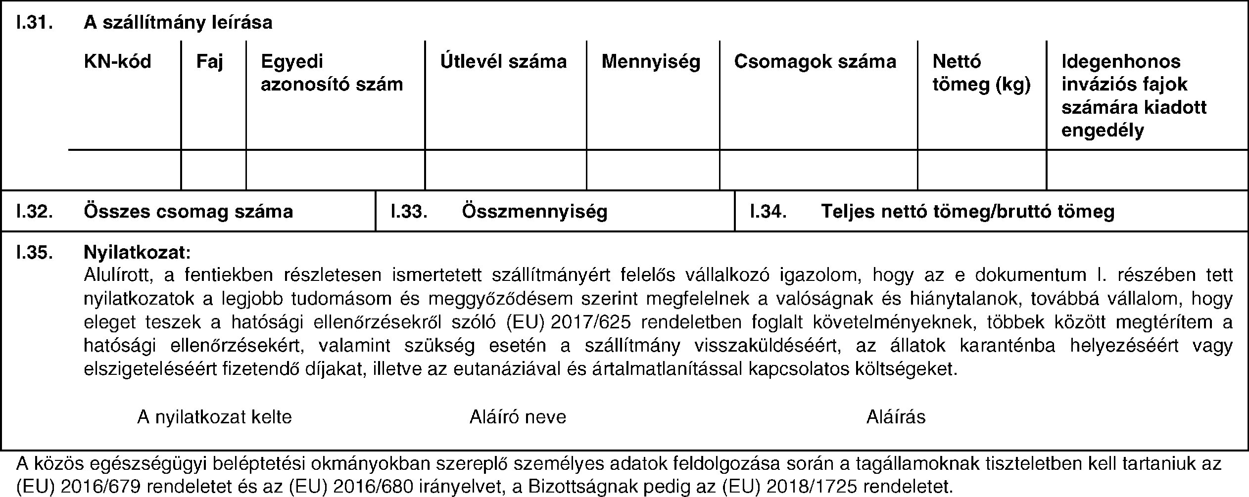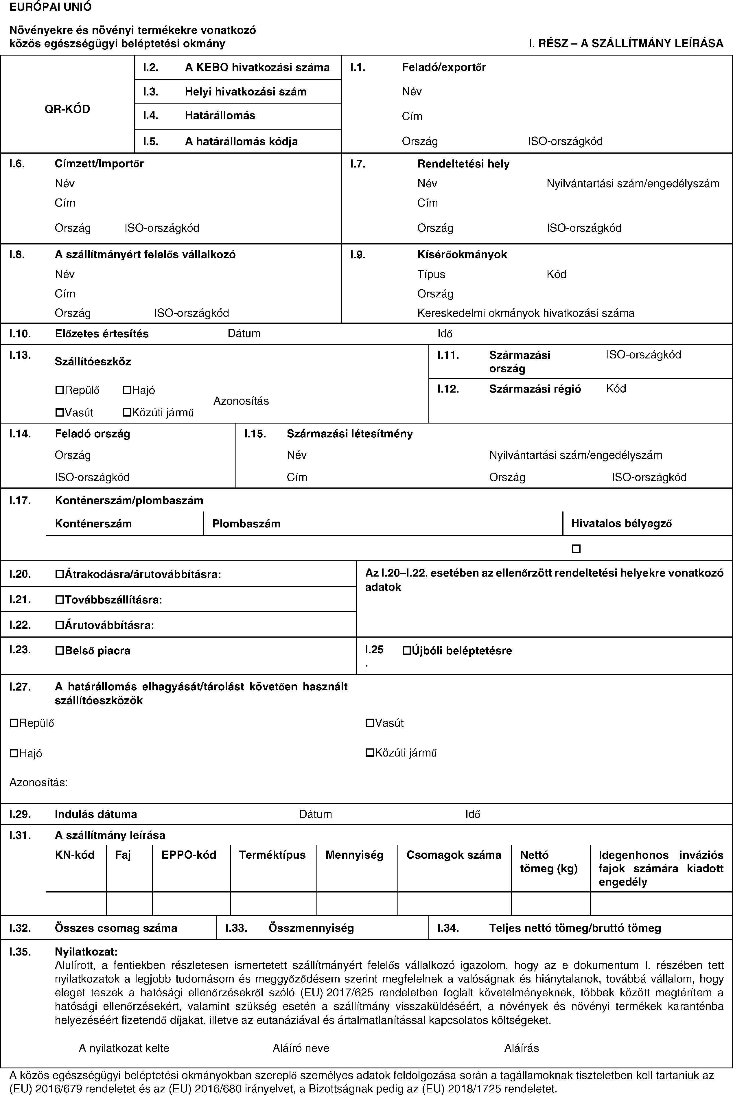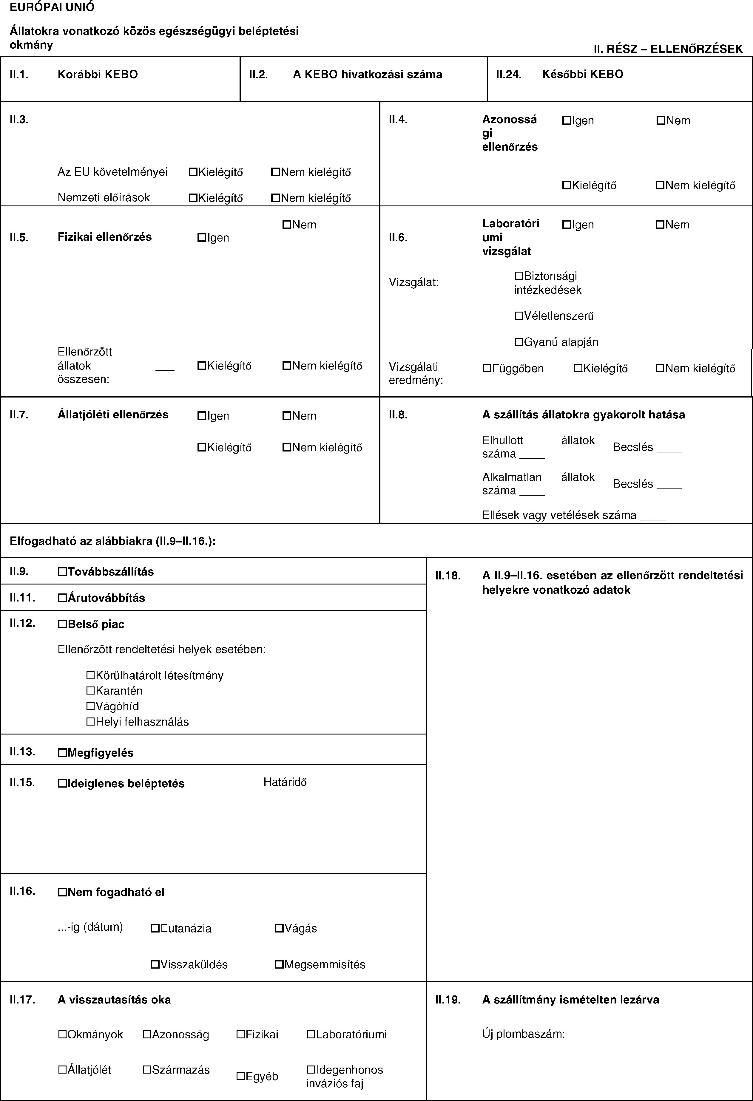i. az (EU) 2017/625 rendelet 56. cikkében említett közös egészségügyi beléptetési okmány, illetve elektronikus megfelelőjének formátuma, valamint a benyújtására és használatára vonatkozó utasítások;