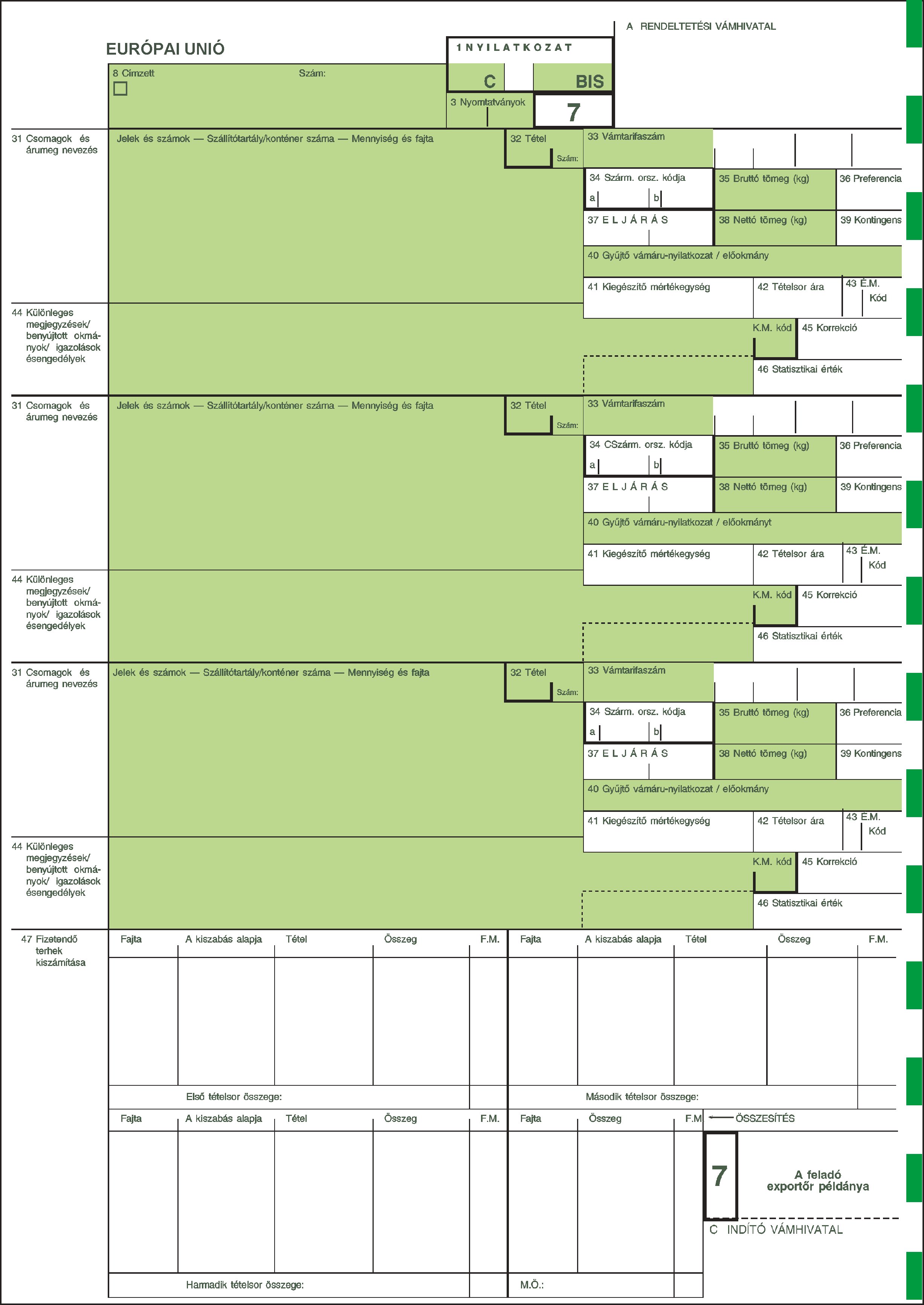 A szabad forgalomba bocsátásra vonatkozó vám-árunyilatkozat(ok) adatai (O) | Ha a szabad forgalomba bocsátásra vonatkozó vám-árunyilatkozat az INF-re hivatkozik, ezt az adatelemet a szabad forgalomba bocsátó vámhivatal adja meg. |