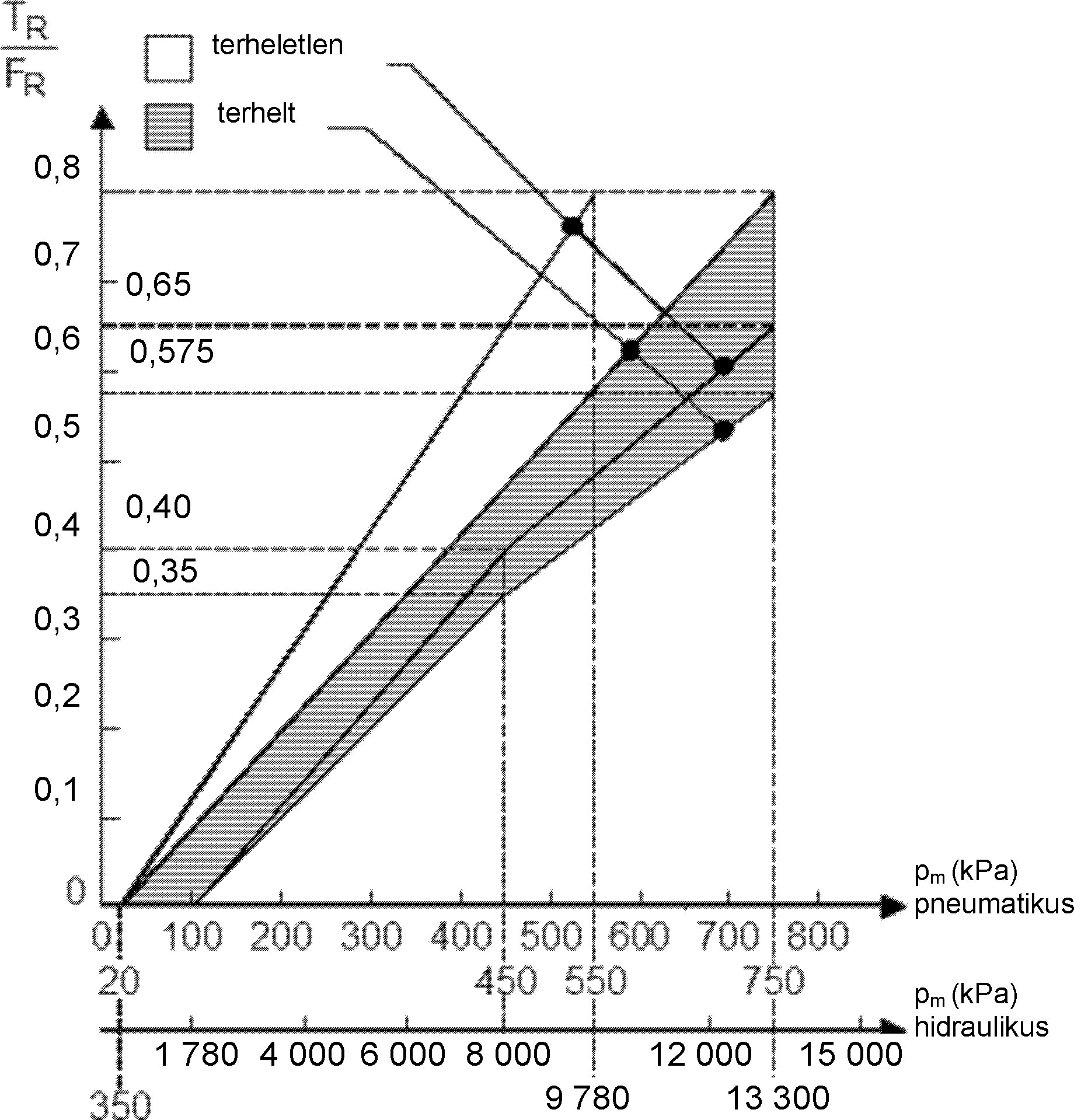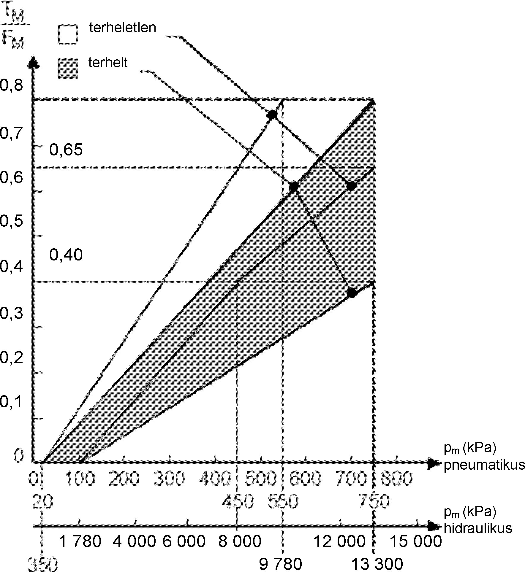 pm = stabilizált hidraulikus nyomás a kapcsolófejnél (kPa).
