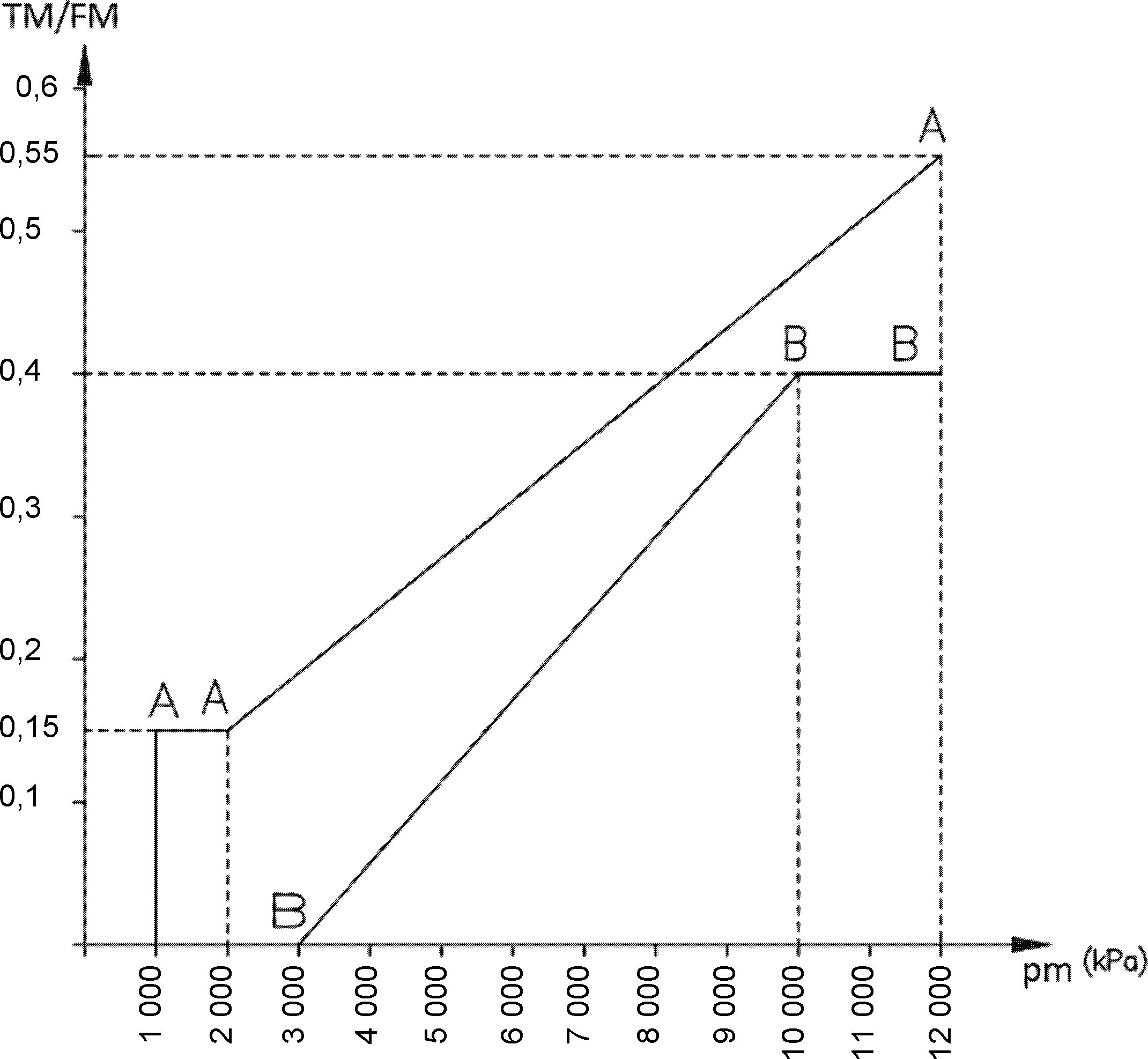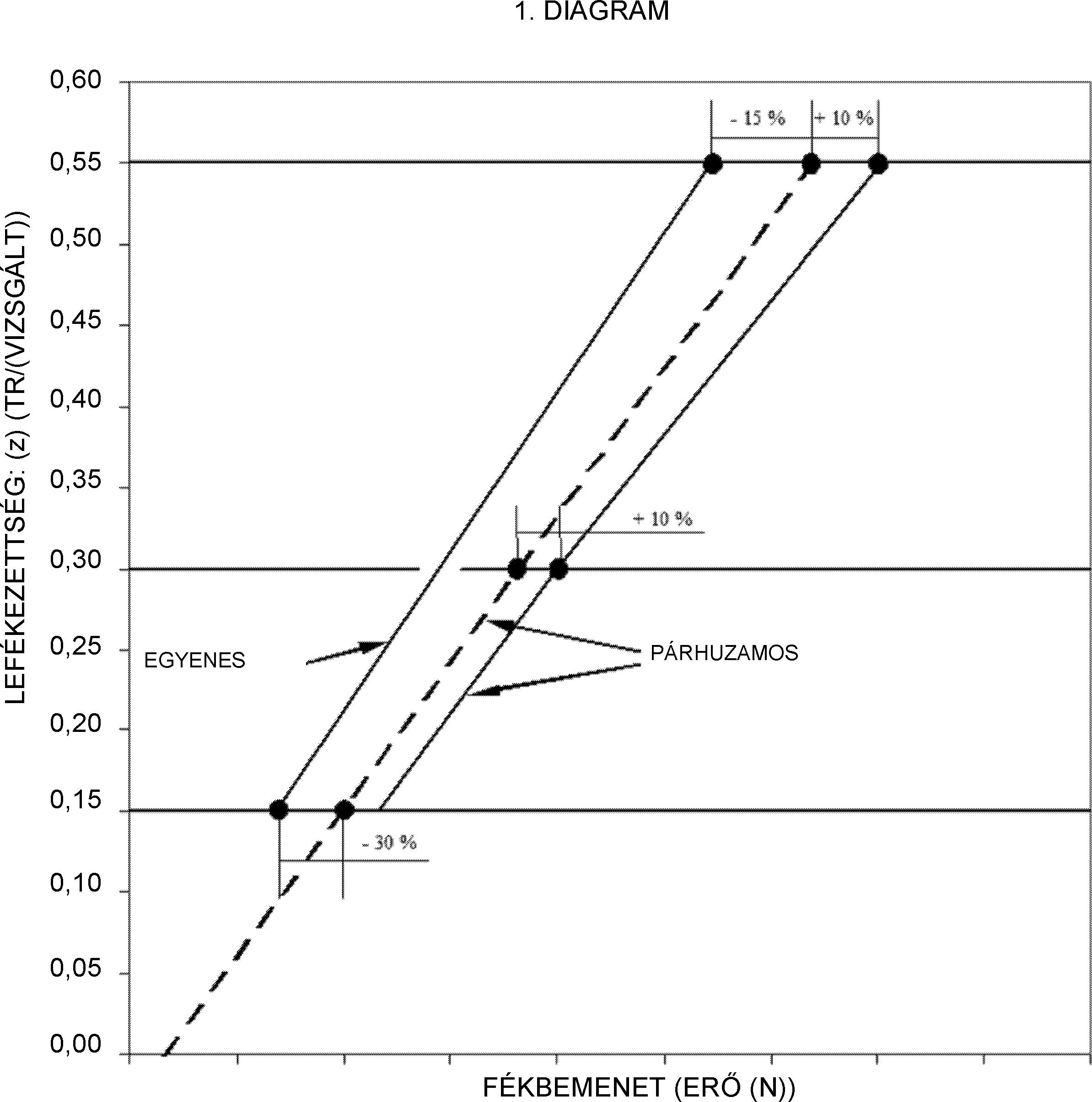 3.4. A TM/FM lefékezettség és a pm kapcsolófej nyomás közötti megengedett viszonynak kisebbnek kell lennie, mint az 1. ábrán szereplő AAA vonal. A követelmény terheletlen járműre érvényes.