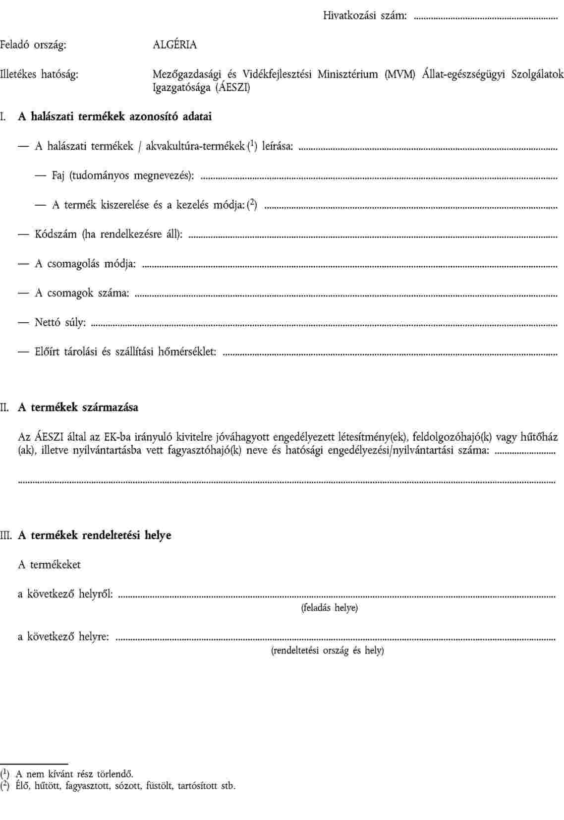 Algériában a "Mezőgazdasági és Vidékfejlesztési Minisztérium (Ministère de l'Agriculture et du Développement Rural, MVM) Állat-egészségügyi Szolgálatok Igazgatósága (Direction des Services Vétérinaires, ÁESZI)" a halászati termékeknek a 91/493/EGK irányelvben foglalt követelményekkel szembeni megfelelése ellenőrzésére és igazolására kijelölt illetékes hatóság.