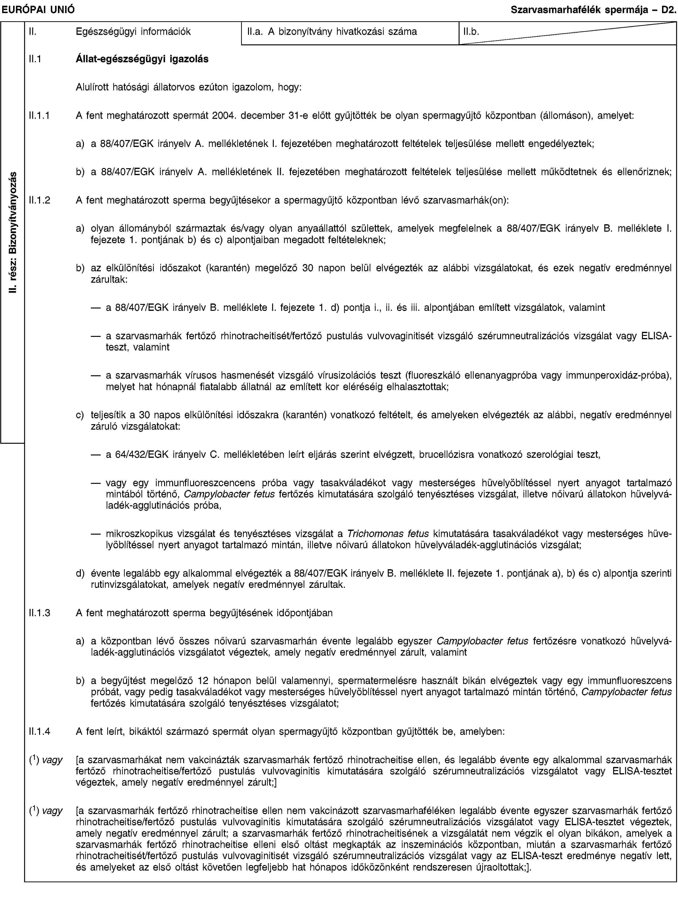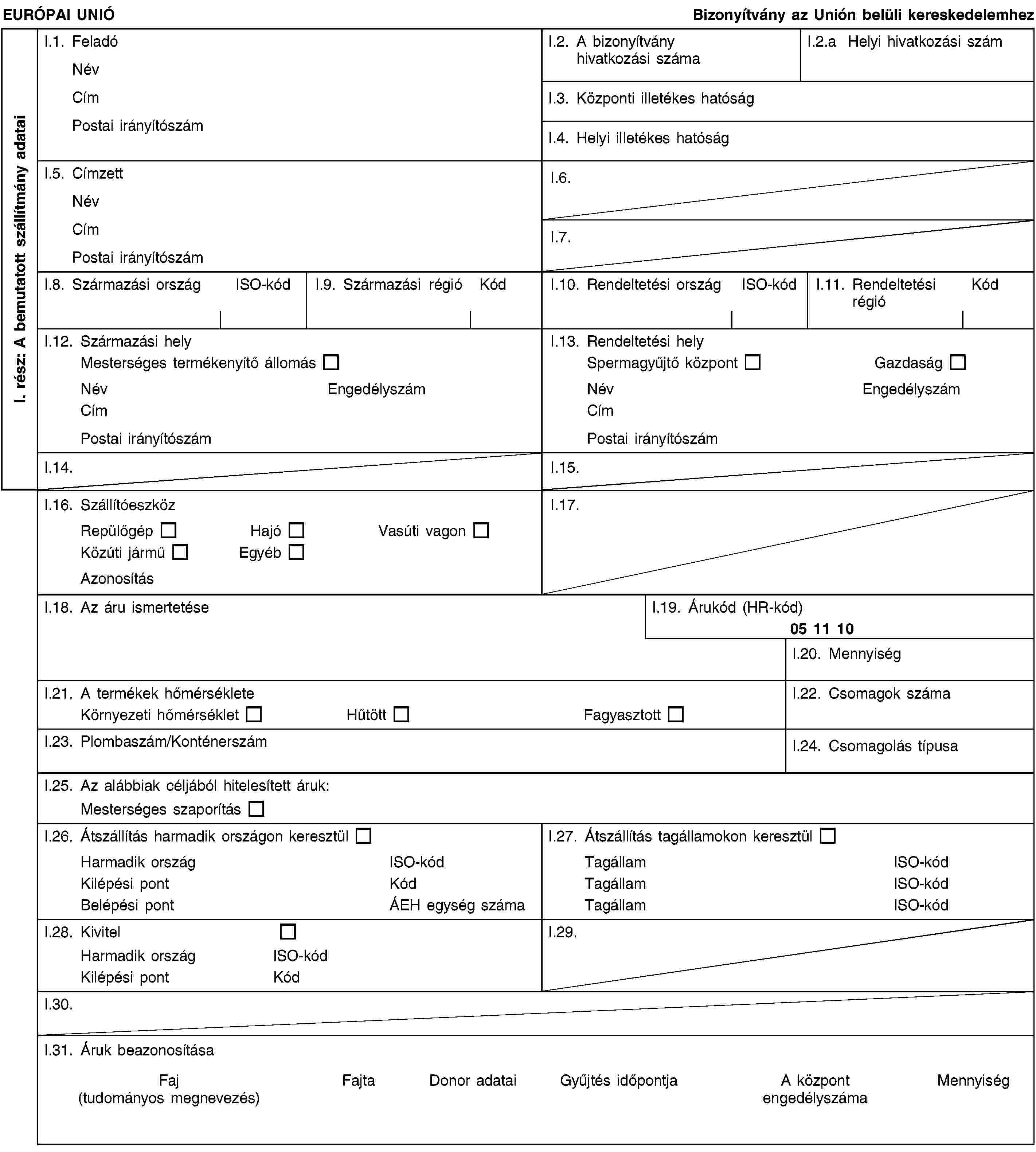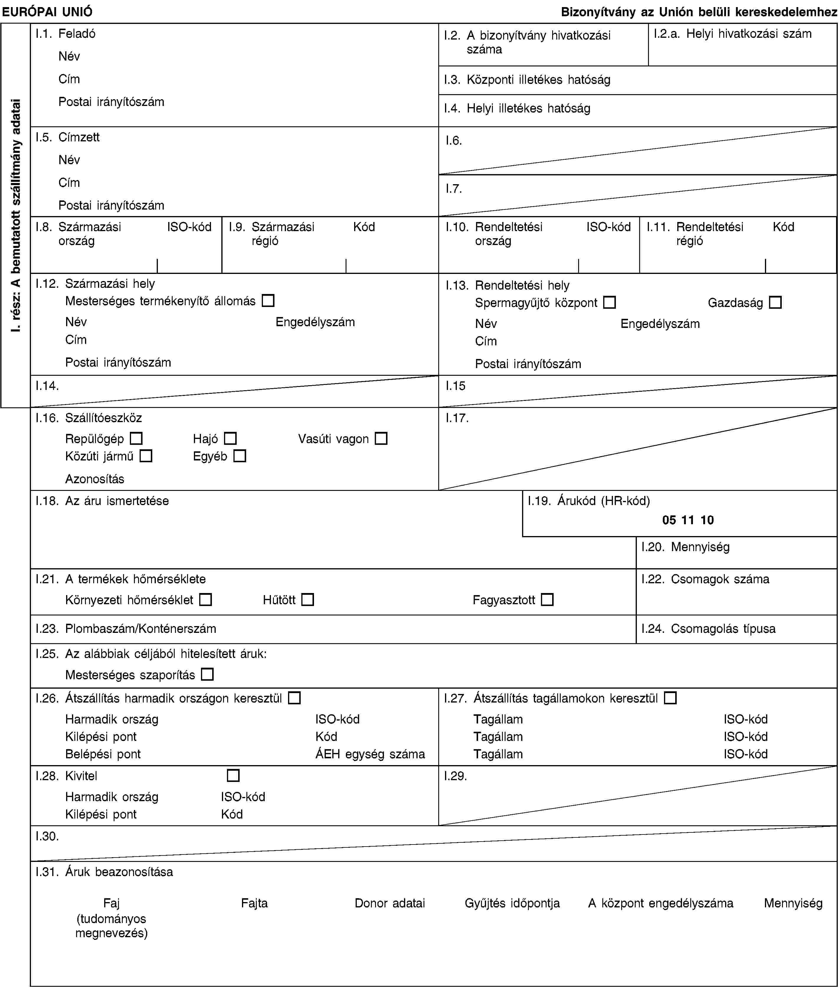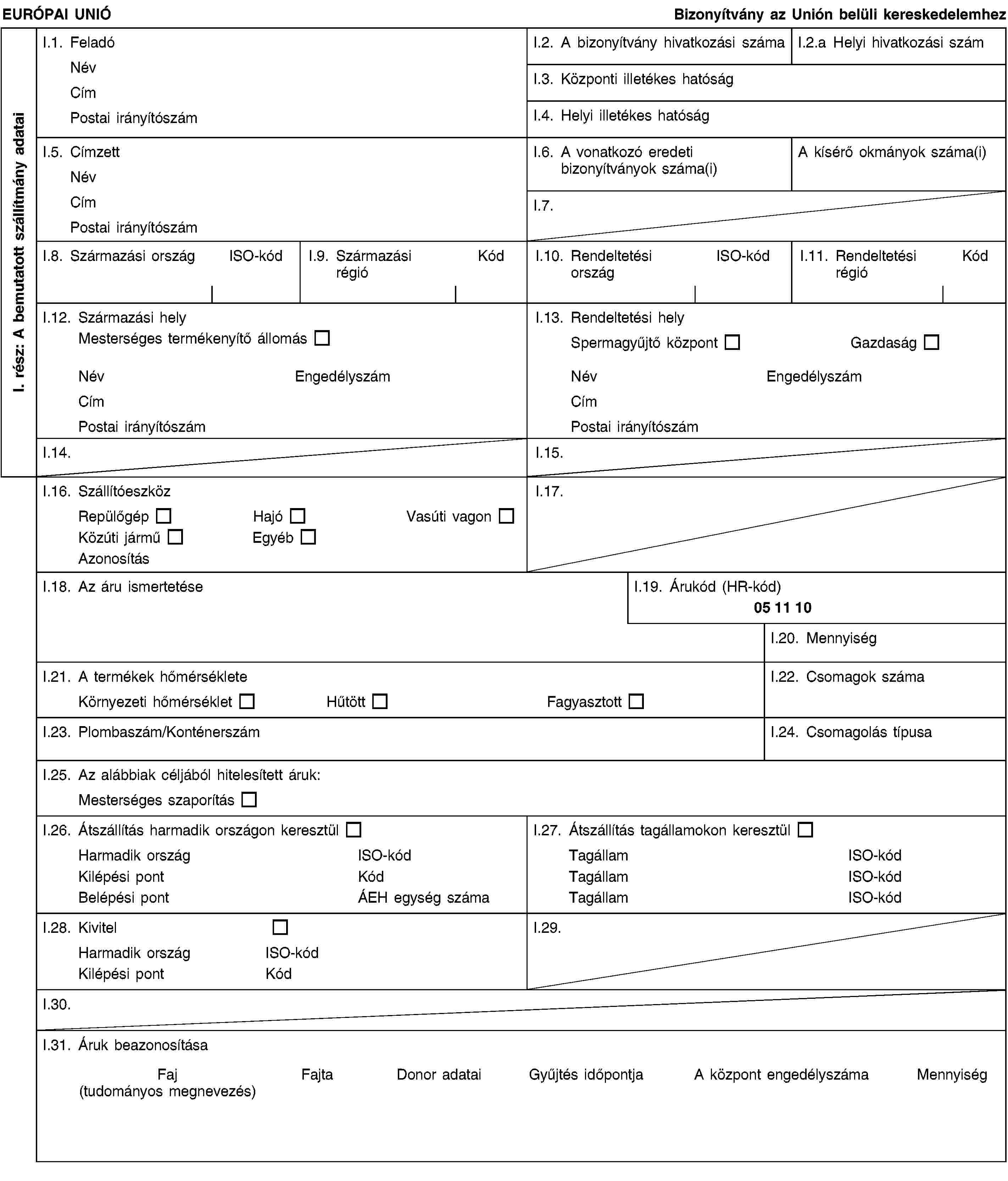 A 88/407/EGK tanácsi irányelv 2004. július 1-jéig hatályban lévő rendelkezései szerint, 2004. december 31-ét megelőzően begyűjtött, feldolgozott és tárolt, valamint az említett határidőt követően a 2003/43/EK irányelv 2. cikke (2) bekezdésnek megfelelően kereskedelmi forgalomba került, a spermagyűjtés helye szerinti spermagyűjtő központból (állomásról) feladott spermaállományok Unión belüli kereskedelmére 2005. január 1-jétől alkalmazandó állat-egészségügyi bizonyítványminta