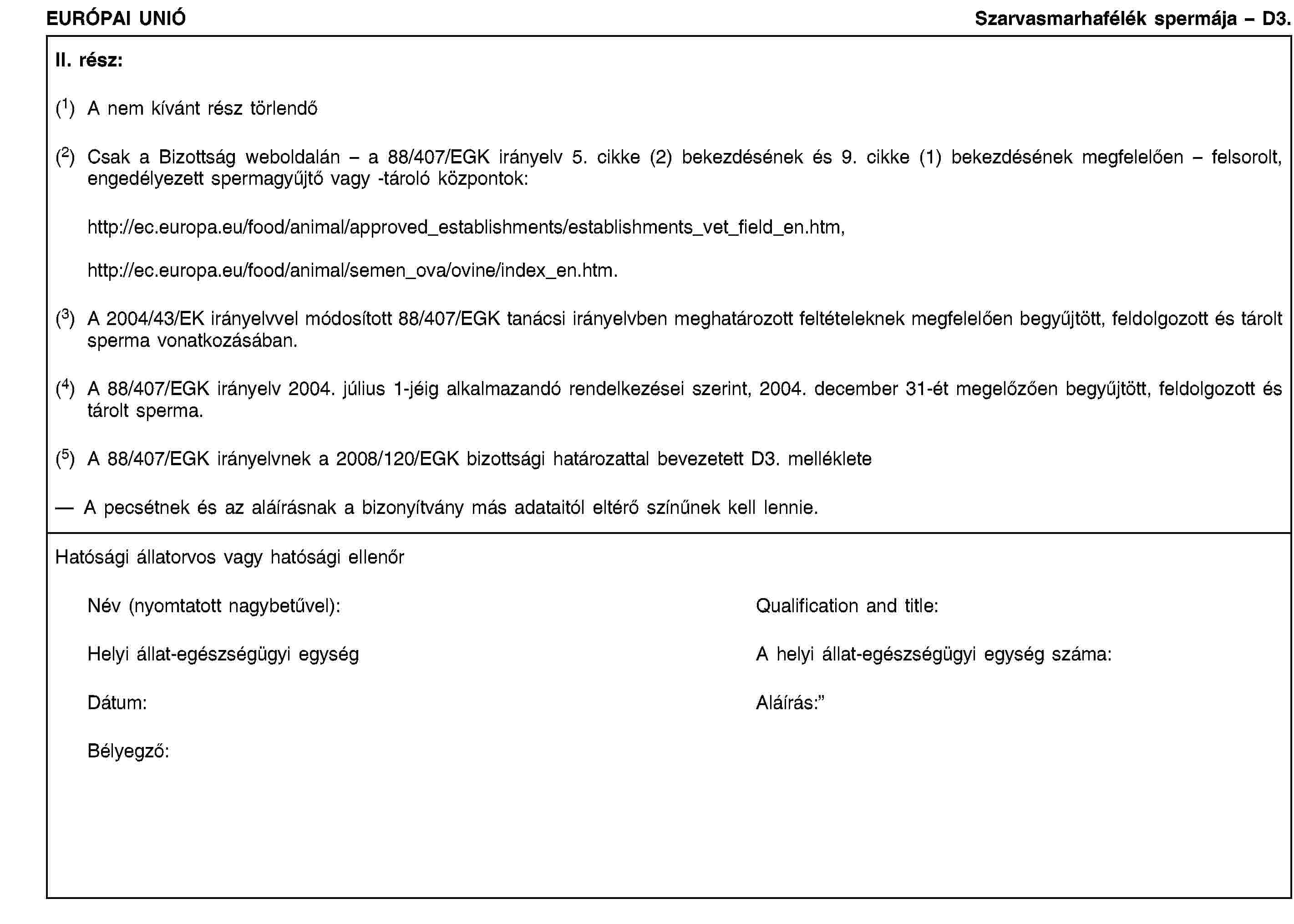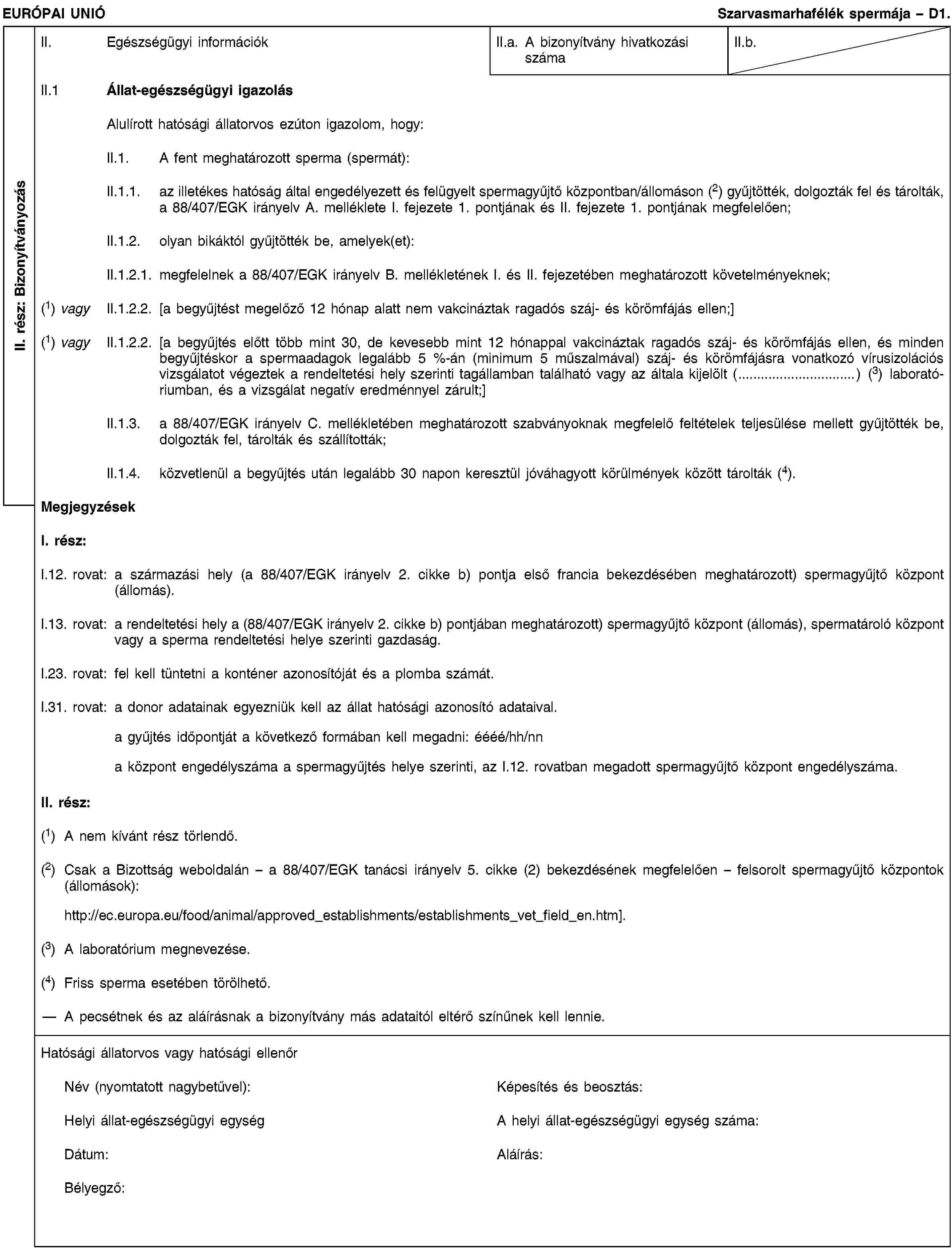 A házi szarvasmarhának a 2003/43/EK irányelvvel módosított 88/407/EGK tanácsi irányelv szerint gyűjtött, feldolgozott és tárolt, a spermagyűjtés helye szerinti spermagyűjtő központból (állomásról) feladott spermájának Unión belüli kereskedelmére vonatkozó állat-egészségügyi bizonyítványminta