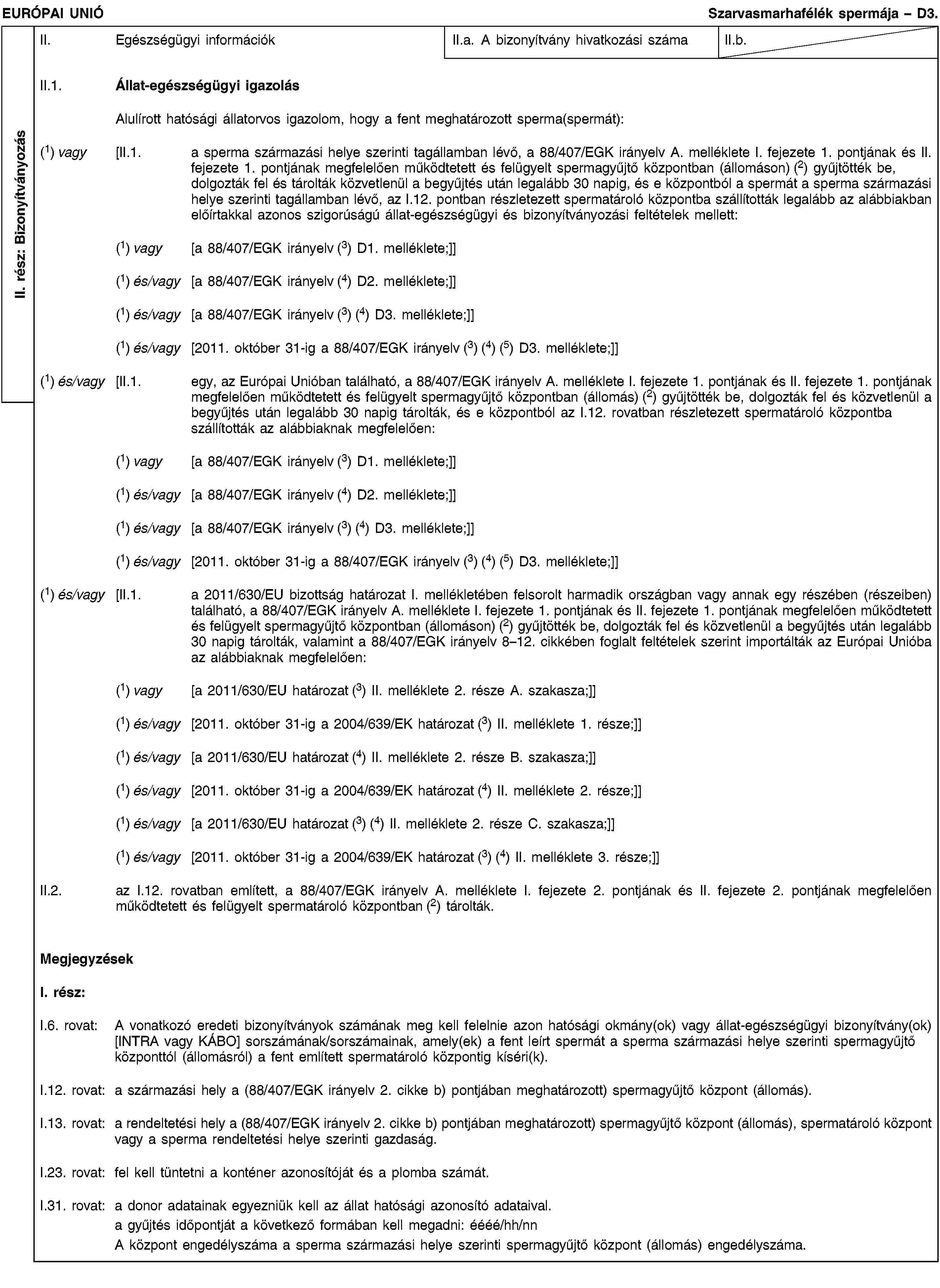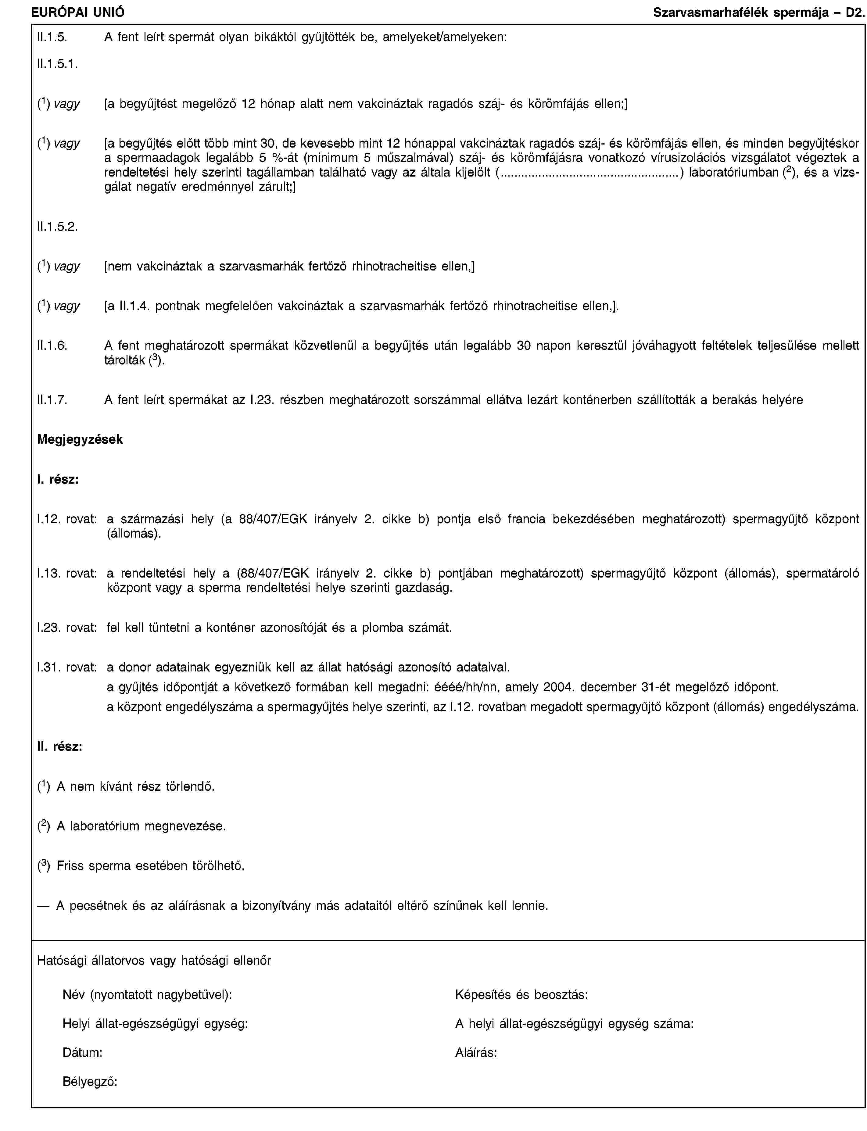 A 2003/43/EK irányelvvel módosított 88/407/EGK tanácsi irányelvnek megfelelően begyűjtött, feldolgozott és tárolt marhasperma Unión belüli kereskedelmére, valamint a 88/407/EGK tanácsi irányelv 2004. július 1-jéig hatályban lévő rendelkezései szerint, 2004. december 31-ét megelőzően begyűjtött, feldolgozott és tárolt, valamint az említett határidőt követően a 2003/43/EK irányelv 2. cikke (2) bekezdésének megfelelően kereskedelmi forgalomba került, spermagyűjtő központból (állomásról) feladott spermaállomány Unión belüli kereskedelmére vonatkozó állat-egészségügyi bizonyítványminta