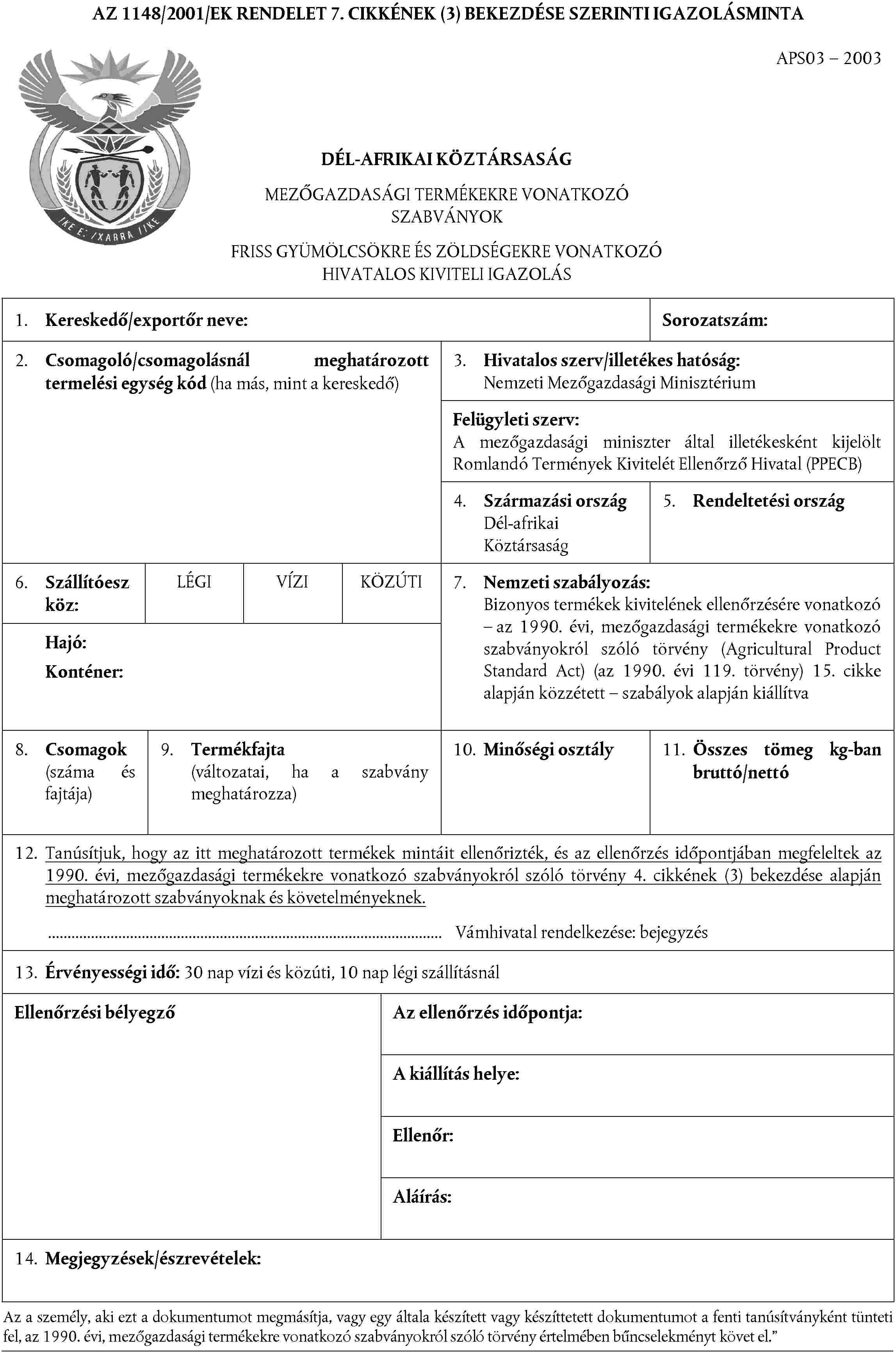 Az Európai Közösségbe történő behozatalt megelőzően a Dél-Afrikában elvégzett, a friss gyümölcsre és zöldségre alkalmazandó forgalmazási előírásoknak való megfelelési ellenőrzést az 1148/2001/EK rendelet 7. cikkében meghatározott feltételeknek megfelelően hagyják jóvá.