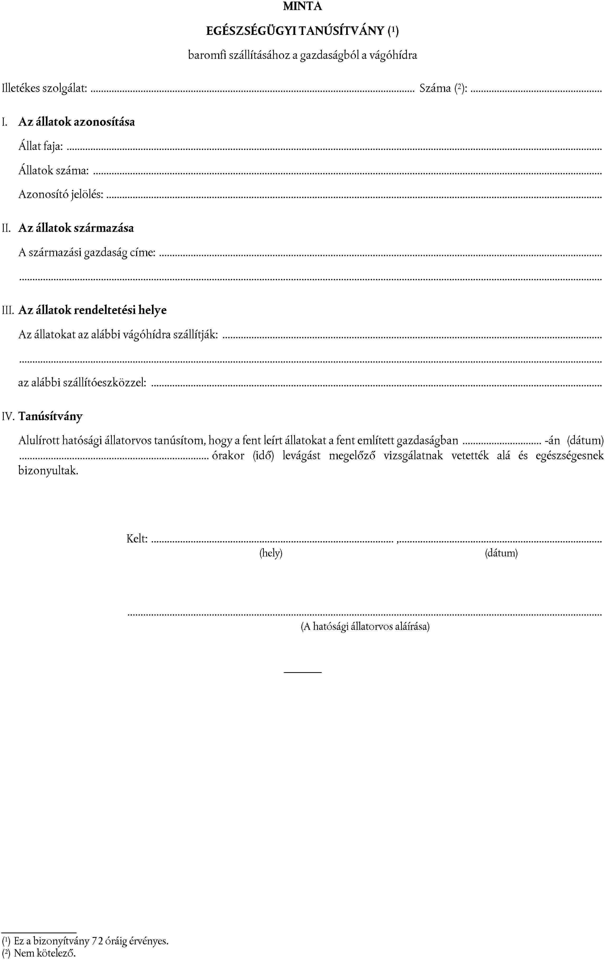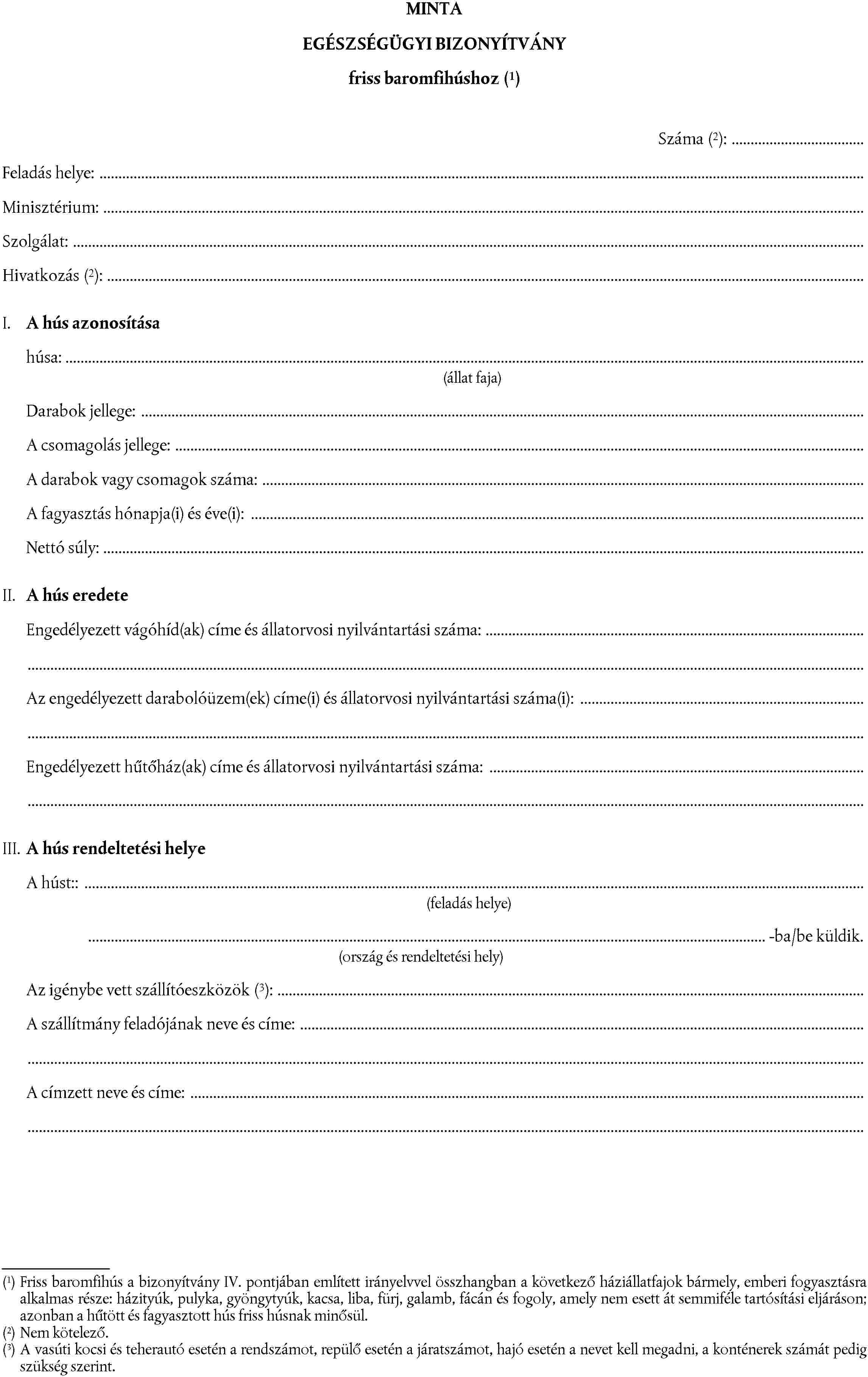 - amelynek az I. melléklet XII. 66. pontjában előírt adatokon túlmenően olyan kódszámokat is fel kell tüntetnie, amelyek alapján a származási létesítményt felügyelő illetékes hatóság, valamint a hús előállításának napján az egészségügyi vizsgálatért felelős állatorvos azonosítható,