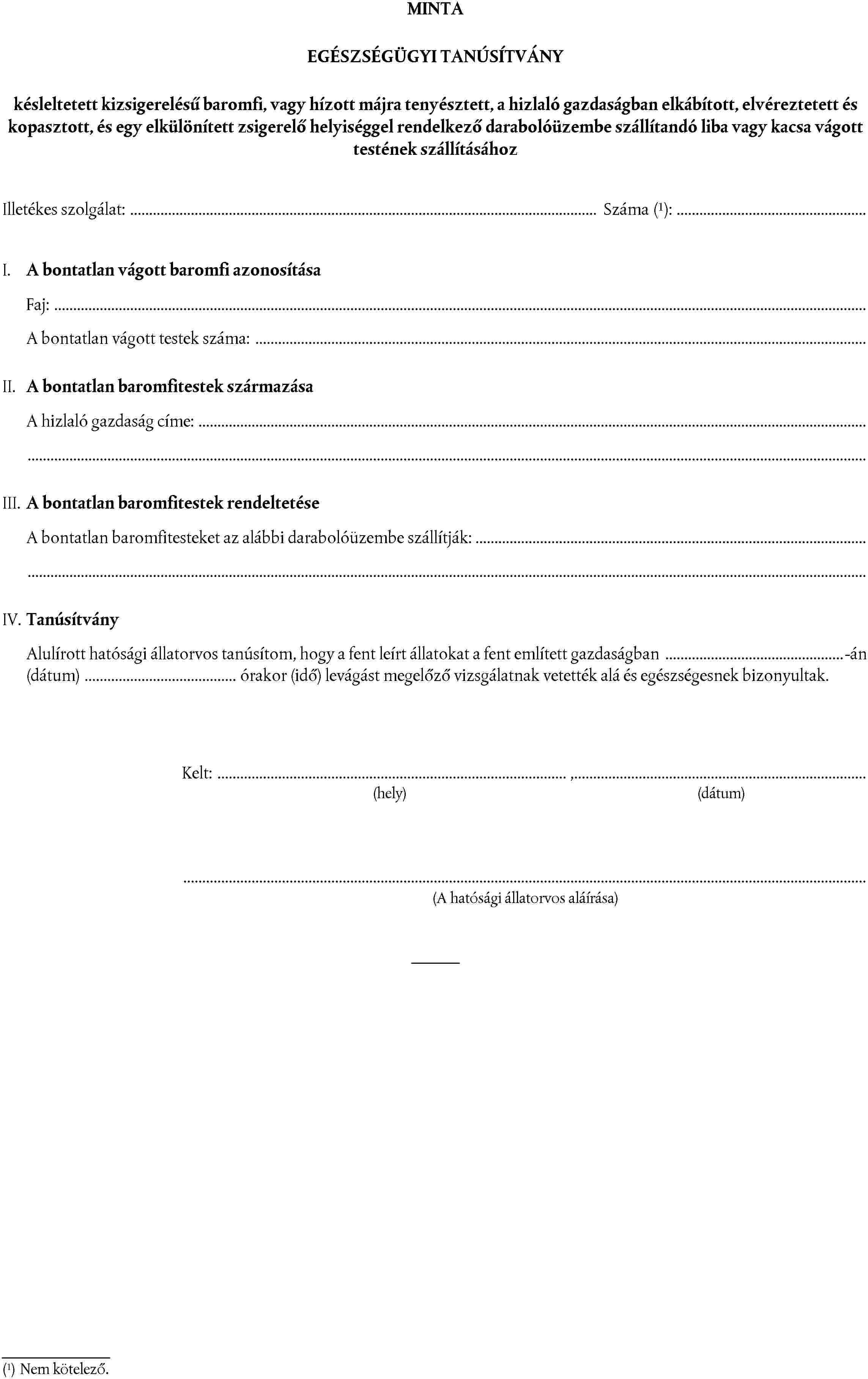 3. baromfitest: az 1. pontban említett szárnyas teljes teste elvéreztetés, kopasztás és zsigerelés után, azonban a szív, máj, tüdő, zúzógyomor, begy és vese eltávolítása, a combok elválasztása a lábtőnél, a fej, a nyelőcső vagy a légcső eltávolítása nem kötelező;