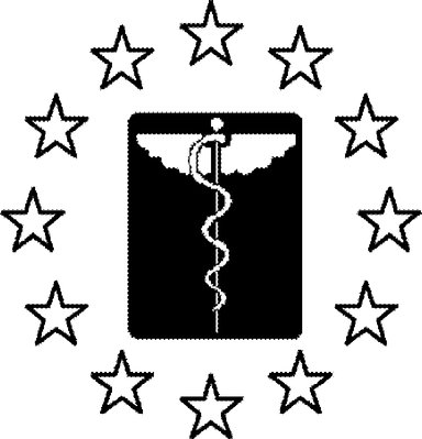 Aszklépiosz szárnyas botja a rátekeredő kígyóval a 12 csillag által alkotott kör közepén.