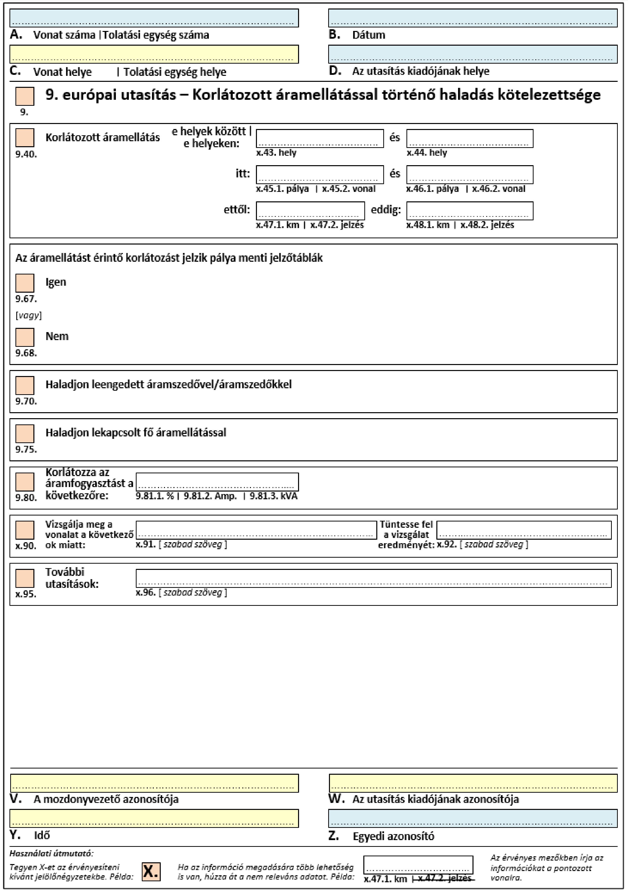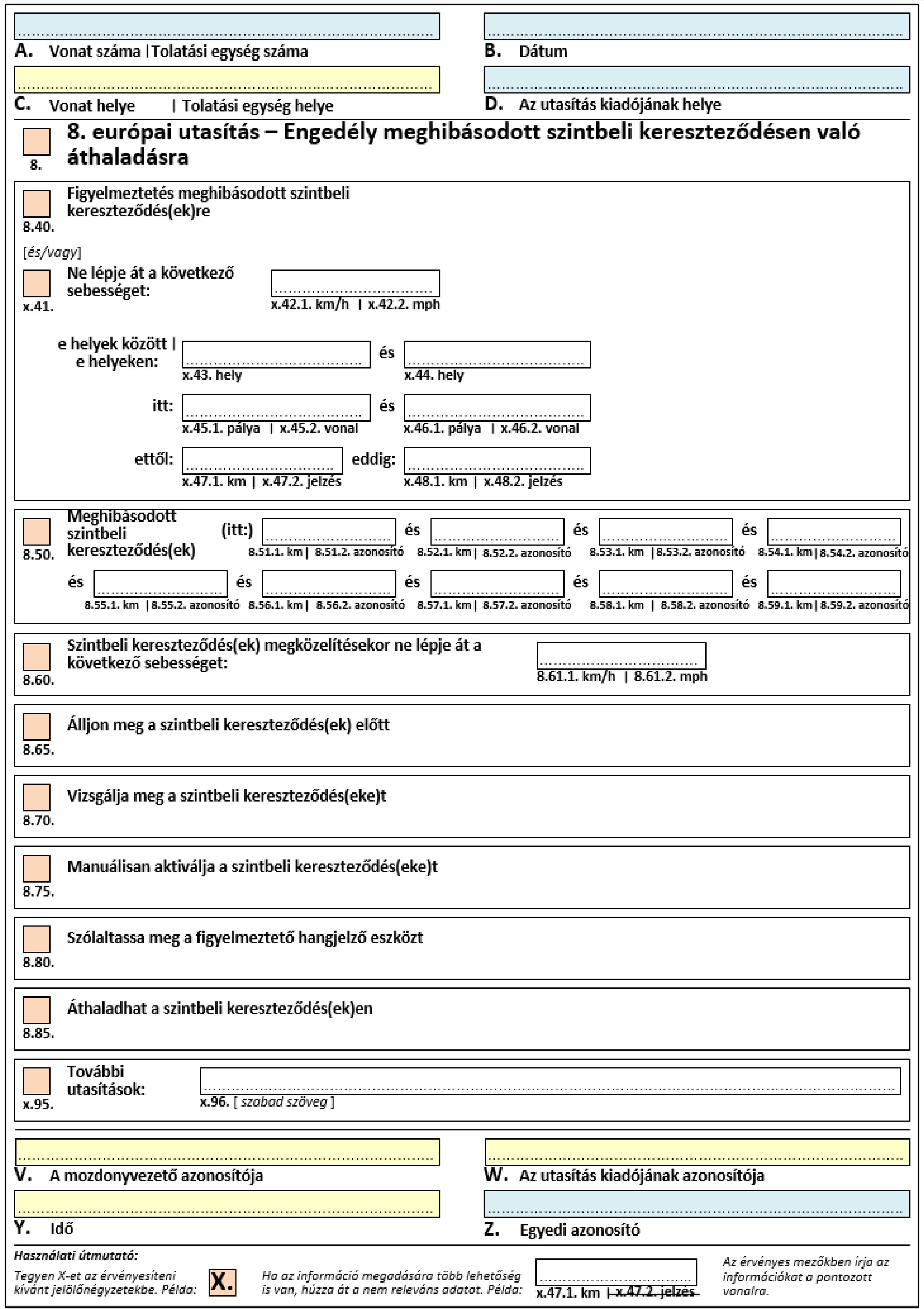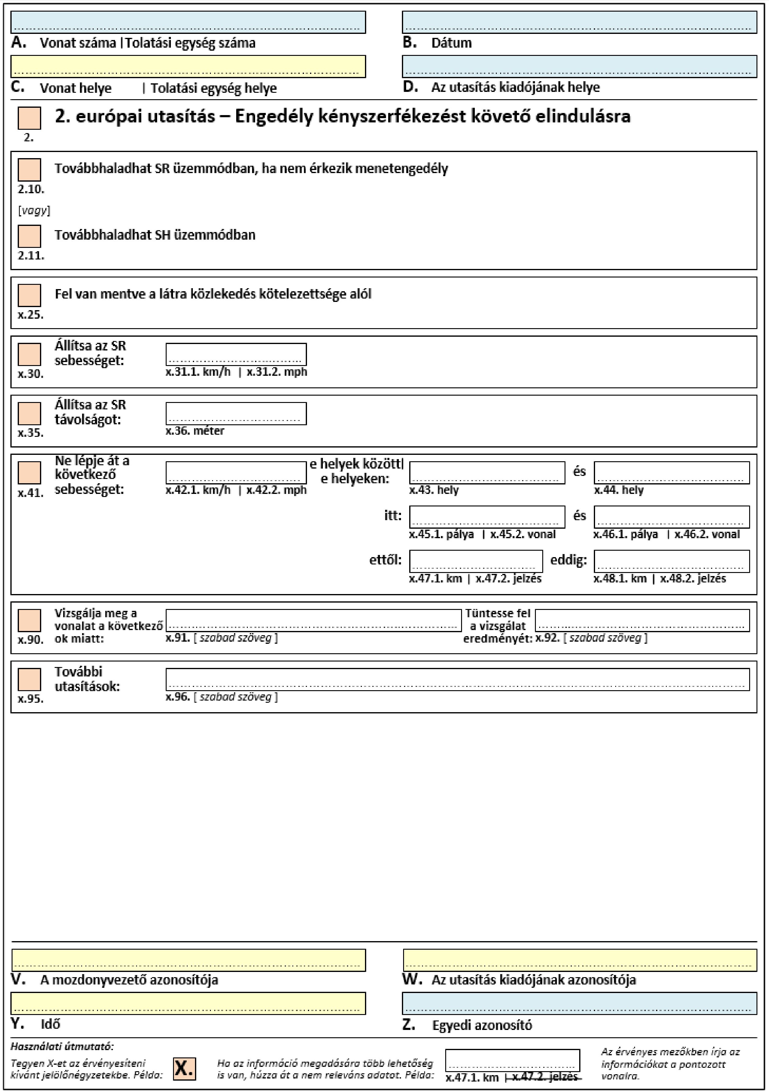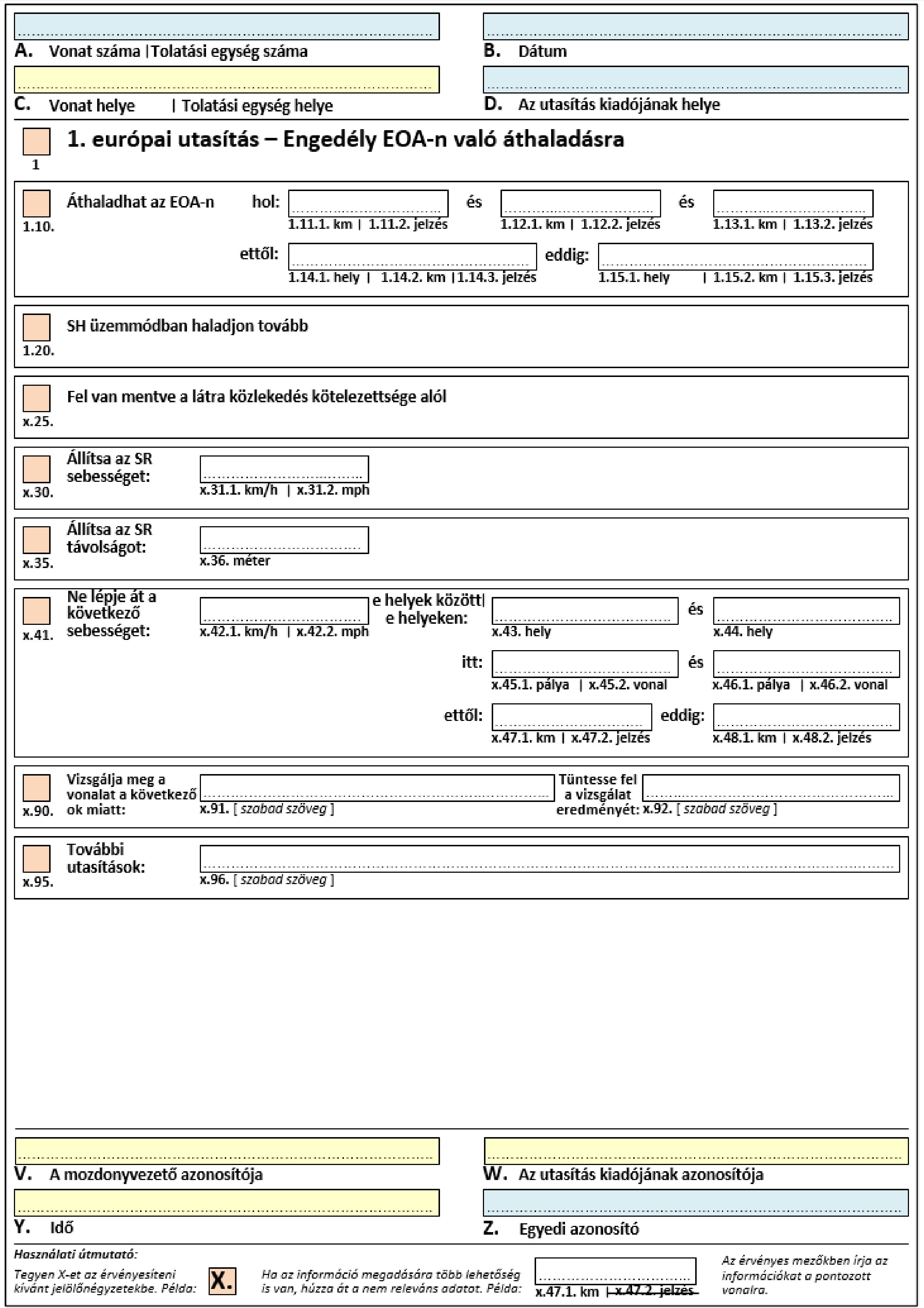 Nemzeti utasítás | Nemzeti szinten vagy pályahálózat-működtető által meghatározott utasítás, amely a „B” osztályú rendszerrel kapcsolatos helyzeteket, vagy az „A” és „B” osztályú rendszerek közötti átmenetet fedi le. |
