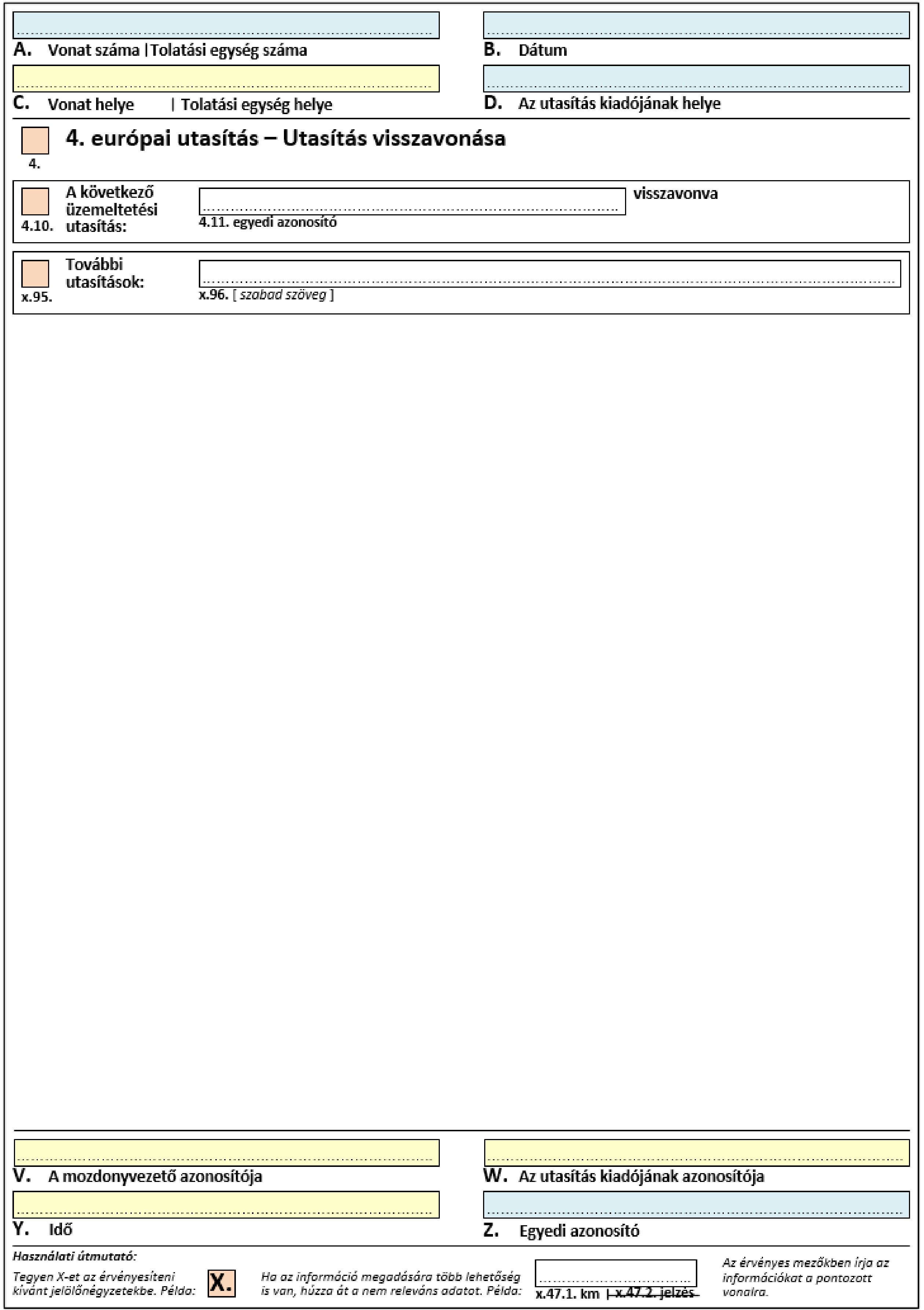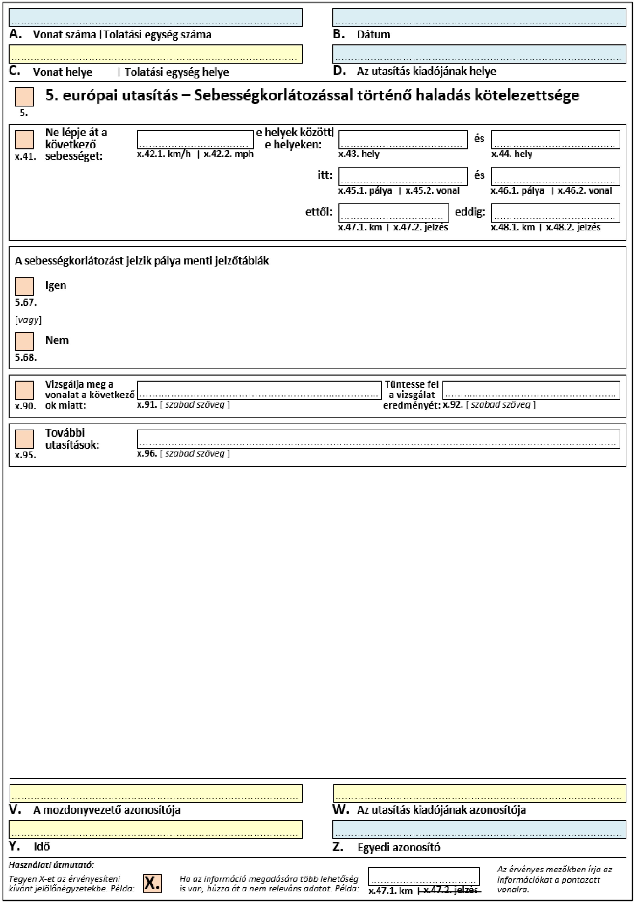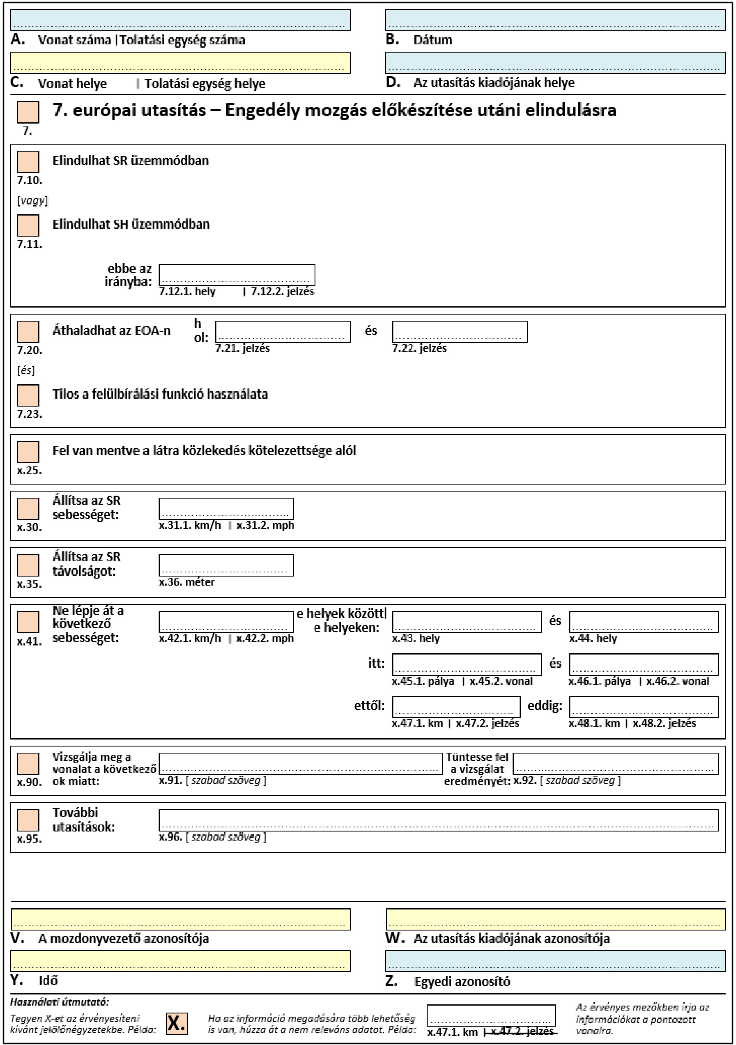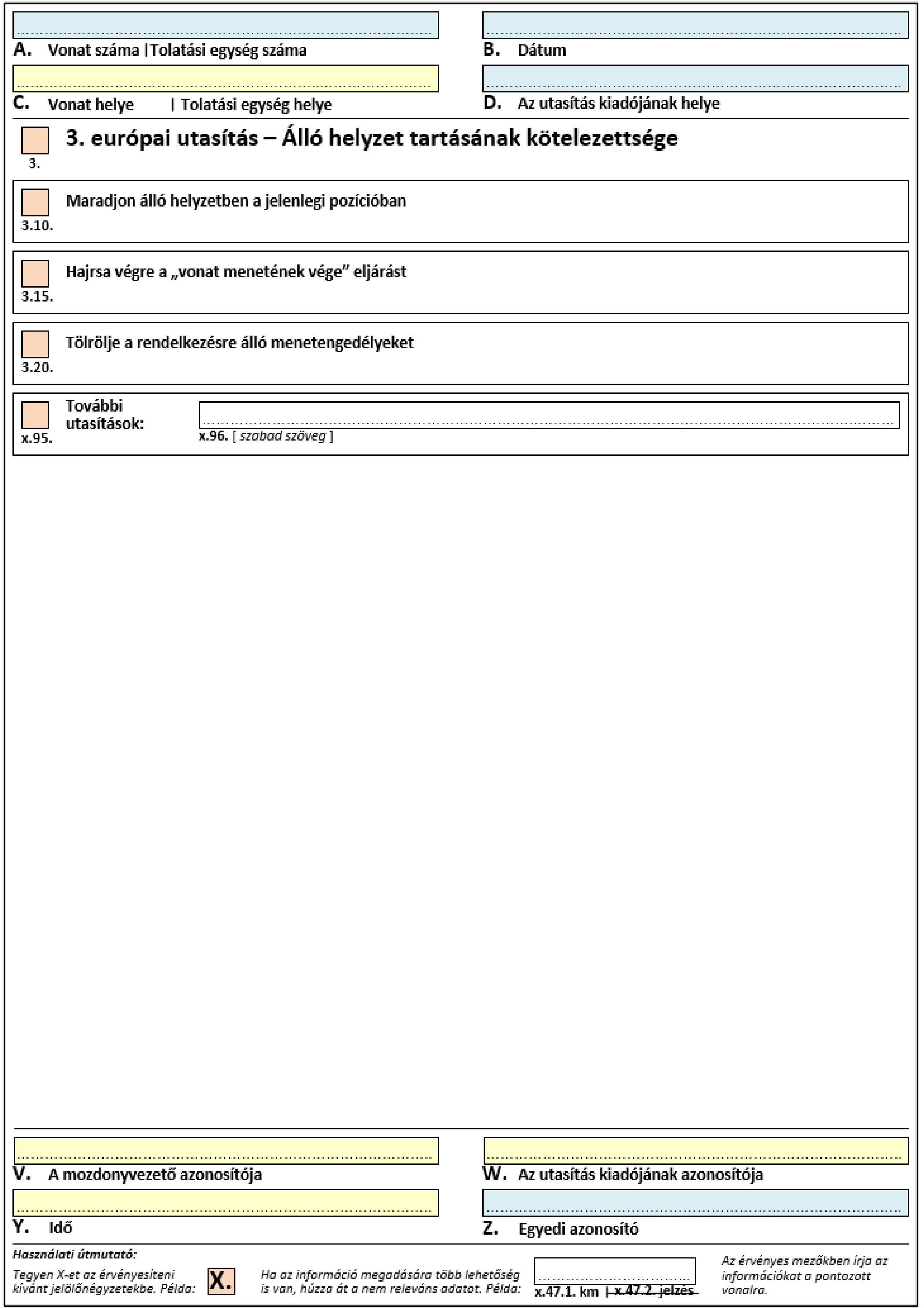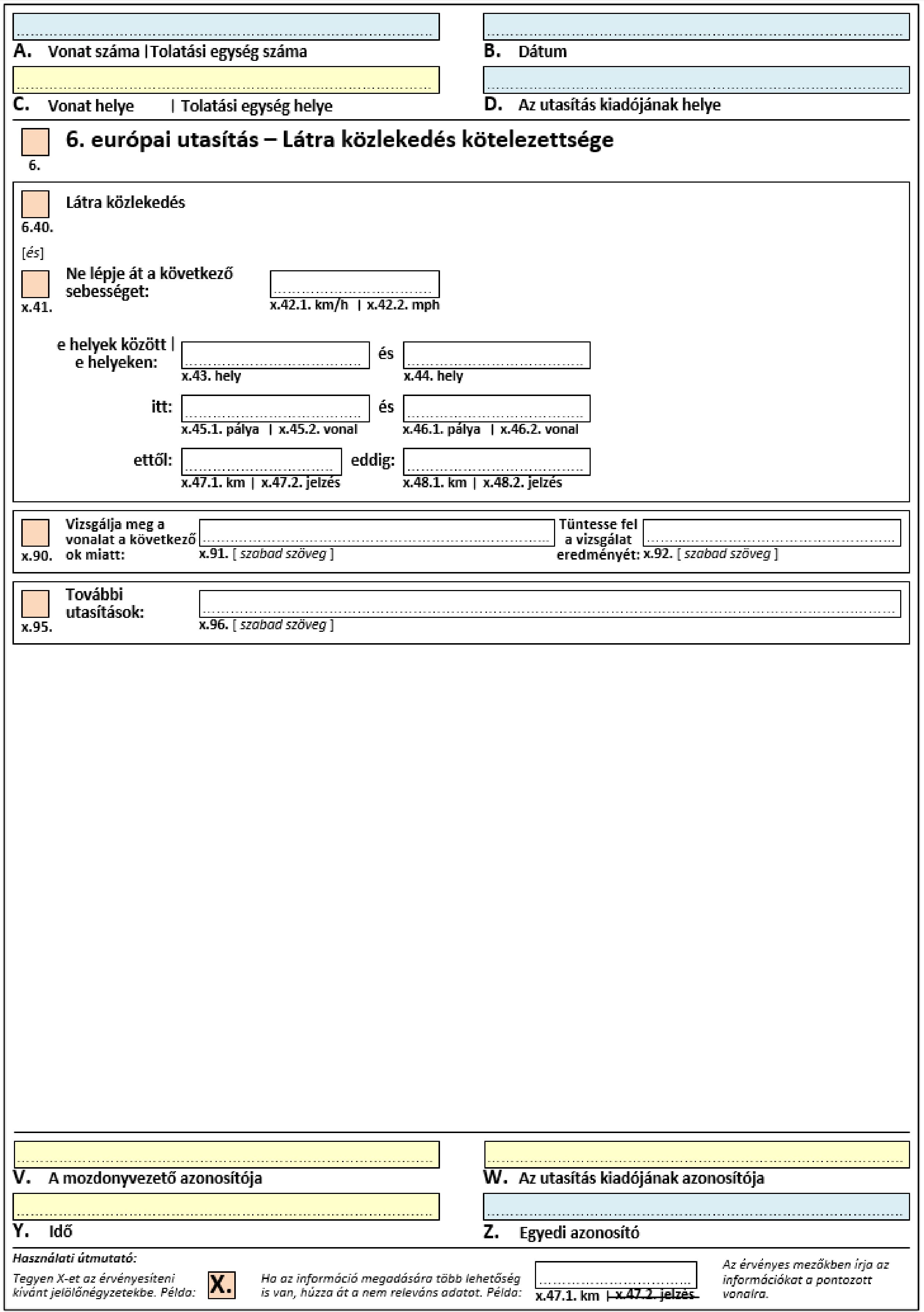 Nemzeti utasítás | Nemzeti szinten vagy pályahálózat-működtető által meghatározott utasítás, amely a „B” osztályú rendszerrel kapcsolatos helyzeteket, vagy az „A” és „B” osztályú rendszerek közötti átmenetet fedi le. |