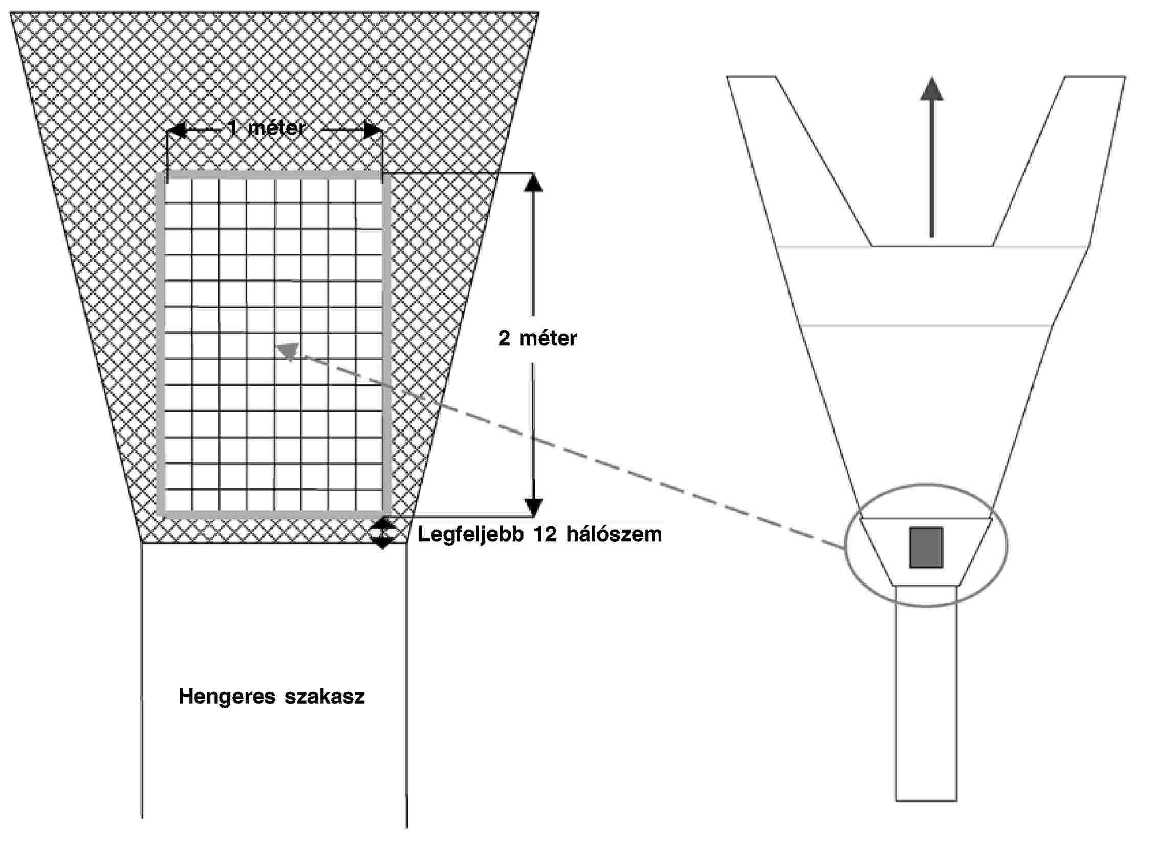 d) a négyzetes szemű hálóolyan háló, amelyben a szemek szárai által formált párhuzamos vonalakból álló két sorozatból az egyik merőlegesen, a másik pedig párhuzamosan helyezkedik el a háló hosszú tengelyéhez képest;