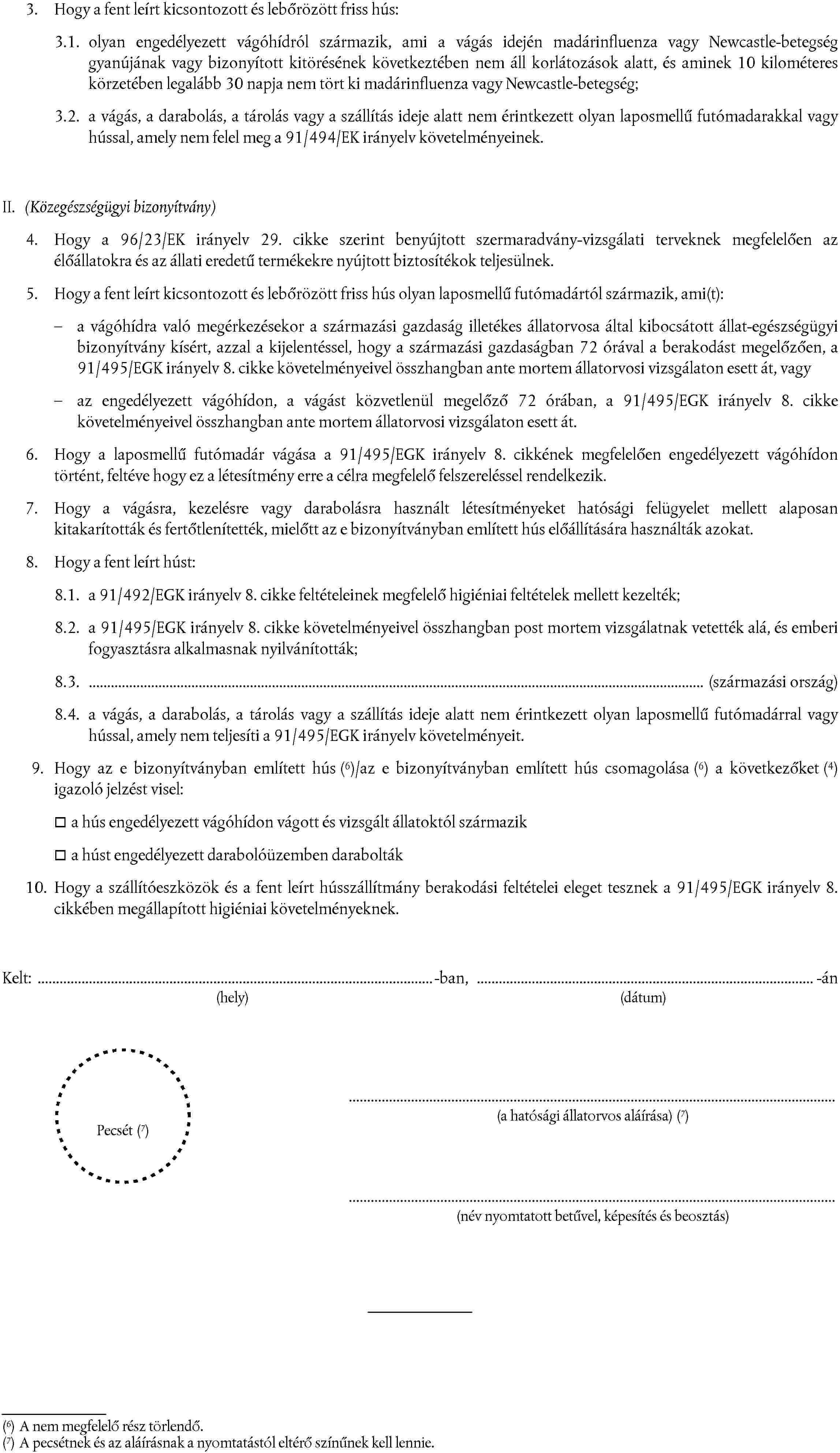 (2) A laposmellű futómadarak húsa harmadik országokból behozható, ha legalább a 91/494/EGK irányelv III. fejezetének állat-egészségügyi követelményei és - a 92/118/EGK irányelv I. mellékletének 11. fejezete szerint - a 91/495/EGK irányelv III. fejezetének közegészségügyi követelményei teljesülnek.