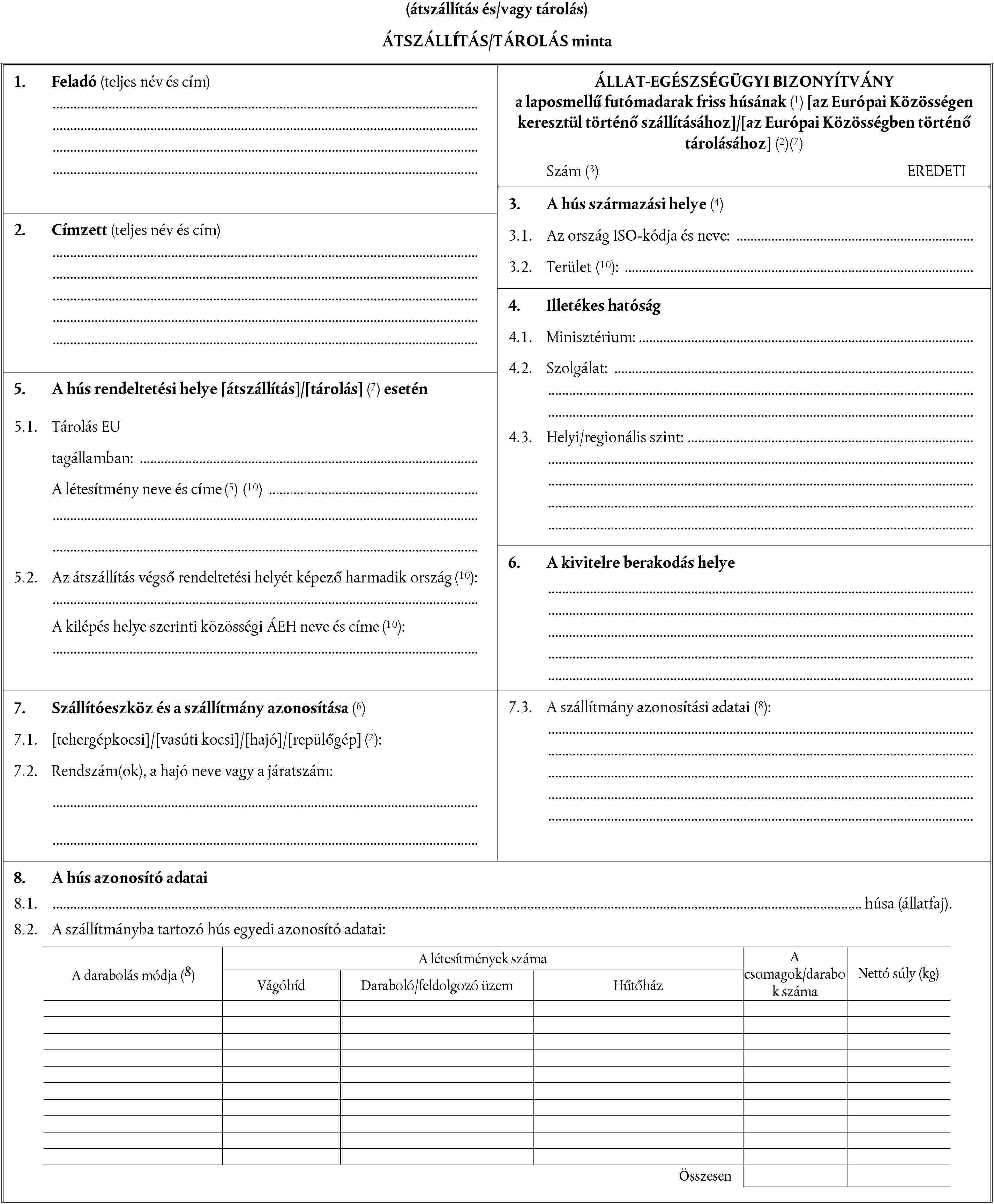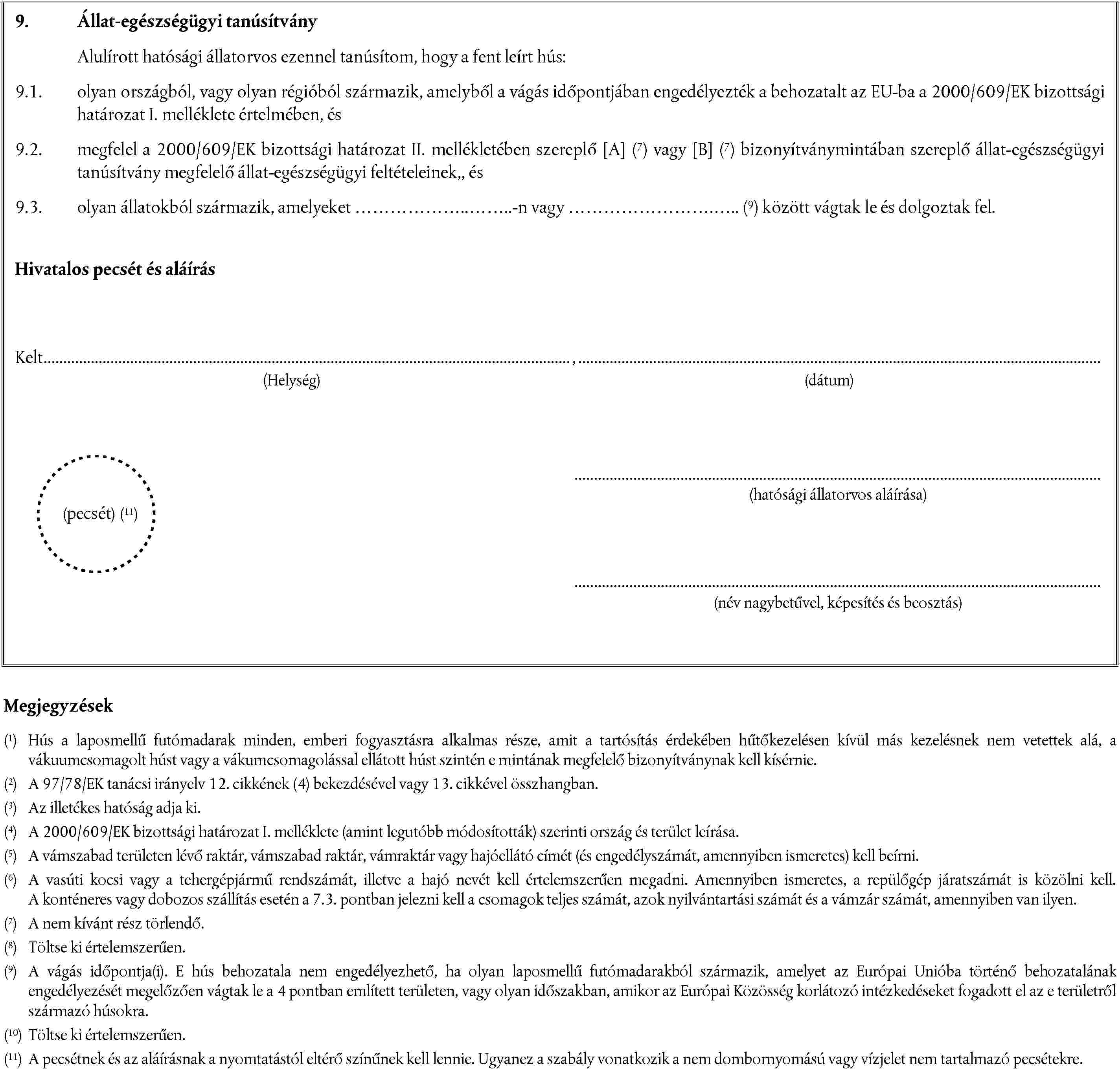A tagállamok csak az I. mellékletben felsorolt harmadik országokat vagy harmadik országok részeit hatalmazzák fel a tenyésztett laposmellű futómadarak húsának behozatalára, feltéve, hogy az eleget tesz a II. mellékletben megállapított, megfelelő egészségügyi bizonyítvány követelményeinek, valamint ilyen, helyesen kitöltött és aláírt bizonyítvány kíséri. A bizonyítványnak tartalmazza a II. melléklet 1. részével megegyező általános részt, az I. mellékletben meghatározott, szükséges ("A"vagy"B") minta szerint.