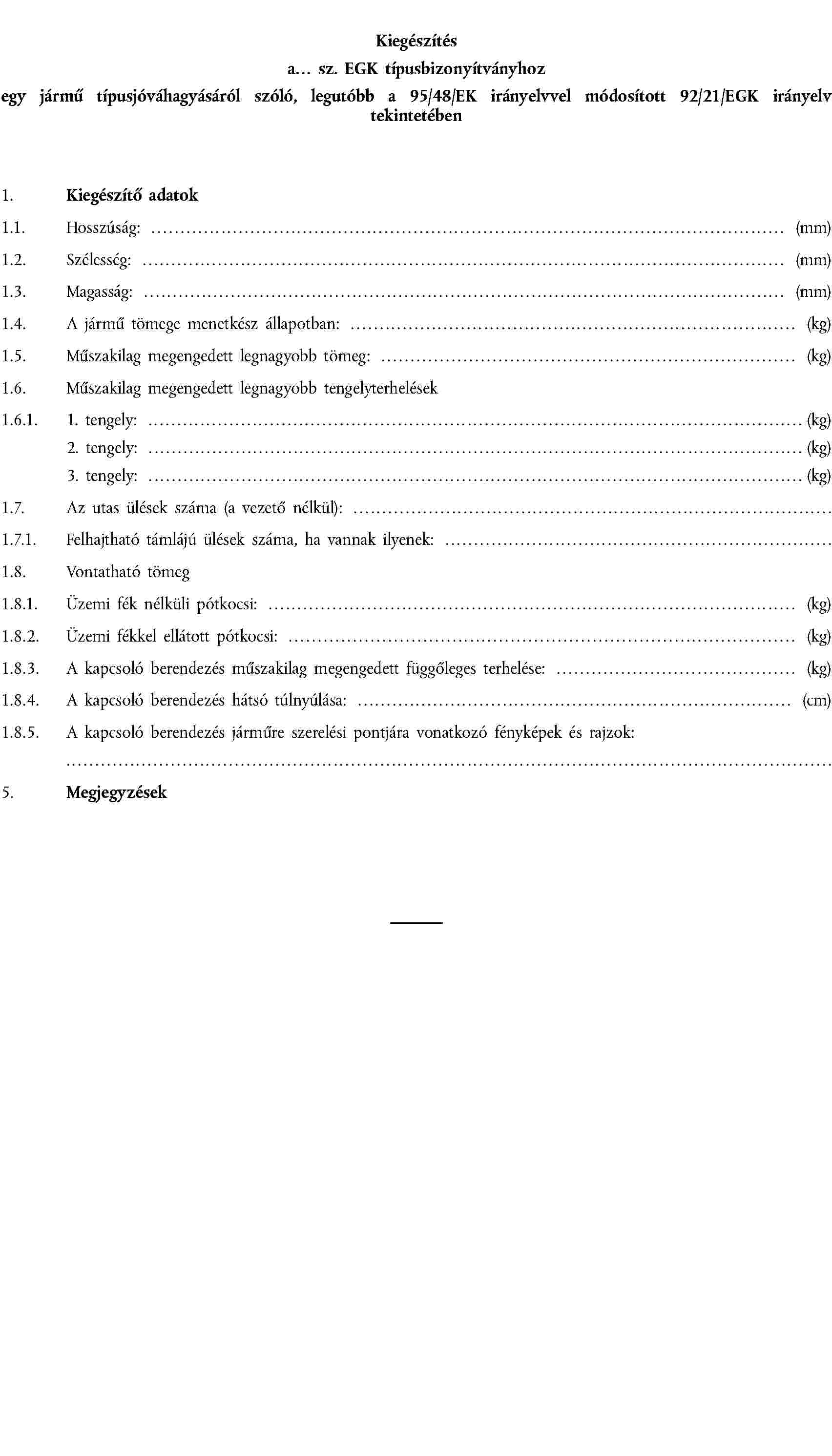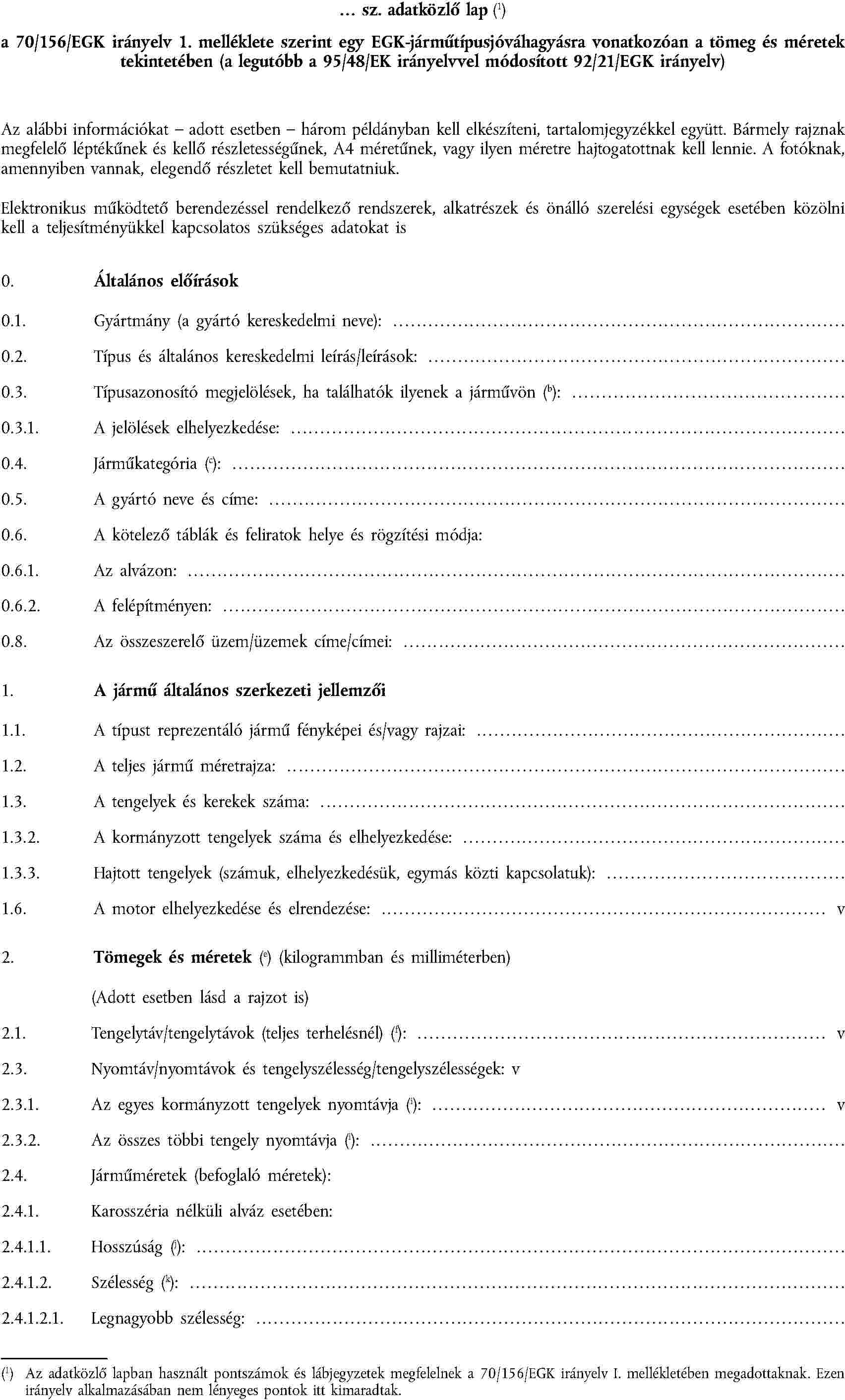 I. melléklet: | A típusjóváhagyásra vonatkozó közigazgatási rendelkezések 1. függelék: Adatközlő lap 2. függelék: Típusbizonyítvány |