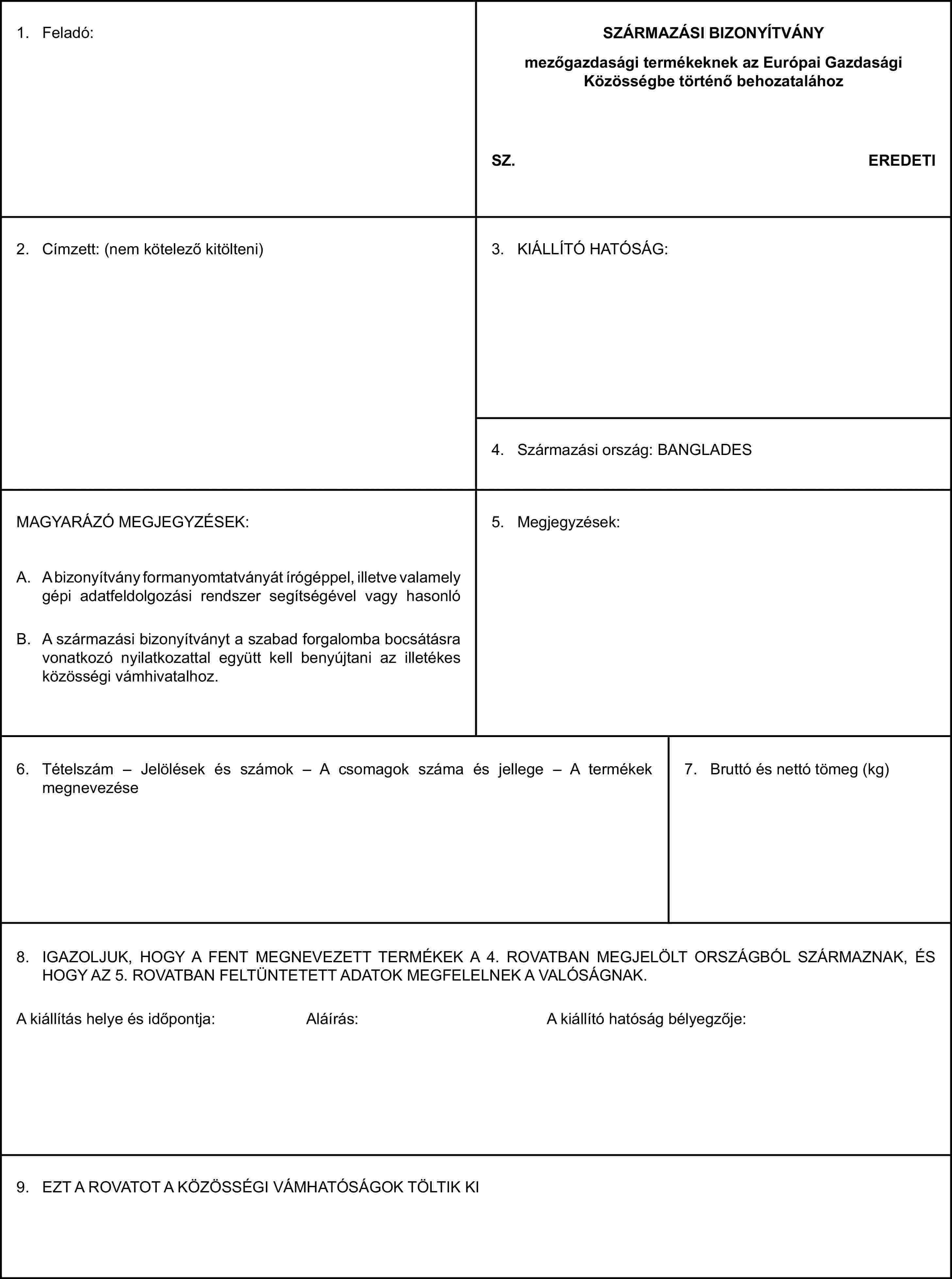 (1) A 3491/90/EGK rendelet 1. cikke (2) bekezdésének első francia bekezdésében említett bizonyítékot az illetékes bangladesi hatóságok által a származási bizonyítvány "Megjegyzések" rovatában feltüntetett, az e rendelet II. mellékletében felsorolt megjelölések valamelyikével megegyező bejegyzés képezi.