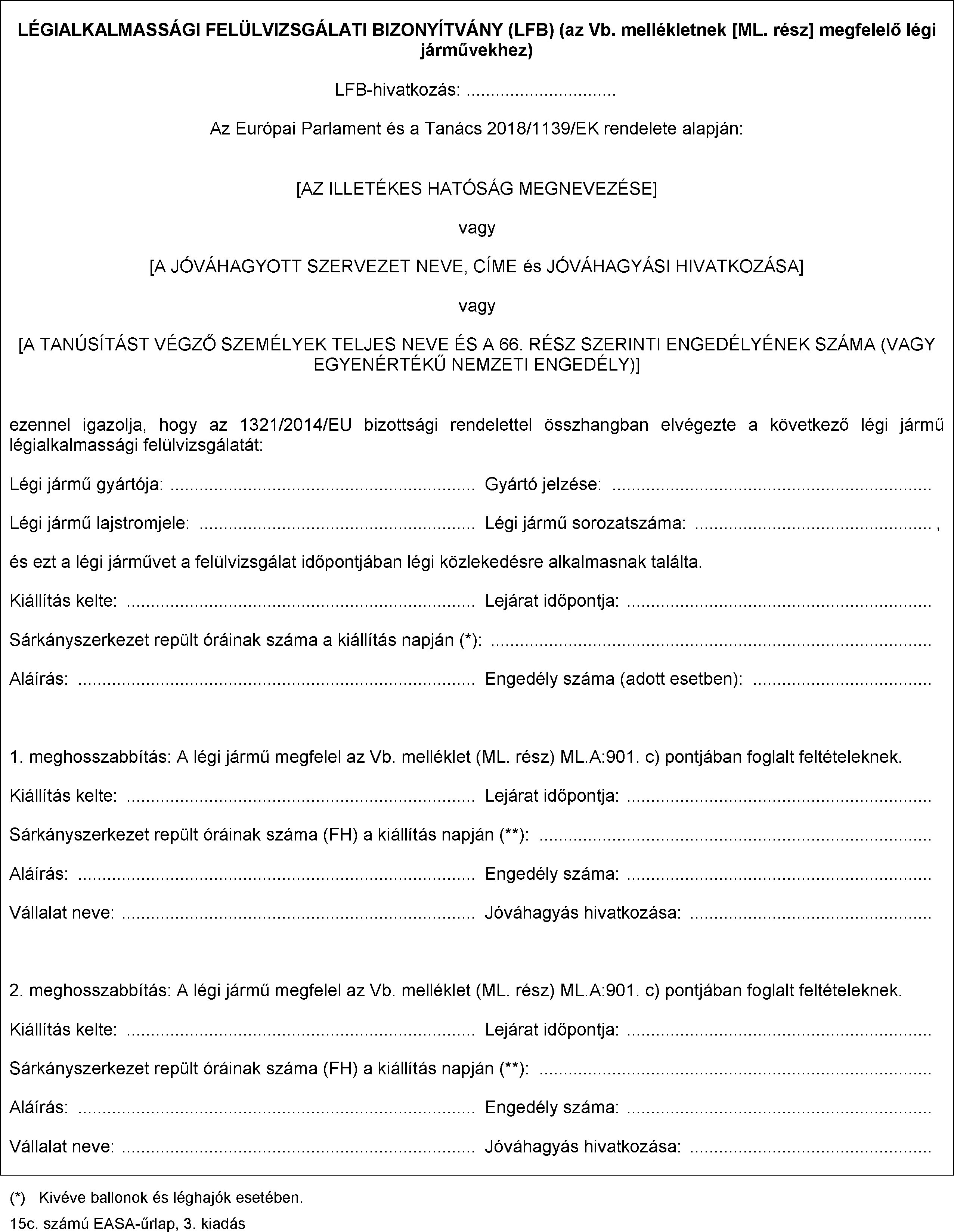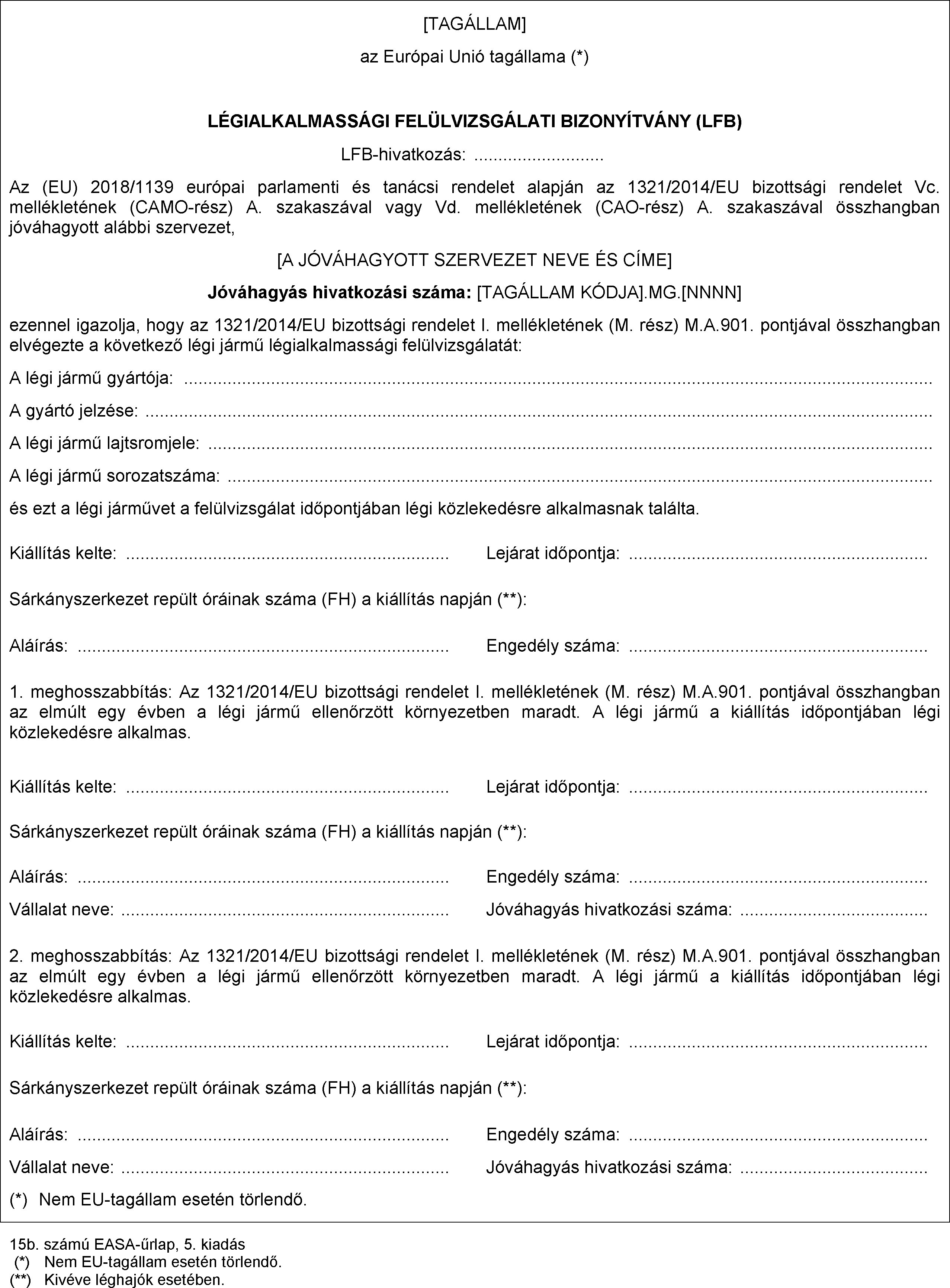 c) az I. melléklet (M. rész) M.A.901. pontjának megfelelően elvégezték a légialkalmassági felülvizsgálatot, és új légialkalmassági felülvizsgálati bizonyítványt állítottak ki.