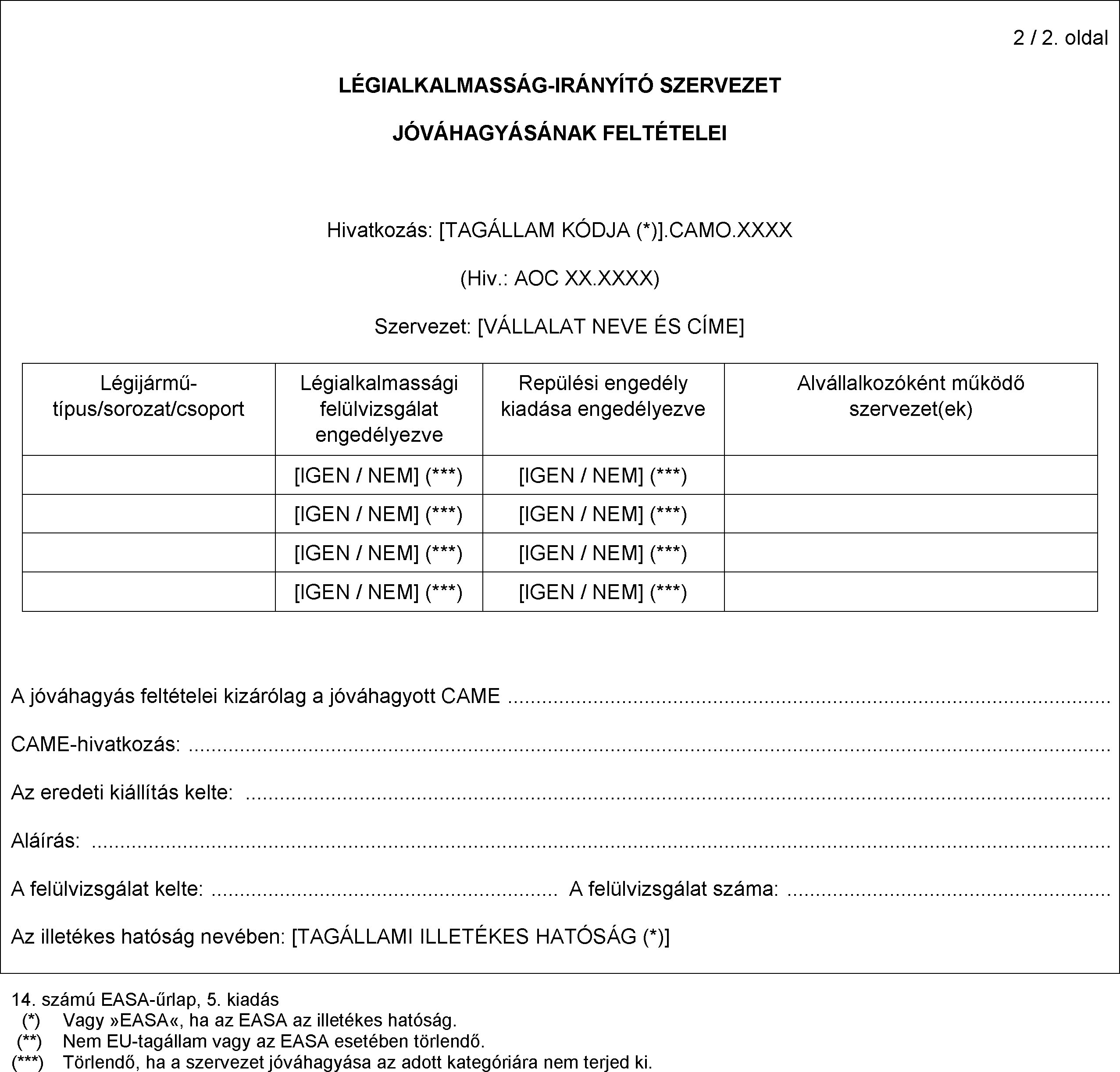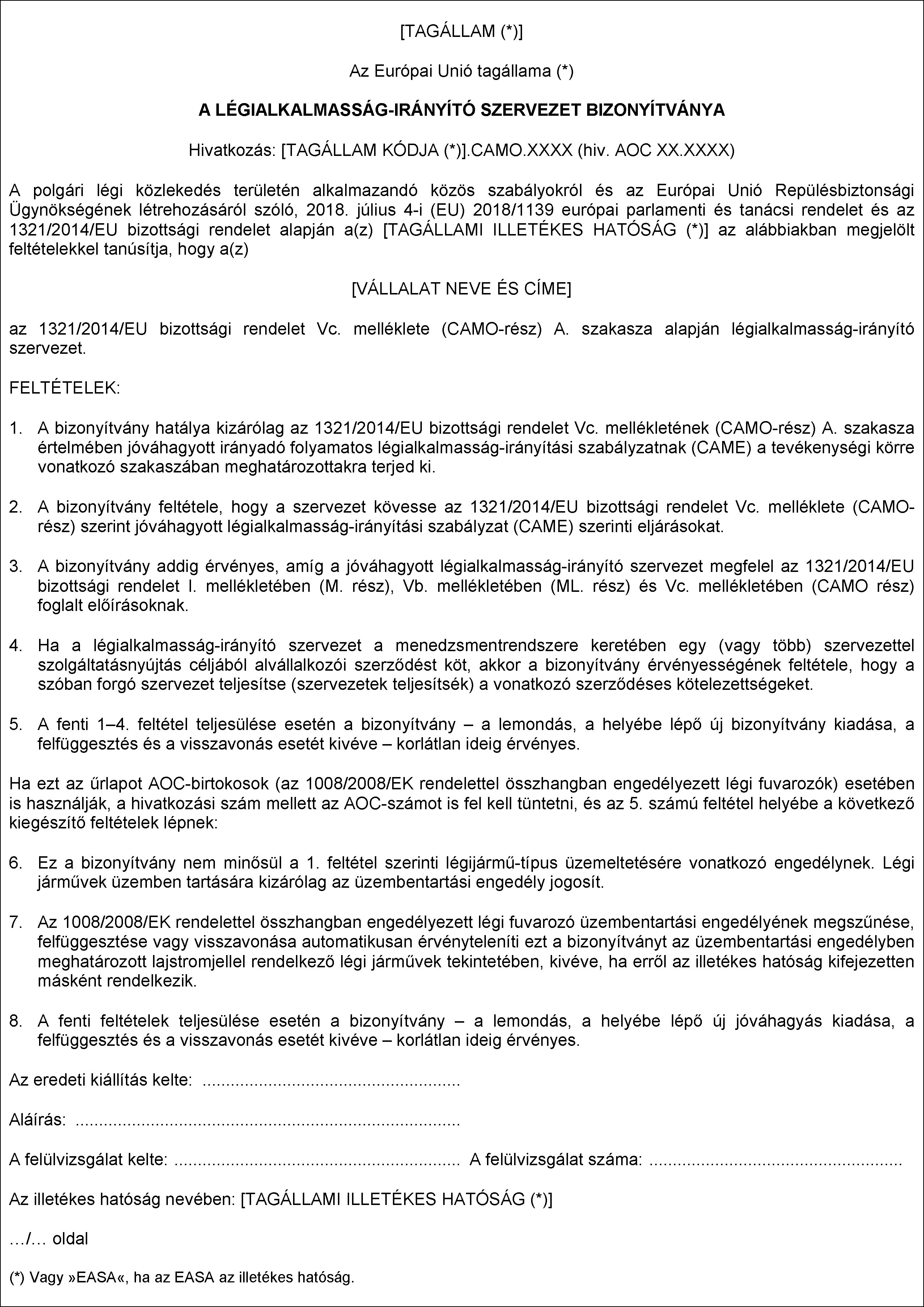 b) Az illetékes hatóság a I. függelékben meghatározott 3. számú (CAO) EASA-űrlapon megadottak szerint mellékeli a CAO hivatkozási számát.