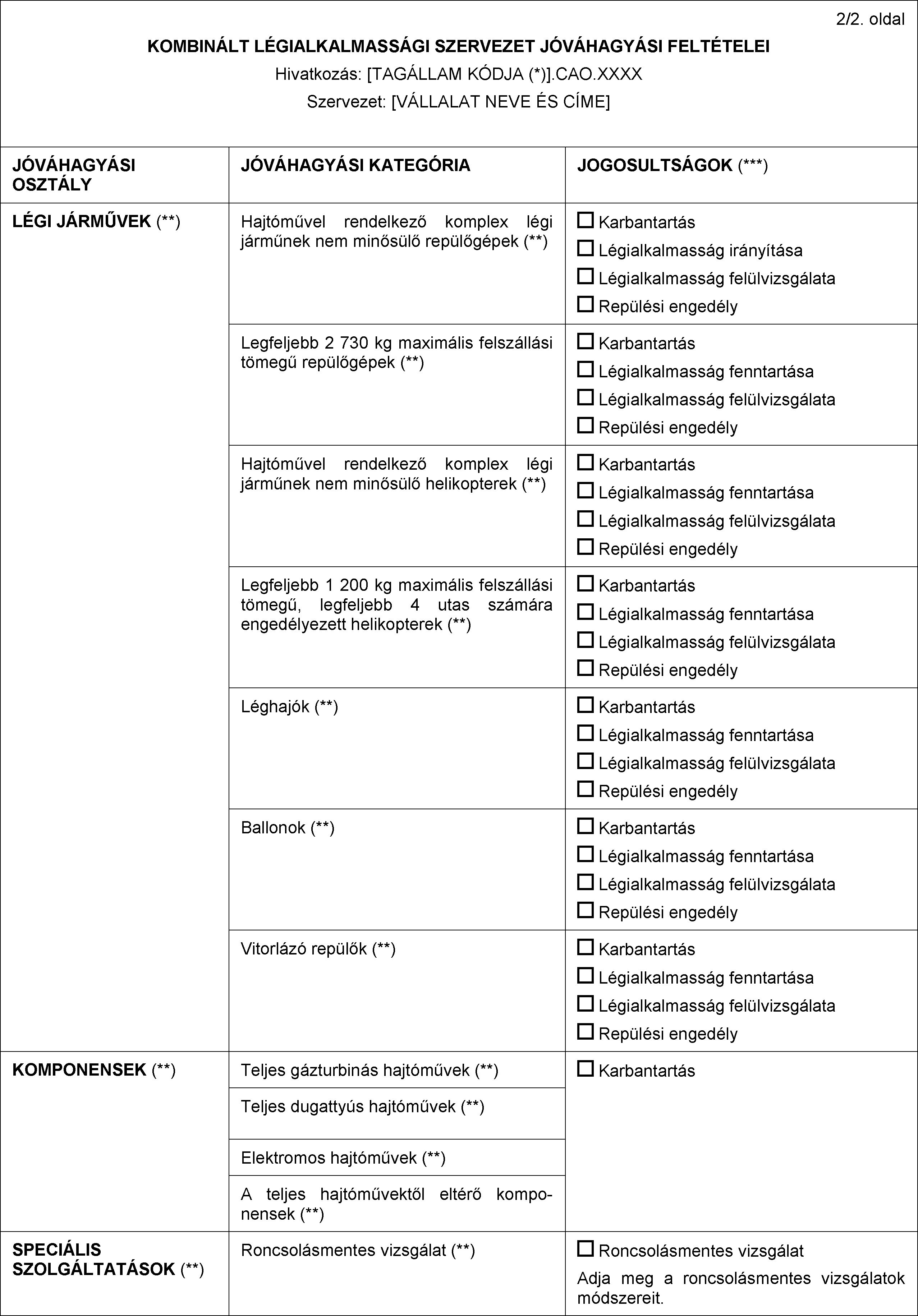 (e) A »Roncsolásmentes vizsgálat« kategória egy olyan független kategória, amely nem kapcsolódik szükségszerűen egy meghatározott légi járműhöz, hajtóműhöz vagy más komponenshez. A »Roncsolásmentes vizsgálat« kategória csak olyan CAO-k számára szükséges, amelyek más szervezetek számára speciális feladatként hajtanak végre roncsolásmentes vizsgálatokat. Az légi járművek, hajtóművek vagy komponensek szerinti kategóriákban jóváhagyott CAO, amennyiben a CAE a roncsolásmentes vizsgálatokra vonatkozó eljárásokat is tartalmaz, a saját maga által karbantartott termékeken úgy is végrehajthat roncsolásmentes vizsgálatokat, hogy nem rendelkezik külön jóváhagyással a »Roncsolásmentes vizsgálat« kategóriában.