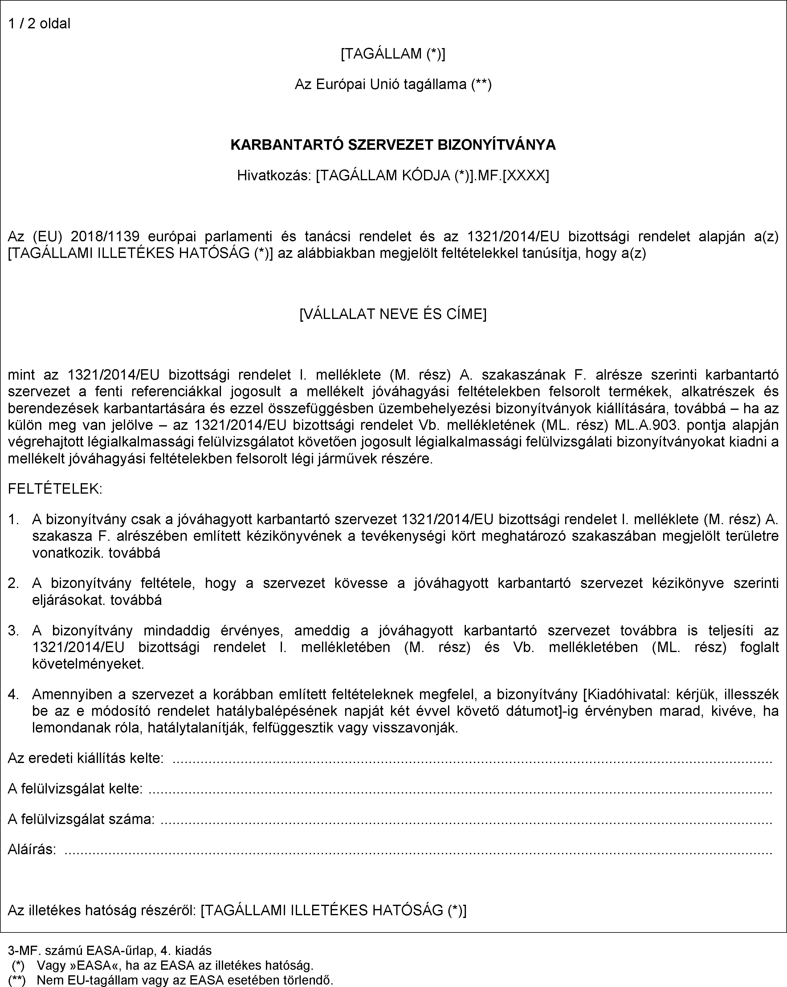 (4) Az I. melléklet (M. rész) F. vagy G. alrésze vagy a II. melléklet (145. rész) szerint kibocsátott, érvényes jóváhagyással rendelkező szervezetek részére - azok kérésére - az illetékes hatóság az Vd. melléklet I. függelékében meghatározottak szerint kiállítja a 3. számú (CAO) EASA-űrlapot.