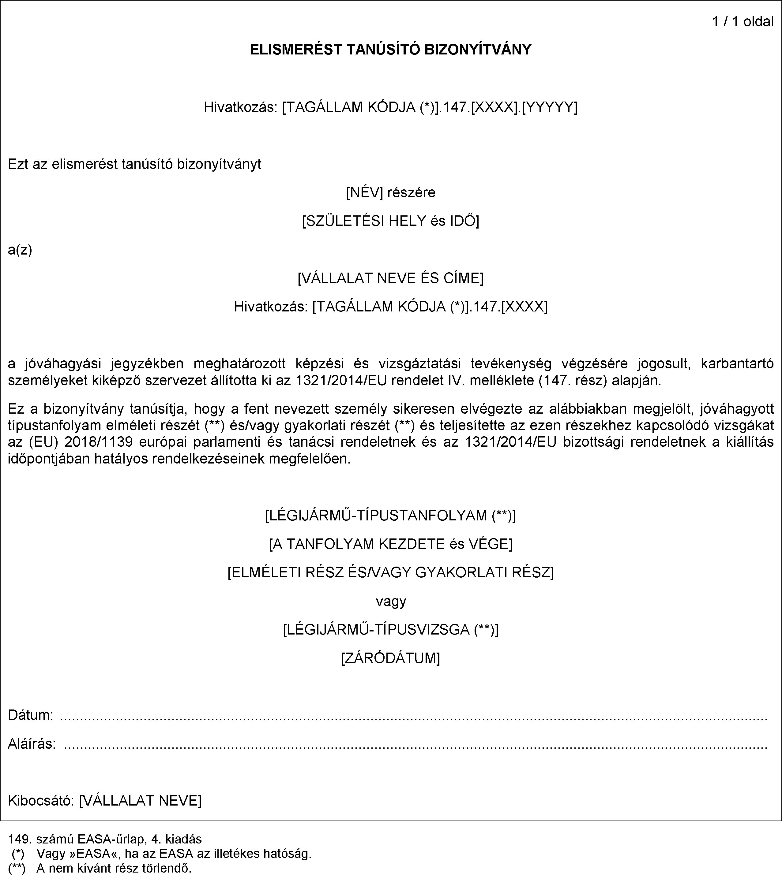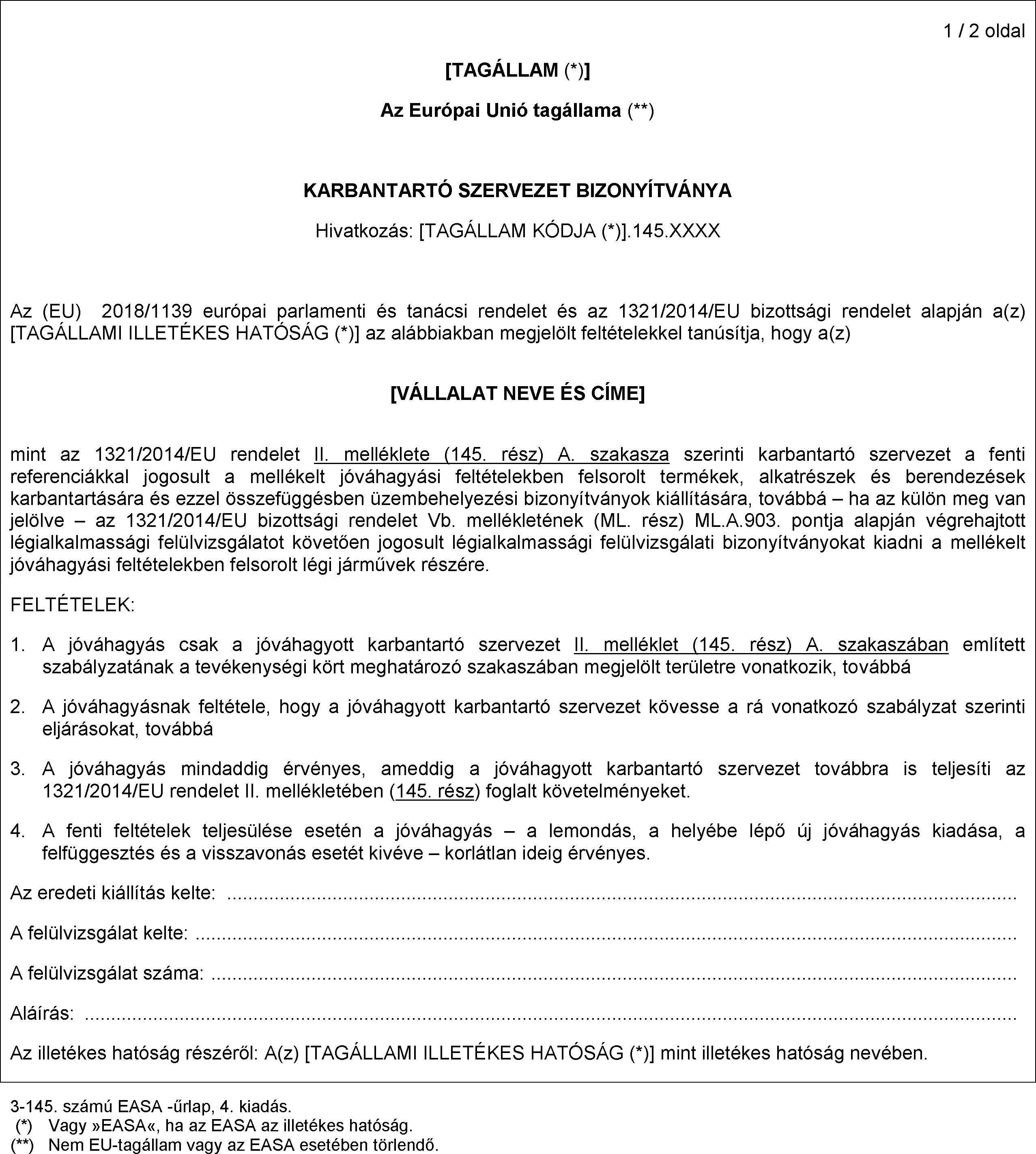 a) Ha az illetékes hatóság megállapította, hogy a kérelmező eleget tesz a CAO.B.45. pontnak, akkor az I. függelékben meghatározott és a jóváhagyás feltételeit tartalmazó 3. számú (CAO) EASA-űrlap felhasználásával kiállítja a bizonyítványt.
