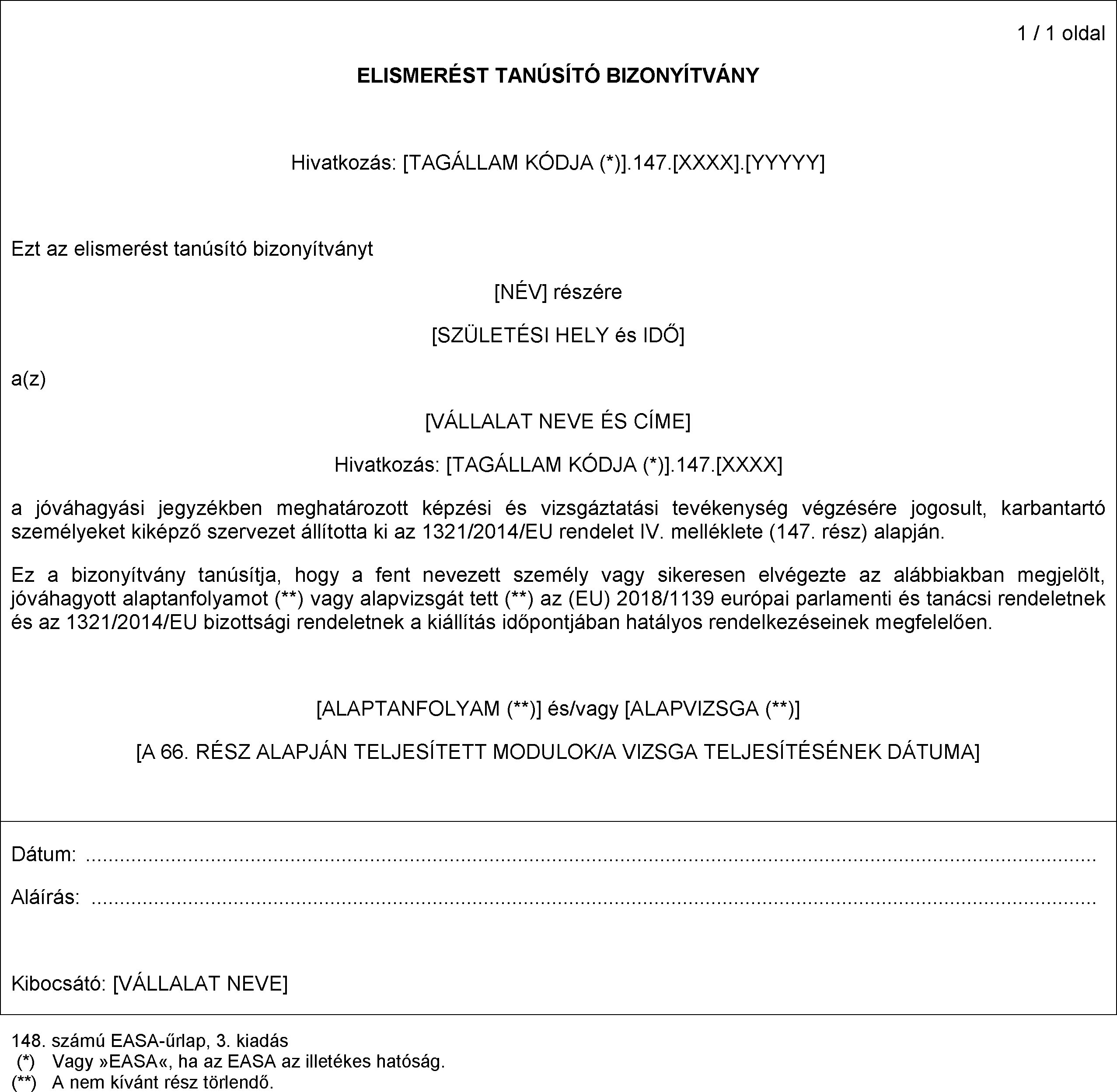 ( *1 ) A Bizottság 748/2012/EU rendelete (2012. augusztus 3.) a légi járművek és kapcsolódó termékek, alkatrészek és berendezések légialkalmassági és környezetvédelmi tanúsítása, valamint a tervező és gyártó szervezetek tanúsítása végrehajtási szabályainak megállapításáról (HL L 224., 2012.8.21., 1. o.)."