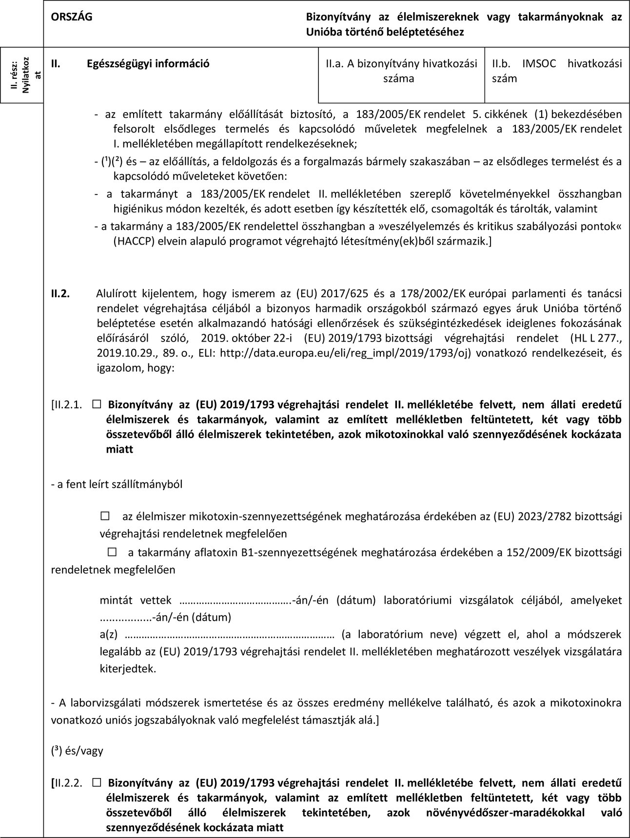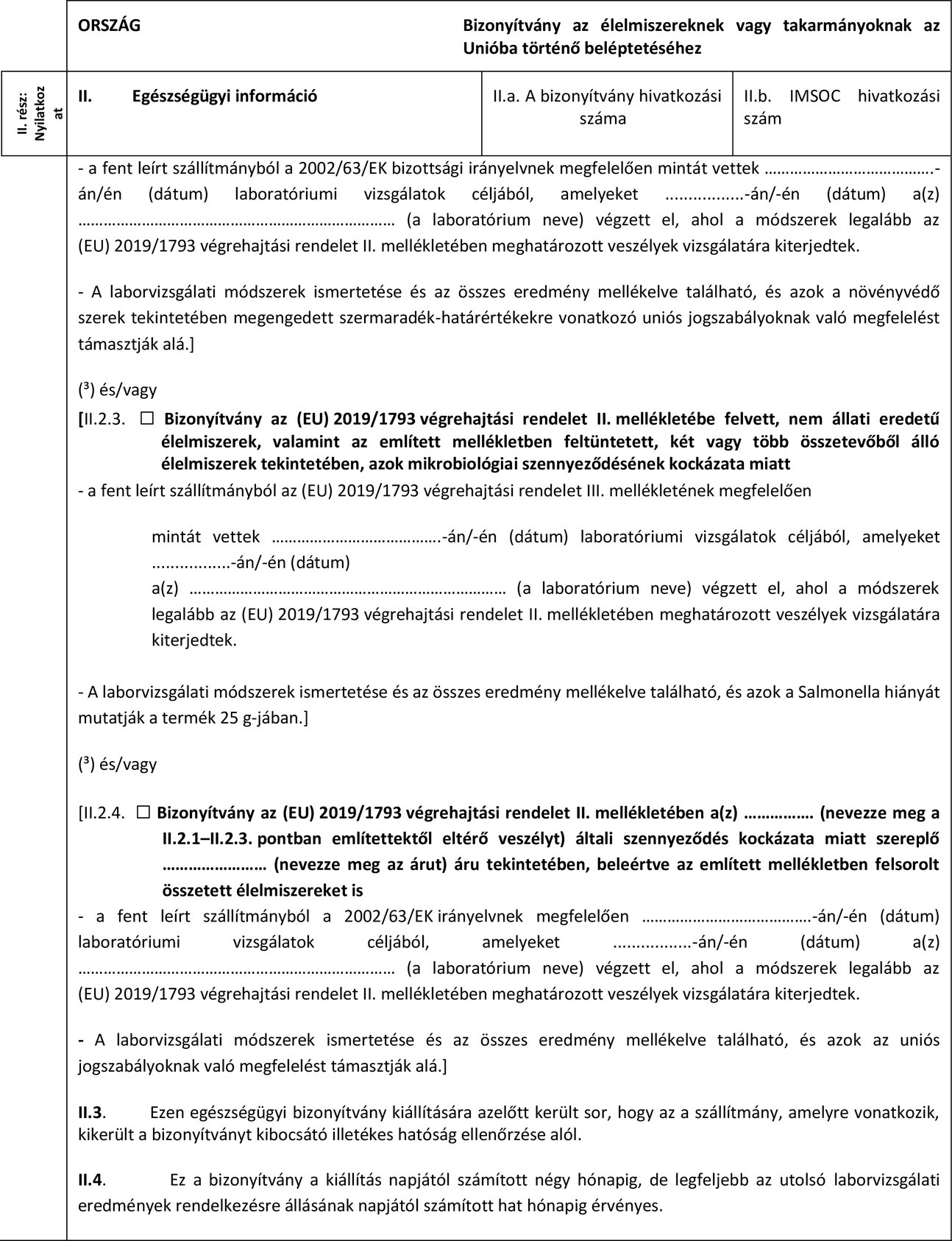 KITÖLTÉSI ÚTMUTATÓ AZ (EU) 2019/1793 BIZOTTSÁGI VÉGREHAJTÁSI RENDELET 11. CIKKÉBEN EMLÍTETT, AZ EGYES ÉLELMISZEREKNEK VAGY TAKARMÁNYOKNAK AZ EURÓPAI UNIÓBA TÖRTÉNŐ BELÉPTETÉSÉRE VONATKOZÓ HATÓSÁGI BIZONYÍTVÁNYMINTÁHOZ