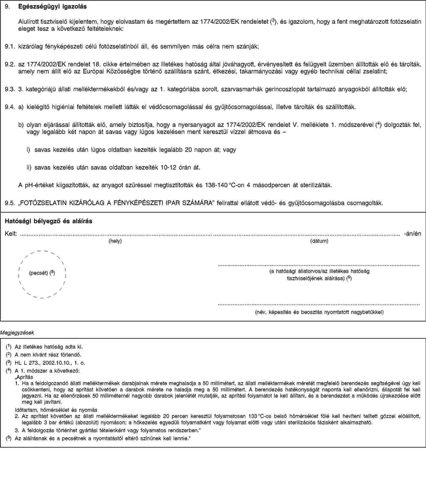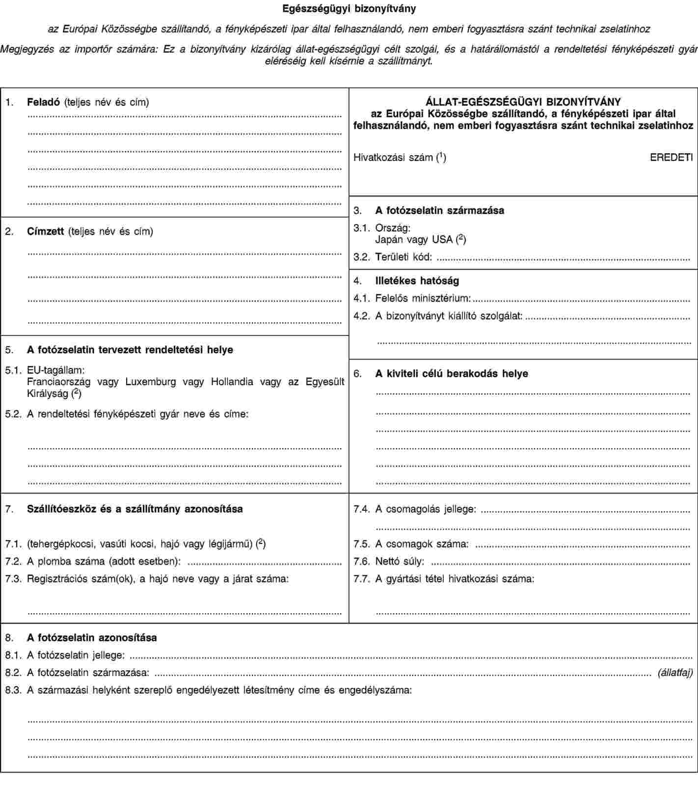 a) A fényképészeti ipar által felhasználandó technikai zselatin behozatalához az állat-egészségügyi bizonyítványokat az exportáló ország állítja ki az ezen III. mellékletben szereplő minta alapján. Tartalmazniuk kell az adott harmadik ország által előírt igazolásokat és adott esetben azokat a kiegészítő biztosítékokat, amelyeket az exportáló harmadik ország vagy annak egy része ír elő.