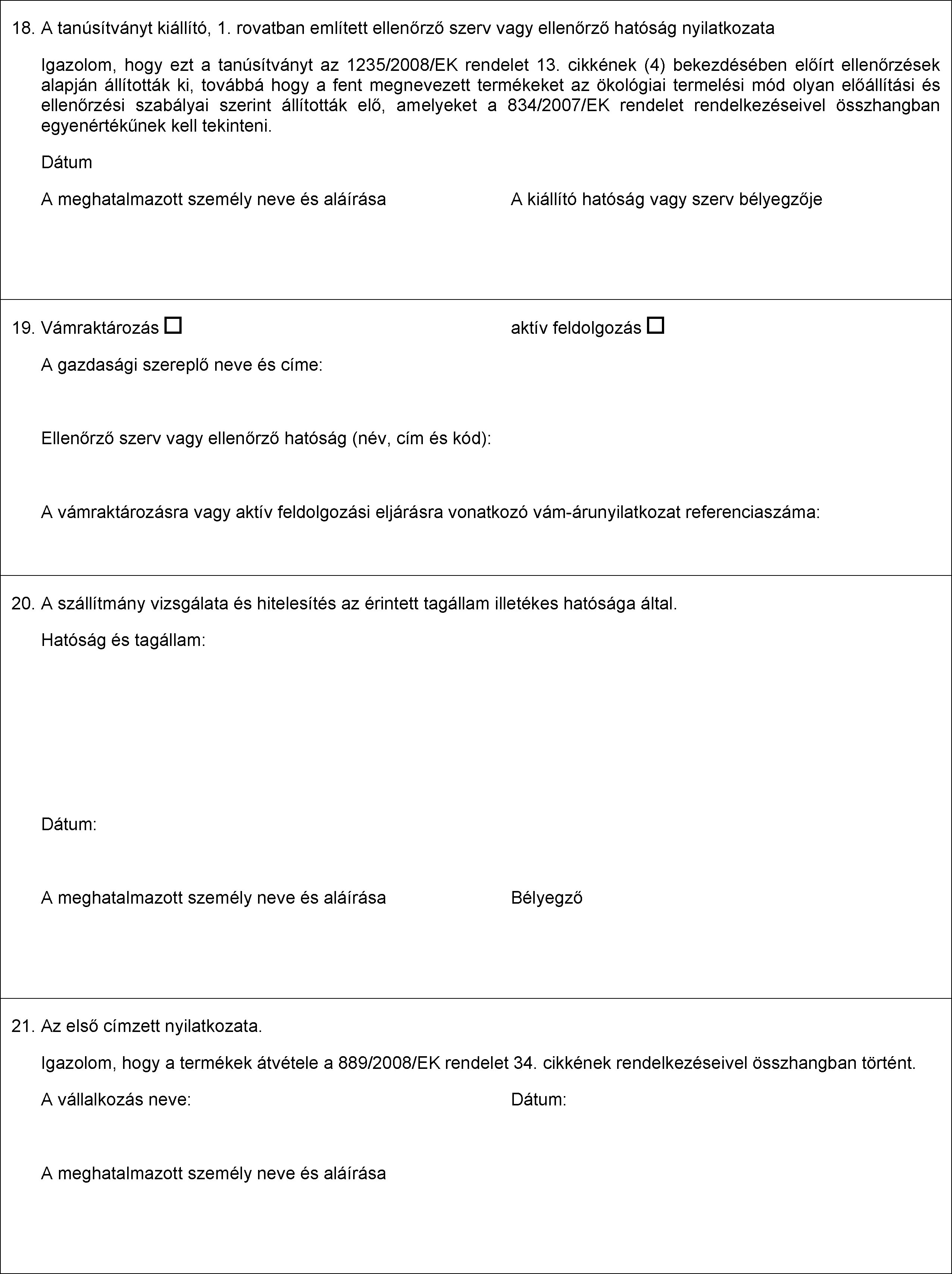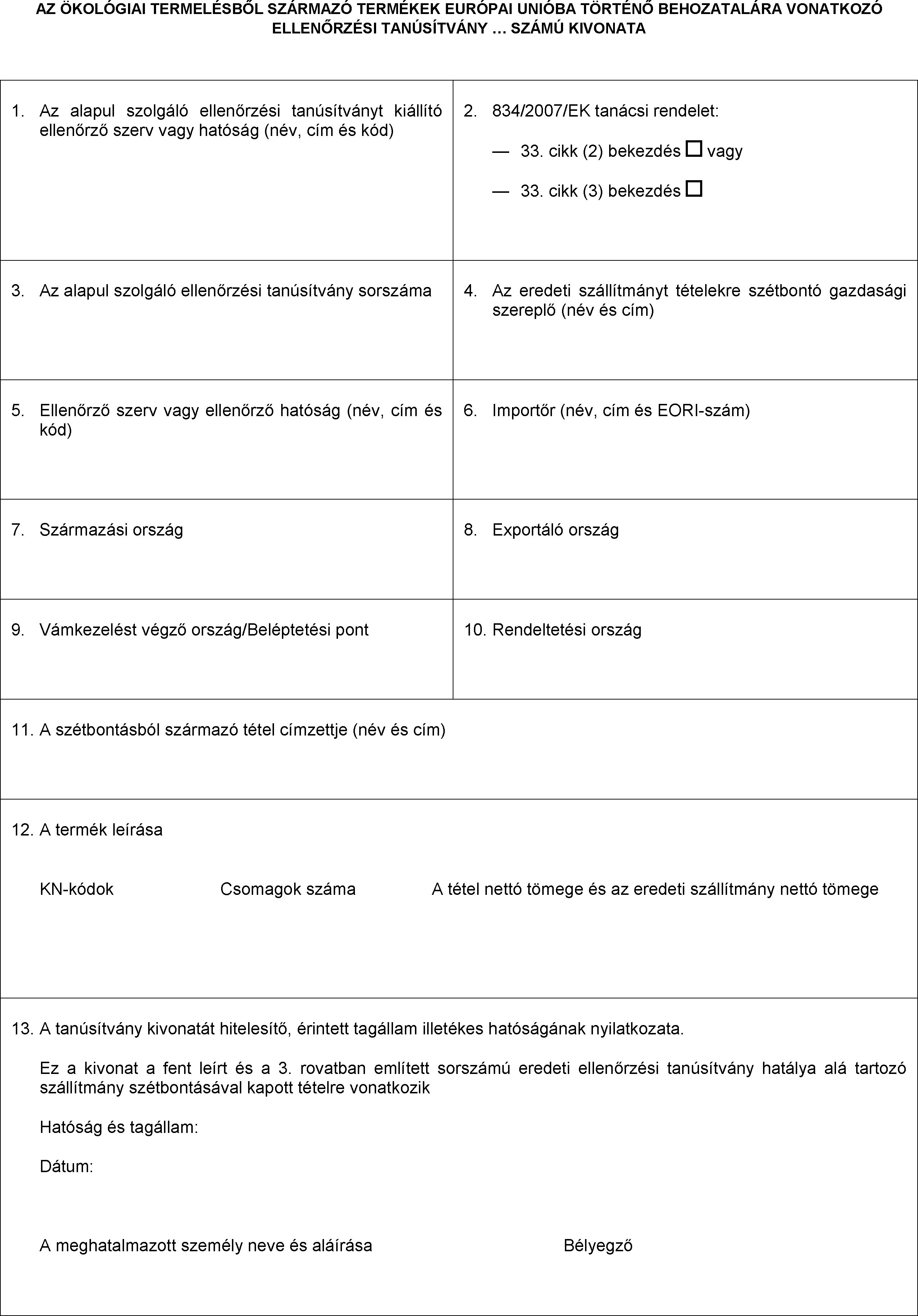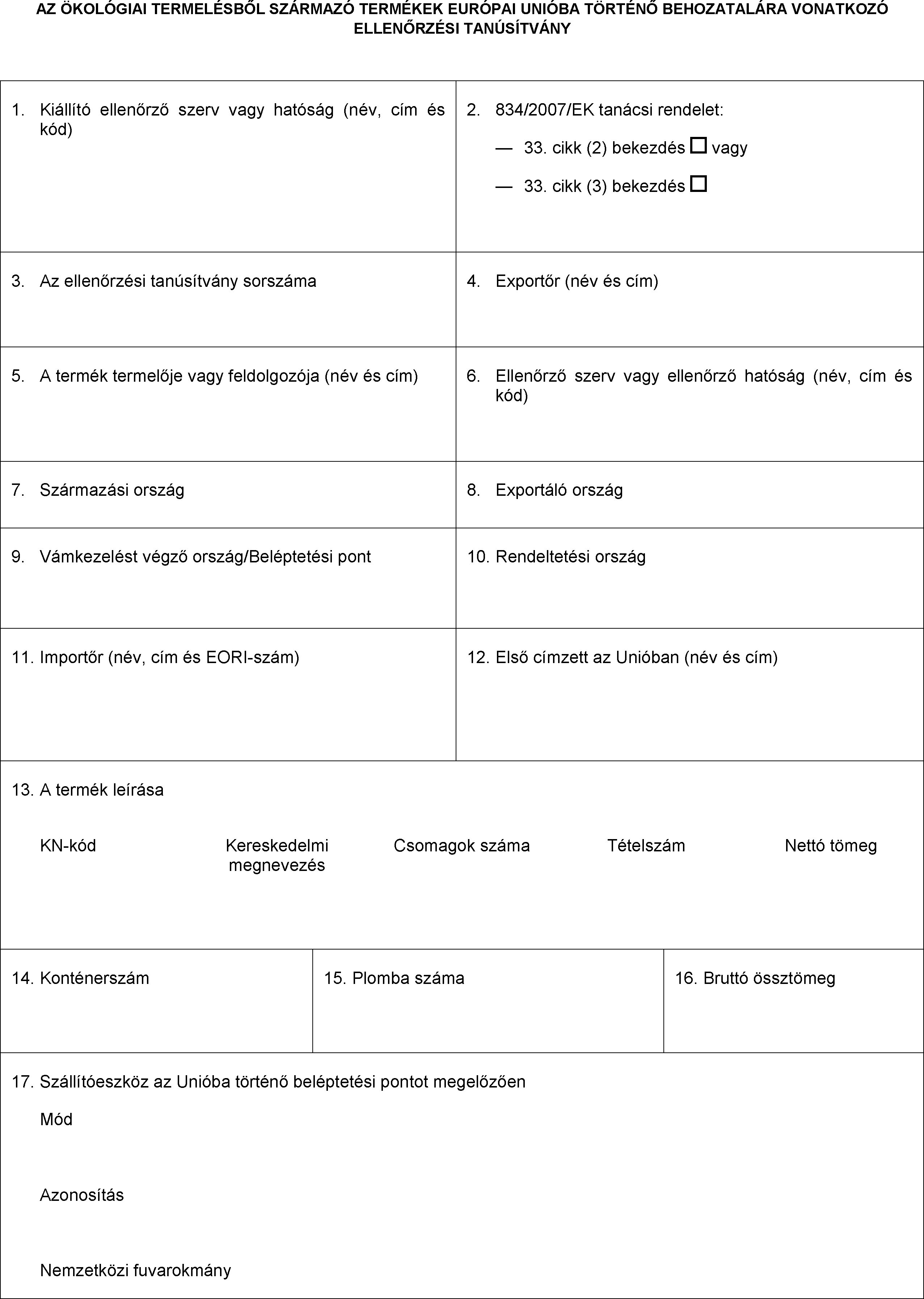 (1) A megfelelő termékek behozatala tekintetében a 834/2007/EK rendelet 32. cikke (1) bekezdésének c) pontja szerint előírt írásbeli igazolást e rendelet 17. cikkének (2) bekezdésével összhangban az e rendelet II. mellékletében található mintadokumentum alapján kell kiállítani és annak legalább az említett mintadokumentumban található valamennyi elemet tartalmaznia kell.
