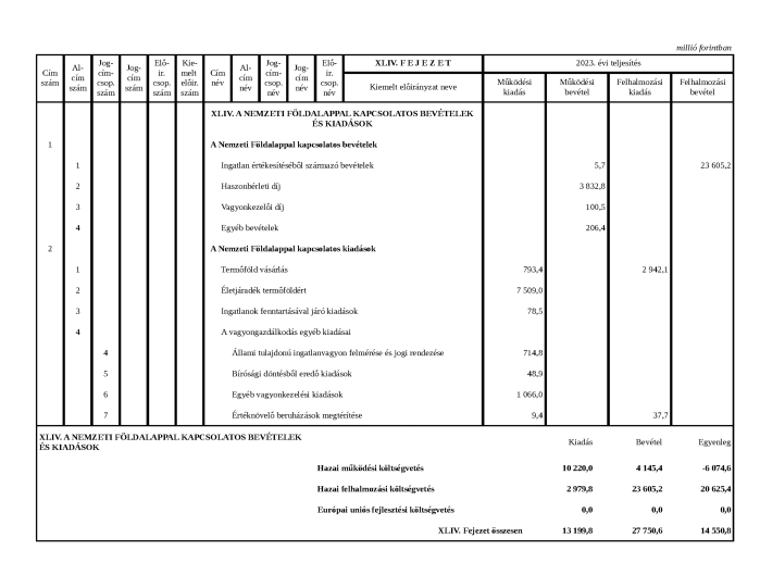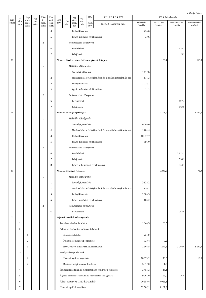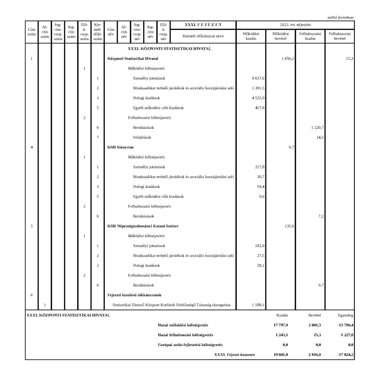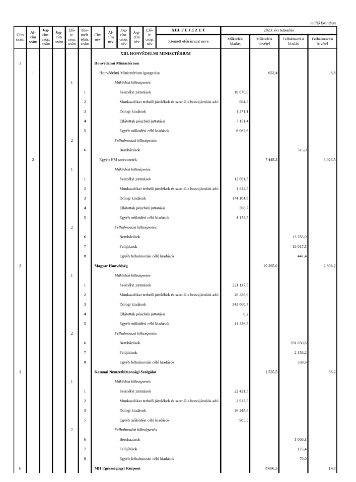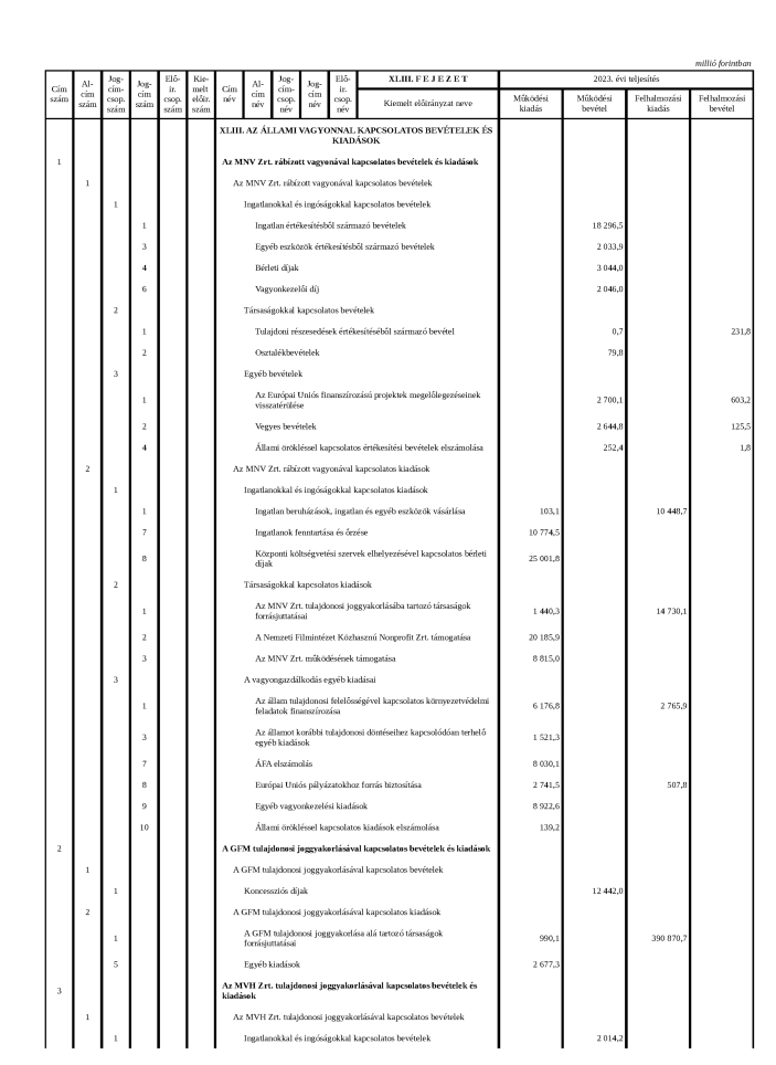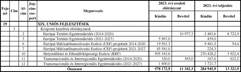 A központi alrendszer kiadási és bevételi előirányzatainak teljesítését az 1. melléklet tartalmazza a 2023. december 31-én fennálló besorolási rendnek megfelelően.