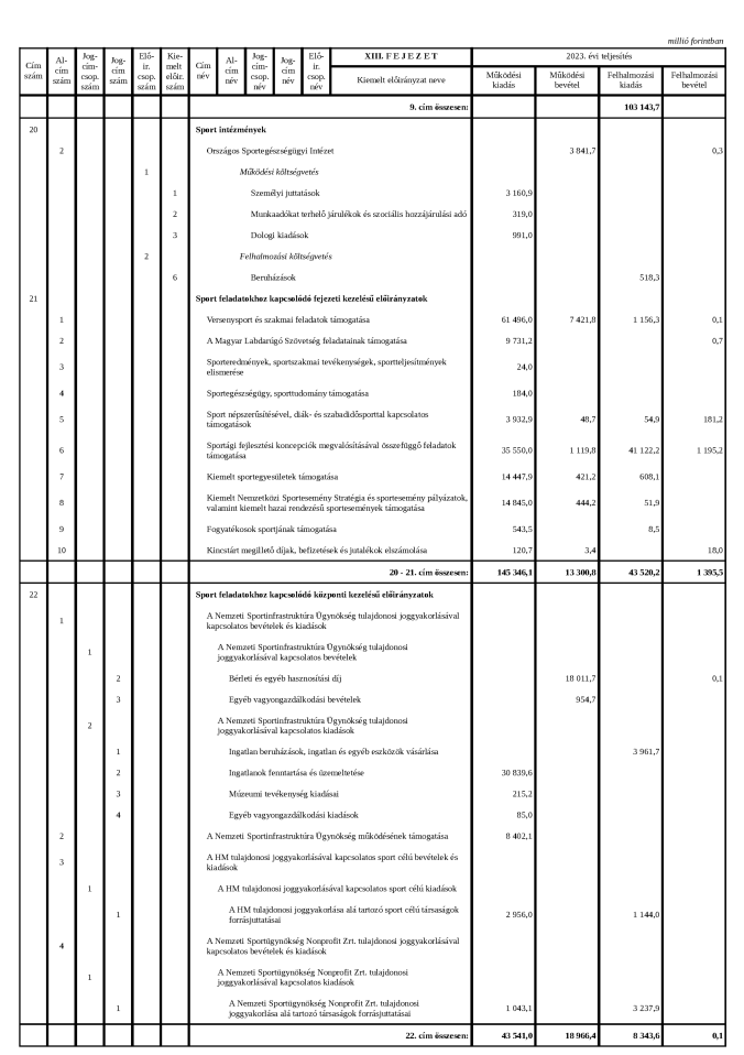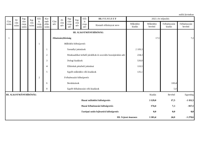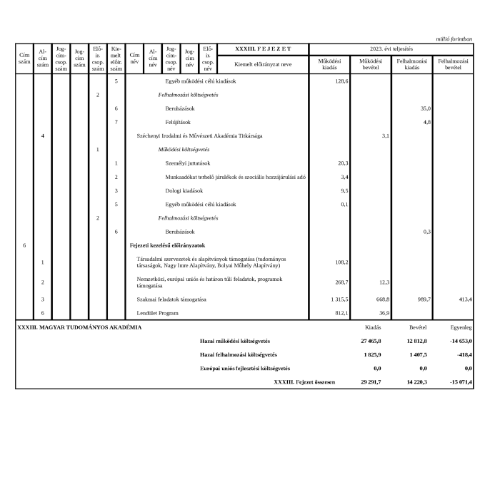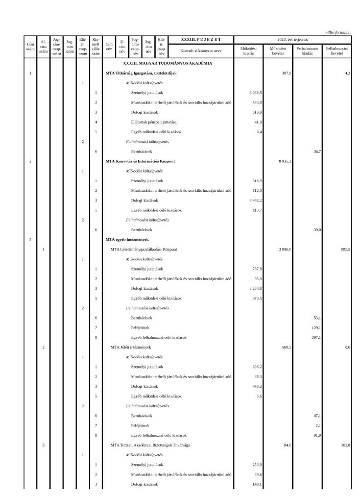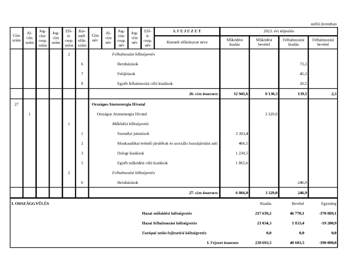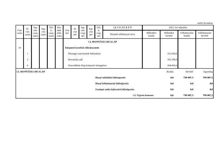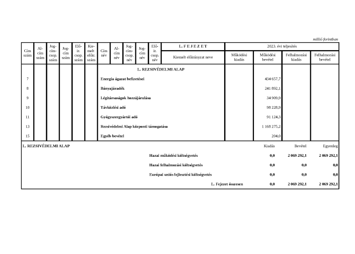 A központi alrendszer kiadási és bevételi előirányzatainak teljesítését az 1. melléklet tartalmazza a 2023. december 31-én fennálló besorolási rendnek megfelelően.
