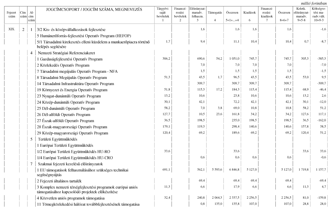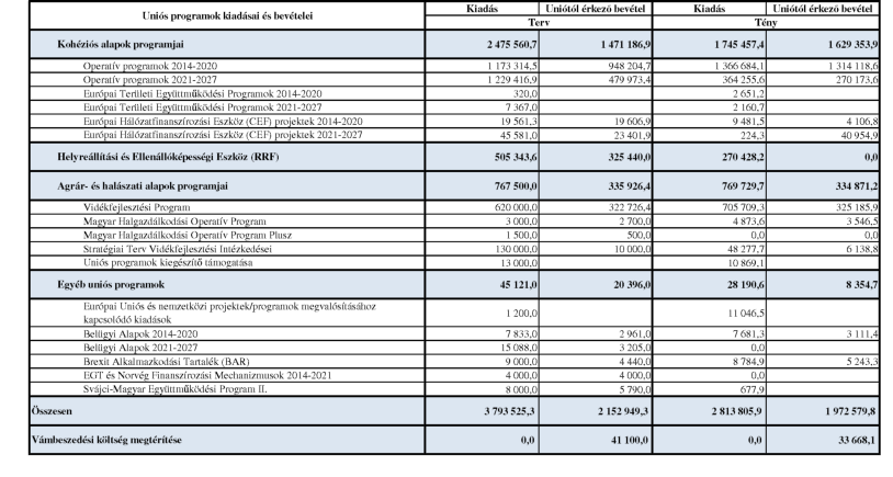 Uniós programok bevételei, hozzájárulás az EU költségvetéséhez