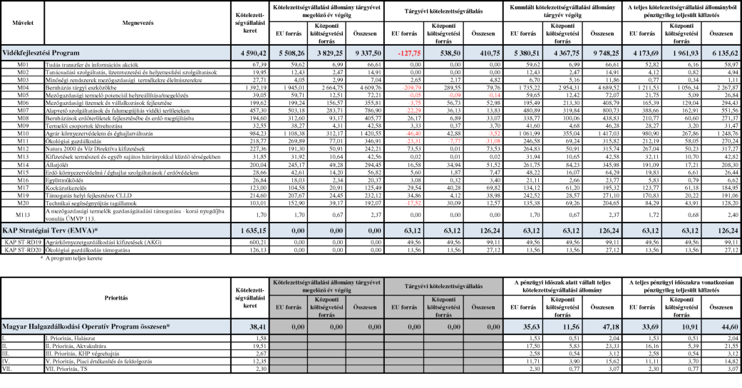 Agrár és halászati programok kötelezettségvállalási keretelőirányzatának és pénzügyi teljesülésének alakulása intézkedés szerinti bontásban